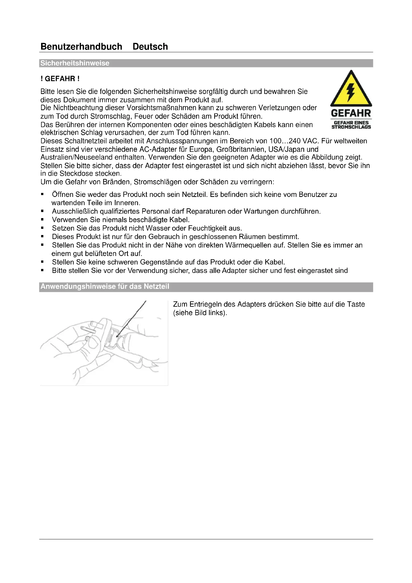- Try to connect the PC and display with a direct connection to ensure the video signal is present. Lindy regularly checks and tests our product range to ensure maximum compatibility and performance. For the most up to date version of this manual, please refer to your local Lindy website, search for the relevant part number and find the manual under Downloads.Benutzerhandbuch Deutsch Sicherheitshinweise ! GEFAHR ! Bitte lesen Sie die folgenden Sicherheitshinweise sorgfältig durch und bewahren Sie dieses Dokument immer zusammen mit dem Produkt auf. Die Nichtbeachtung dieser Vorsichtsmaßnahmen kann zu schweren Verletzungen oder zum Tod durch Stromschlag, Feuer oder Schäden am Produkt führen. Das Berühren der internen Komponenten oder eines beschädigten Kabels kann einen elektrischen Schlag verursachen, der zum Tod führen kann. Dieses Schaltnetzteil arbeitet mit Anschlussspannungen im Bereich von 100…240 VAC. Für weltweiten Einsatz sind vier verschiedene AC-Adapter für Europa, Großbritannien, USA/Japan und Australien/Neuseeland enthalten. Verwenden Sie den geeigneten Adapter wie es die Abbildung zeigt. Stellen Sie bitte sicher, dass der Adapter fest eingerastet ist und sich nicht abziehen lässt, bevor Sie ihn in die Steckdose stecken. Um die Gefahr von Bränden, Stromschlägen oder Schäden zu verringern: