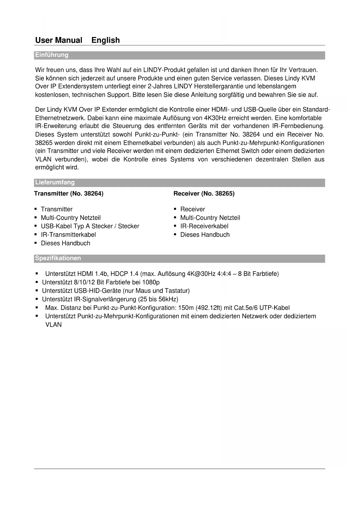 To create a point to multi point installation please be sure to use a dedicated Gigabit Ethernet Switch or a dedicated VLAN created on a Gigabit switch. To install a point to multi-point configuration please follow the steps in the previous section taking care to repeat all steps involving the receiver for each unit installed. Please Note: When using multiple Receivers and USB input devices in a point to multi-point configuration press and hold the USB button on any Receiver to gain control of the HDMI source device from that specific control console. IMPORTANT! As the extender uses the Broadcast protocol please ensure that you are using a dedicated network switch or a port based VLAN before connecting the extender, otherwise you may flood the network causing disruption for other connected devices. HDMI Cable USB Cable Cat.5e/6 Cable Control Console 1 Source Control Console 2 Transmitter (No.38264) Transmitter (No.38264) Transmitter (No.38264) Transmitter (No.38264) Transmitter (No.38264) Receiver (No.38265) Receiver (No.38265) Ethernet Gigabit Switch (i.e. No.25047 - Not Included)User Manual English Troubleshooting There is no display on the screen. Check that the DC plug and jack used by the external power supply are firmly connected. Check that the Cat.5e/6 or higher cable is plugged in correctly and that the Status LED is flashing slowly. Check that the HDMI source and display are both powered on and active. Power off all the devices, then power on in this order: first, the Transmitter and Receivers, then the display and finally the source. For some HDMI devices it may be helpful to unplug and re-plug their HDMI connection to re-initiate the HDMI handshake and recognition. Reduce the length of HDMI cable used, or use a higher quality cable. Please refer to the Specification section for the maximum distance/resolution/cable combinations. Check no other IP device is generating traffic on the same network dedicated to the extender system. USB Keyboard or mouse are not working Check that the DC plug and jack used by external power supply are firmly connected. Check that the CAT5e/6 or higher cable is plugged in correctly and that the Status LED is flashing slowly. Check that the USB keyboard and mouse work correctly when connected directly to the source device. If you are using wireless USB devices, please replace them with wired devices.User Manual English Einführung Wir freuen uns, dass Ihre Wahl auf ein LINDY-Produkt gefallen ist und danken Ihnen für Ihr Vertrauen. Sie können sich jederzeit auf unsere Produkte und einen guten Service verlassen. Dieses Lindy KVM Over IP Extendersystem unterliegt einer 2-Jahres LINDY Herstellergarantie und lebenslangem kostenlosen, technischen Support. Bitte lesen Sie diese Anleitung sorgfältig und bewahren Sie sie auf. Der Lindy KVM Over IP Extender ermöglicht die Kontrolle einer HDMI- und USB-Quelle über ein Standard- Ethernetnetzwerk. Dabei kann eine maximale Auflösung von 4K30Hz erreicht werden. Eine komfortable IR-Erweiterung erlaubt die Steuerung des entfernten Geräts mit der vorhandenen IR-Fernbedienung. Dieses System unterstützt sowohl Punkt-zu-Punkt- (ein Transmitter No. 38264 und ein Receiver No. 38265 werden direkt mit einem Ethernetkabel verbunden) als auch Punkt-zu-Mehrpunkt-Konfigurationen (ein Transmitter und viele Receiver werden mit einem dedizierten Ethernet Switch oder einem dedizierten VLAN verbunden), wobei die Kontrolle eines Systems von verschiedenen dezentralen Stellen aus ermöglicht wird. Lieferumfang Transmitter (No. 38264) Transmitter Multi-Country Netzteil USB-Kabel Typ A Stecker / Stecker IR-Transmitterkabel Dieses Handbuch Receiver (No. 38265) Receiver Multi-Country Netzteil IR-Receiverkabel Dieses Handbuch Spezifikationen Unterstützt HDMI 1.4b, HDCP 1.4 (max. Auflösung 4K@30Hz 4:4:4 – 8 Bit Farbtiefe) Unterstützt 8/10/12 Bit Farbtiefe bei 1080p Unterstützt USB-HID-Geräte (nur Maus und Tastatur) Unterstützt IR-Signalverlängerung (25 bis 56kHz) Max. Distanz bei Punkt-zu-Punkt-Konfiguration: 150m (492.12ft) mit Cat.5e/6 UTP-Kabel Unterstützt Punkt-zu-Mehrpunkt-Konfigurationen mit einem dedizierten Netzwerk oder dediziertem VLANBenutzerhandbuch Deutsch Überblick No. 38264 – Transmitter