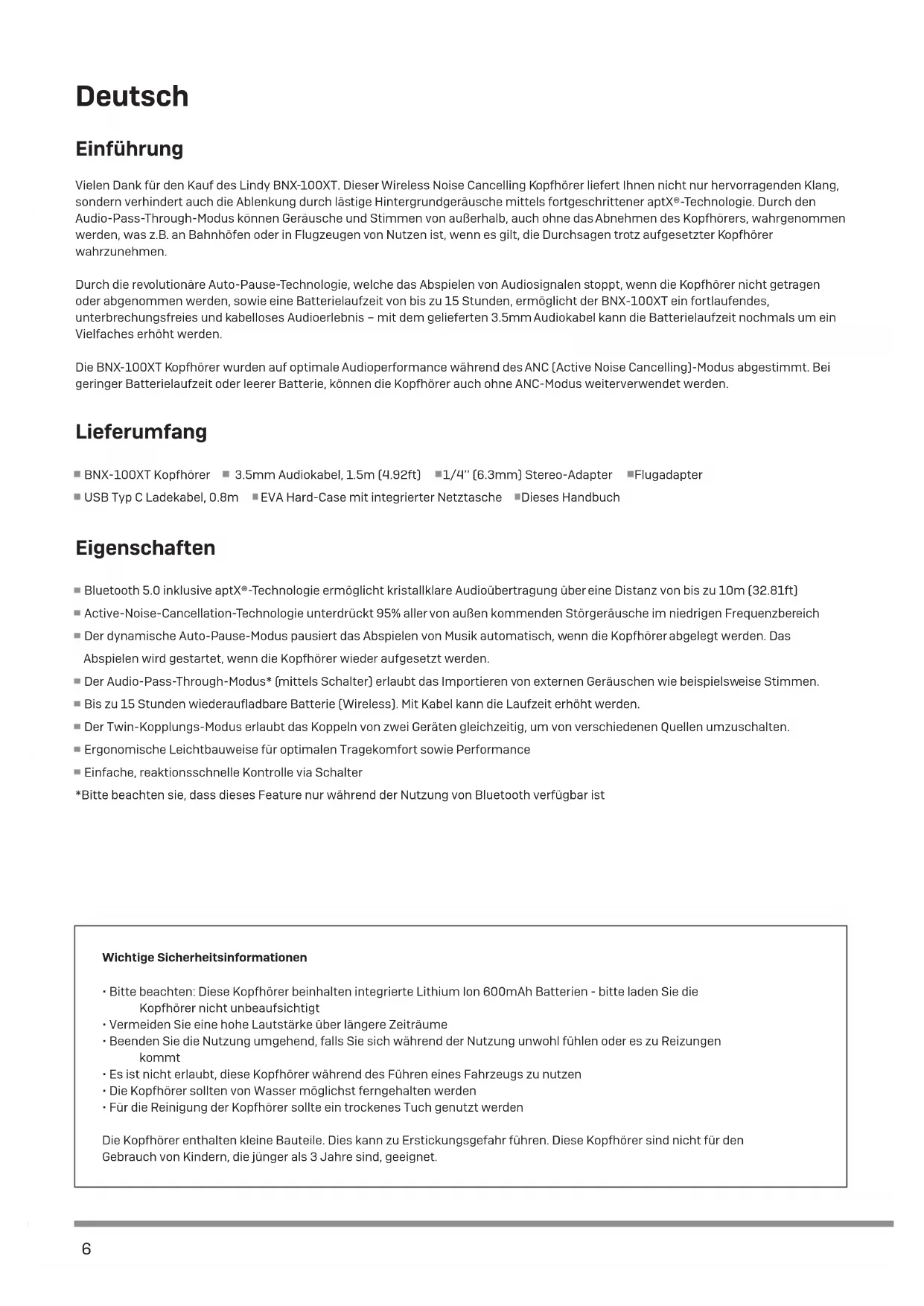 2. While the first device is connected, switch on the Wireless function again by pressing and holding the Multi-Function Button (7). While the LED blinks blue and red, connect the second device by selecting BNX-100XT in your device’s Bluetooth list. 3. As this will automatically un-pair the first device, re-connect by manually selecting BNX-100XT in your source devices Bluetooth list. The headphones do not need to be in pairing mode. 4. Both devices will now be connected to the headphones simultaneously. If the first device’s audio is paused, the second device will continue playing audio. If taking a phone call on the first device, please pause the second device and the headphones will automatically connect to the first device. Please note: If the audio quality is poor or a crackling noise can be heard, the Bluetooth connection is weak. Please ensure the device and BNX-100XTs are within range of each other with no major obstacles. Wired Operation The BNX-100XTs can also be connected with a wired connection using the 3.5mm audio cable included with the headphones. This will also prolong the battery life when using active noise cancelling. Please see the Technical Specifications section below for approximate battery life times. Wearing the BNX-100XTs For a comfortable listening experience, the headband of the headphones can be adjusted easily by sliding upward or downward.6 Deutsch Einführung Vielen Dank für den Kauf des Lindy BNX-100XT. Dieser Wireless Noise Cancelling Kopfhörer liefert Ihnen nicht nur hervorragenden Klang, sondern verhindert auch die Ablenkung durch lästige Hintergrundgeräusche mittels fortgeschrittener aptX®-Technologie. Durch den Audio-Pass-Through-Modus können Geräusche und Stimmen von außerhalb, auch ohne das Abnehmen des Kopfhörers, wahrgenommen werden, was z.B. an Bahnhöfen oder in Flugzeugen von Nutzen ist, wenn es gilt, die Durchsagen trotz aufgesetzter Kopfhörer wahrzunehmen. Durch die revolutionäre Auto-Pause-Technologie, welche das Abspielen von Audiosignalen stoppt, wenn die Kopfhörer nicht getragen oder abgenommen werden, sowie eine Batterielaufzeit von bis zu 15 Stunden, ermöglicht der BNX-100XT ein fortlaufendes, unterbrechungsfreies und kabelloses Audioerlebnis – mit dem gelieferten 3.5mm Audiokabel kann die Batterielaufzeit nochmals um ein Vielfaches erhöht werden. Die BNX-100XT Kopfhörer wurden auf optimale Audioperformance während des ANC (Active Noise Cancelling)-Modus abgestimmt. Bei geringer Batterielaufzeit oder leerer Batterie, können die Kopfhörer auch ohne ANC-Modus weiterverwendet werden. Lieferumfang BNX-100XT Kopfhörer 3.5mm Audiokabel, 1.5m (4.92ft) 1/4’’ (6.3mm) Stereo-Adapter Flugadapter USB Typ C Ladekabel, 0.8m EVA Hard-Case mit integrierter Netztasche Dieses Handbuch Eigenschaften Bluetooth 5.0 inklusive aptX®-Technologie ermöglicht kristallklare Audioübertragung über eine Distanz von bis zu 10m (32.81ft) Active-Noise-Cancellation-Technologie unterdrückt 95% aller von außen kommenden Störgeräusche im niedrigen Frequenzbereich Der dynamische Auto-Pause-Modus pausiert das Abspielen von Musik automatisch, wenn die Kopfhörer abgelegt werden. Das Abspielen wird gestartet, wenn die Kopfhörer wieder aufgesetzt werden. Der Audio-Pass-Through-Modus* (mittels Schalter) erlaubt das Importieren von externen Geräuschen wie beispielsweise Stimmen. Bis zu 15 Stunden wiederaufladbare Batterie (Wireless). Mit Kabel kann die Laufzeit erhöht werden. Der Twin-Kopplungs-Modus erlaubt das Koppeln von zwei Geräten gleichzeitig, um von verschiedenen Quellen umzuschalten. Ergonomische Leichtbauweise für optimalen Tragekomfort sowie Performance Einfache, reaktionsschnelle Kontrolle via Schalter *Bitte beachten sie, dass dieses Feature nur während der Nutzung von Bluetooth verfügbar ist Wichtige Sicherheitsinformationen