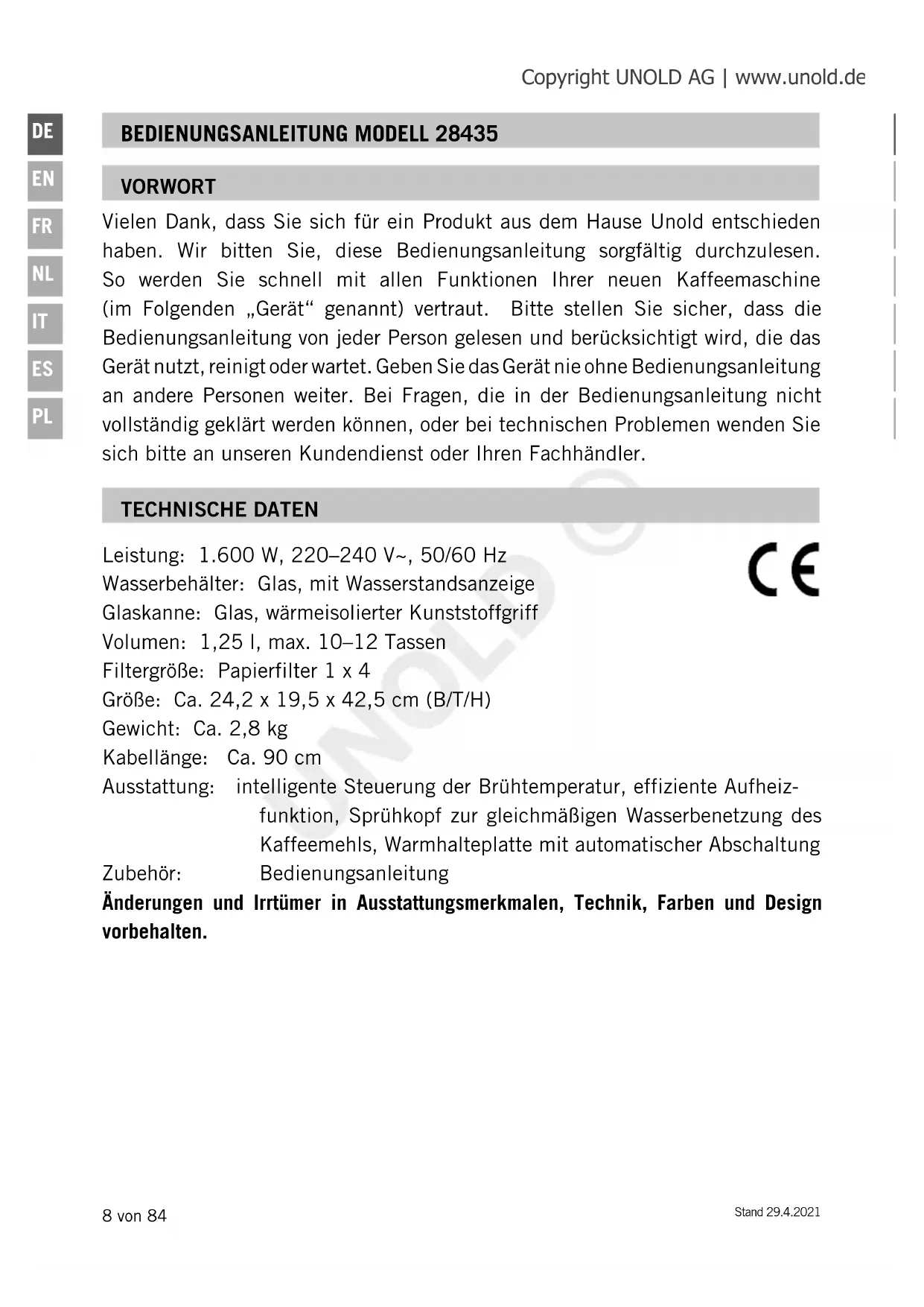 Leistung: 1.600 W, 220–240 V~, 50/60 Hz Wasserbehälter: Glas, mit Wasserstandsanzeige Glaskanne: Glas, wärmeisolierter Kunststoffgriff Volumen: 1,25 l, max. 10–12 Tassen Filtergröße: Papierfilter 1 x 4 Größe: Ca. 24,2 x 19,5 x 42,5 cm (B/T/H) Gewicht: Ca. 2,8 kg Kabellänge: Ca. 90 cm Ausstattung: intelligente Steuerung der Brühtemperatur, effiziente Aufheiz- funktion, Sprühkopf zur gleichmäßigen Wasserbenetzung des Kaffeemehls, Warmhalteplatte mit automatischer Abschaltung Zubehör: Bedienungsanleitung Änderungen und Irrtümer in Ausstattungsmerkmalen, Technik, Farben und Design vorbehalten. BEDIENUNGSANLEITUNG MODELL 28435 TECHNISCHE DATEN VORWORT Vielen Dank, dass Sie sich für ein Produkt aus dem Hause Unold entschieden haben. Wir bitten Sie, diese Bedienungsanleitung sorgfältig durchzulesen. So werden Sie schnell mit allen Funktionen Ihrer neuen Kaffeemaschine (im Folgenden „Gerät“ genannt) vertraut. Bitte stellen Sie sicher, dass die Bedienungsanleitung von jeder Person gelesen und berücksichtigt wird, die das Gerät nutzt, reinigt oder wartet. Geben Sie das Gerät nie ohne Bedienungsanleitung an andere Personen weiter. Bei Fragen, die in der Bedienungsanleitung nicht vollständig geklärt werden können, oder bei technischen Problemen wenden Sie sich bitte an unseren Kundendienst oder Ihren Fachhändler. Copyright UNOLD AG | www.unold.de UNOLD ©Stand 29.4.2021 9 von 84