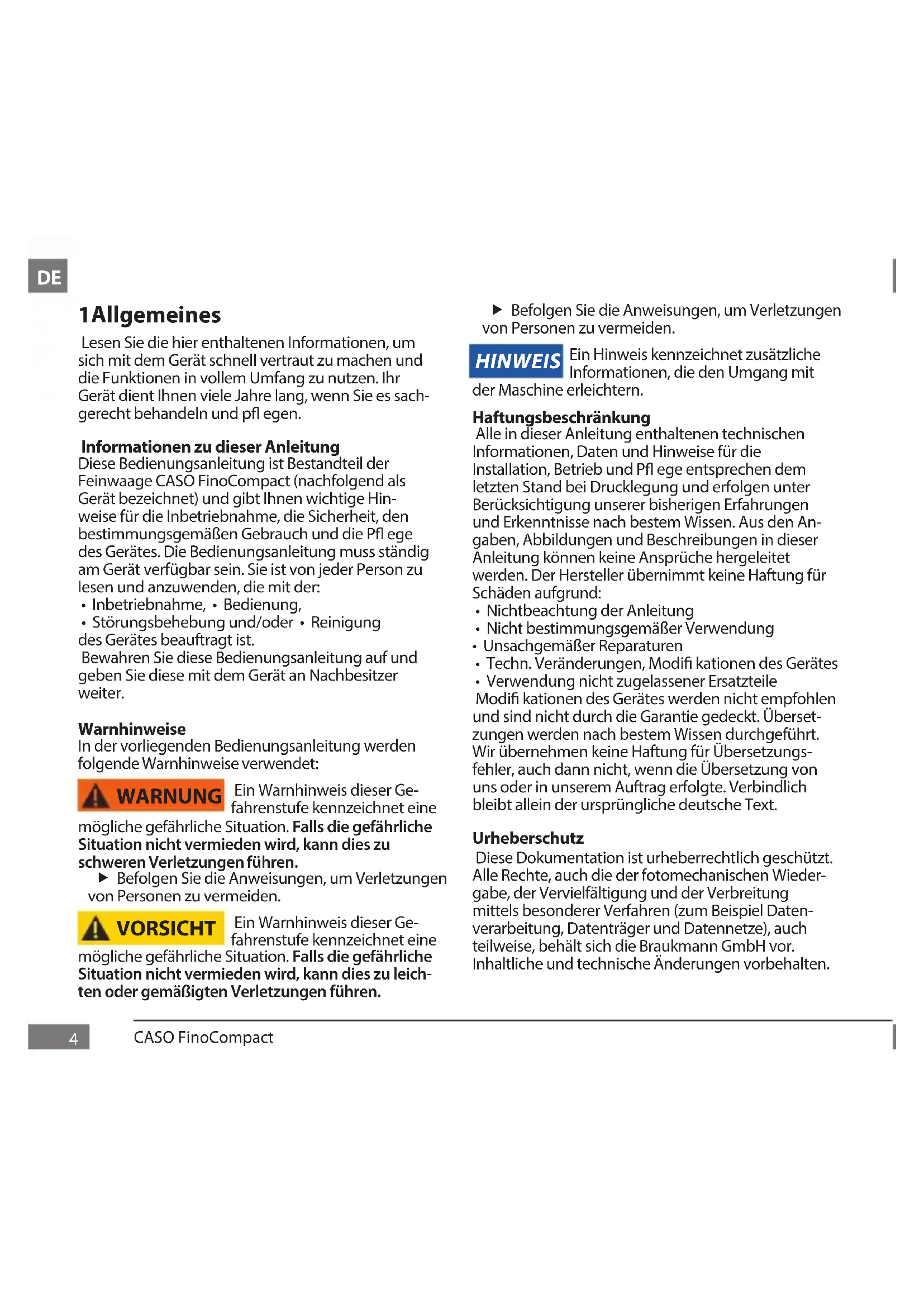 CASO FinoCompact CASO FinoCompact 1 Allgemeines Lesen Sie die hier enthaltenen Informationen, um sich mit dem Gerät schnell vertraut zu machen und die Funktionen in vollem Umfang zu nutzen. Ihr Gerät dient Ihnen viele Jahre lang, wenn Sie es sach- gerecht behandeln und p egen. Informationen zu dieser Anleitung Diese Bedienungsanleitung ist Bestandteil der Feinwaage CASO FinoCompact (nachfolgend als Gerät bezeichnet) und gibt Ihnen wichtige Hin- weise für die Inbetriebnahme, die Sicherheit, den bestimmungsgemäßen Gebrauch und die P ege des Gerätes. Die Bedienungsanleitung muss ständig am Gerät verfügbar sein. Sie ist von jeder Person zu lesen und anzuwenden, die mit der: