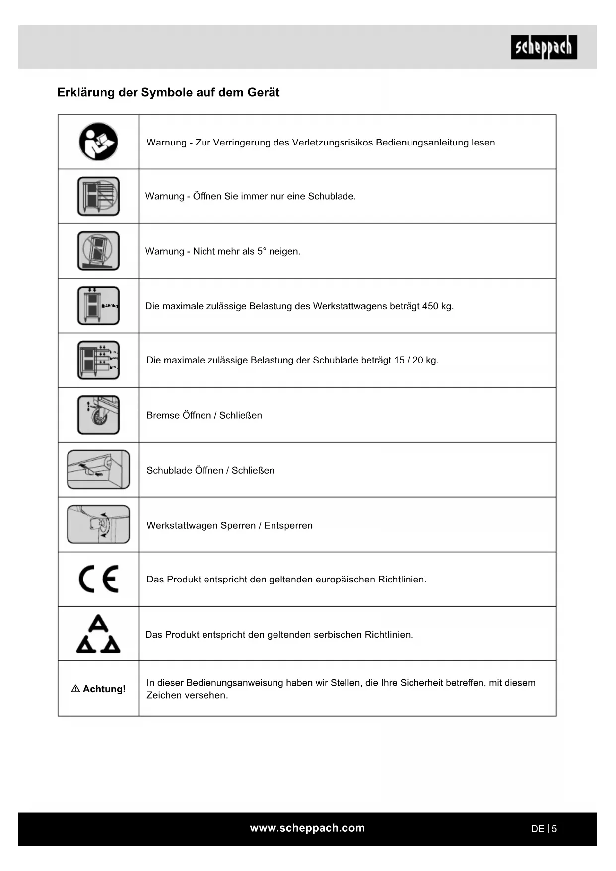 Erklärung der Symbole auf dem Gerät Warnung - Zur Verringerung des Verletzungsrisikos Bedienungsanleitung lesen. Warnung - Önen Sie immer nur eine Schublade. Warnung - Nicht mehr als 5° neigen. 450kg Die maximale zulässige Belastung des Werkstattwagens beträgt 450 kg. 15kg 20kg 20kg Die maximale zulässige Belastung der Schublade beträgt 15 / 20 kg. Bremse Önen / Schließen Schublade Önen / Schließen Werkstattwagen Sperren / Entsperren Das Produkt entspricht den geltenden europäischen Richtlinien. Das Produkt entspricht den geltenden serbischen Richtlinien. m Achtung! In dieser Bedienungsanweisung haben wir Stellen, die Ihre Sicherheit betreen, mit diesem Zeichen versehen.www.scheppach.com