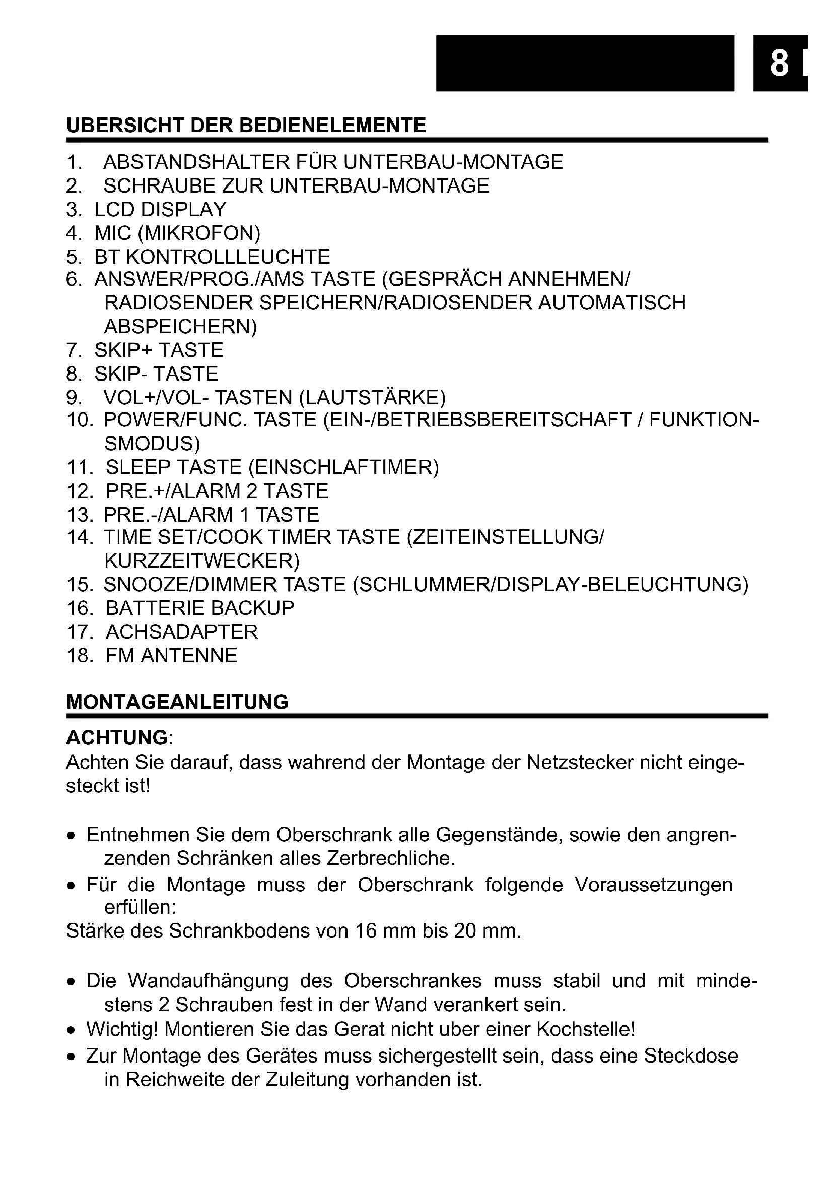 MONTAGEANLEITUNG ACHTUNG: Achten Sie darauf, dass wahrend der Montage der Netzstecker nicht einge- steckt ist!