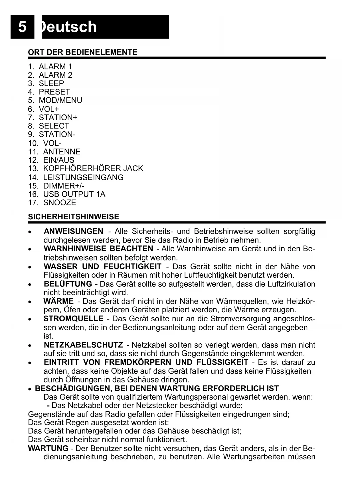- BESCHÄDIGUNGEN, BEI DENEN WARTUNG ERFORDERLICH IST Das Gerät sollte von qualifiziertem Wartungspersonal gewartet werden, wenn: - Das Netzkabel oder der Netzstecker beschädigt wurde; Gegenstände auf das Radio gefallen oder Flüssigkeiten eingedrungen sind; Das Gerät Regen ausgesetzt worden ist; Das Gerät heruntergefallen oder das Gehäuse beschädigt ist; Das Gerät scheinbar nicht normal funktioniert. WARTUNG - Der Benutzer sollte nicht versuchen, das Gerät anders, als in der Be- dienungsanleitung beschrieben, zu benutzen. Alle Wartungsarbeiten müssen6 Deutsch von qualifizierten Servicemitarbeitern durchgeführt werden Hinweis: Wenn das Display funktioniert nicht ordnungsgemäß oder reagiert nicht auf die Betätigung der Kontrolle, aufgrund einer elektrostatischen Entladung. Zie- hen Sie das Netzkabel und entfernen Sie die Batterien, dann und schließen Sie die Stromversorgung einige Sekunden später wieder an. STROMQUELLEN WECHSELSTROM: Sie können Ihr tragbares Stereosystem mit Strom versorgen, in- die Steckdose an der Wand stecken. Prüfen Sie, dass die Nennspannung des Geräts mit Ihrer lokalen Spannung übereinstimmt. Einschalten: Drücken Sie [POWER] (12) auf der Rückseite des Radios, um es ein- o- der auszuschalten. EINSTELLUNGEN Modi auswählen: Drücken Sie [MODUS/MENÜ] (5), um die Modi DAB oder FM zu wählen. Einstellung der Lautstärke: Einstellen der Lautstärke mit [VOL+/-] (6/10), um die Laut- stärke zu erhöhen oder zu verringern. Auswahl der Sender: Drücken Sie im DAB-Modus die Taste [STAT+/-] (7/9), um die Sender zu durchsuchen, und drücken Sie zur Bestätigung die Taste [SEL] (8). Im FM- Modus halten Sie die Taste [STAT+/-] (7/9) gedrückt, um Sender zu suchen. Oder verwenden Sie die Taste [Preset] (4), um auf die gespeicherten voreingestellten Sen- der zuzugreifen. Schlummerfunktion: Drücken Sie auf die Oberseite des Radios, um den Wecker in den Schlummermodus zu versetzen. Der Wecker ertönt erneut, sobald die Schlum- merzeit verstrichen ist. UHR-EINSTELLUNG Die Zeit wird automatisch aktualisiert. Wenn Sie die Zeit manuell einstellen möchten, lesen Sie die Anweisungen weiter un- ten: Einschalten im FM- oder DAB-Modus; Halten Sie die [MODUS] Taste (5) gedrückt, um das Systemmenü aufzurufen, und wählen Sie ZEIT>ZEIT EINSTELLEN mit der [STAT- oder +]-Taste (9/7) und der [AUSWAHL]-Taste (8); Drücken Sie die [STAT- oder +] Tasten (7/9) zur Einstellung der gewünschten Zeit (HH:MM), um Stunde und Minuten einzustellen, und bestätigen Sie mit der [SELECT] Taste (8); Drücken Sie die Tasten [STAT- / +] (7/9) zur Einstellung des gewünschten Datums (TT-MM-JJJ), um das Datum einzustellen, und bestätigen Sie mit der Taste [SELECT] (8); Wenn die Einstellung abgeschlossen ist, Press Alarm 1 or 2, and press [STAT+/-] (7/9) to cancel. ALARMEINSTELLUNG Im Radio-Modus: Drücken Sie die Taste [ALARM 1 oder 2] (1/2), und drücken Sie [SELECT] (8) zur Bestätigung. Die Anzeige beginnt zu blinken: "HH:MM";7 Deutsch Drücken Sie die [STAT- / +] Taste (7/9), um die gewünschte Zeit einzustellen, und drücken Sie dann [SELECT] (8) zur Bestätigung; Drücken Sie [STAT- / +] (7/9), um den gewünschten Alarmmodus (Summer oder Ra- dio) einzustellen, und drücken Sie dann [SELECT] (8) zur Bestätigung; Wenn RADIO gewählt wurde, drücken Sie [STAT- / +] (7/9), um einen Sender auszu- wählen, der geweckt werden soll Drücken Sie die Tasten [STAT- / +] (7/9), um die gewünschte Lautstärke des Alarms einzustellen, und drücken Sie dann [SELECT] (8) zur Bestätigung; Drücken Sie die [STAT- / +] Tasten (7/9), um den Alarm ein- oder auszuschalten. Wenn dies korrekt durchgeführt wurde, erscheint " SAVED " auf dem Display. Wiederholen Sie Schritt 1 bis 7 für Alarm 2, falls gewünscht. Um den Alarm auszuschalten, drücken Sie Alarm 1 oder Alarm 2, um ihn vollständig zu stoppen. Um einen Alarm ganz auszuschalten, müssen Sie das Alarmeinstellungsmenü aufru- fen. FM-BETRIEB FM-Autoabstimmung: Drücken Sie die Taste [Modus/Menü] (5), um den FM-Modus zu wählen. Drücken und halten Sie die [STAT- / +] (7/9) gedrückt, um nach FM-Sendern zu su- chen. Speichern von Sendern: Sie können 40 DAB-Sender und 40 FM-Sender speichern. Wählen Sie FM oder DAB. Drücken Sie die Taste [PRESET] (4). Drücken Sie die [STAT- / +] (7/9)-Tasten, um eine Voreinstellung zu wählen, und drü- cken Sie dann die [SELECT] Taste (8), um den Sender zu speichern. Auf dem Dis- play erscheint "STORED". DAB+ BETRIEB Auto-Abstimmung: Beim ersten Mal beginnt das DAB+-Radio automatisch mit der Suche nach Sendern. Oder halten Sie im DAB-Wiedergabemodus die Taste [Modus/Menü] (5) gedrückt, wählen Sie "VOLLSTÄNDIGER ABTASTBETRIEB" und drücken Sie [SELECT] (8) zur Bestätigung; Manuelle Abstimmung: Halten Sie die [Mode/Menü] (5) Taste gedrückt, um das Systemmenü aufzurufen. Drücken Sie die [STAT +] Tasten (7), um "MANUELL" zu wählen, und drücken Sie [SELECT] (8) zur Bestätigung; Drücken Sie die [STAT- / +] (7/9) Tasten (7), um zwischen den Frequenzbereichen zu wechseln. Drücken Sie die [SELECT] (8) Taste, um einen Sender auszuwählen. DAB+ MENÜ Drücken Sie die Taste [Modus/Menü] (5), um auf das Systemmenü zuzugreifen; Stellen Sie die Radiofrequenz auf den gewünschten Sender ein, indem Sie die [STAT +/-] Tasten (7/9) drücken und dann [SELECT] (8) zur Bestätigung drücken; DRC (Dynamikbereich-Komprimierung): Diese Funktion reduziert die Unterschiede zwischen den Lautstärken und dem leisesten Ton, der gesendet wird. Sie macht leise8 Deutsch Töne vergleichsweise lauter und laute Töne vergleichsweise leiser (nur wenn vom An- bieter angeboten). Drücken Sie im Menümodus [STAT- / +] (7/9), um DRC zu wählen, und drücken Sie dann zur Bestätigung [SELECT] (8); PRUNE:Entfernt alle ungültigen Sender, die in der Senderliste mit einem "?" vor dem Sendernamen angegeben sind. Drücken Sie im Menümodus [STAT- / +] (7/9), um PRUNE>PRUNE Y zu wählen, und drücken Sie dann zur Bestätigung [SELECT] (8); S