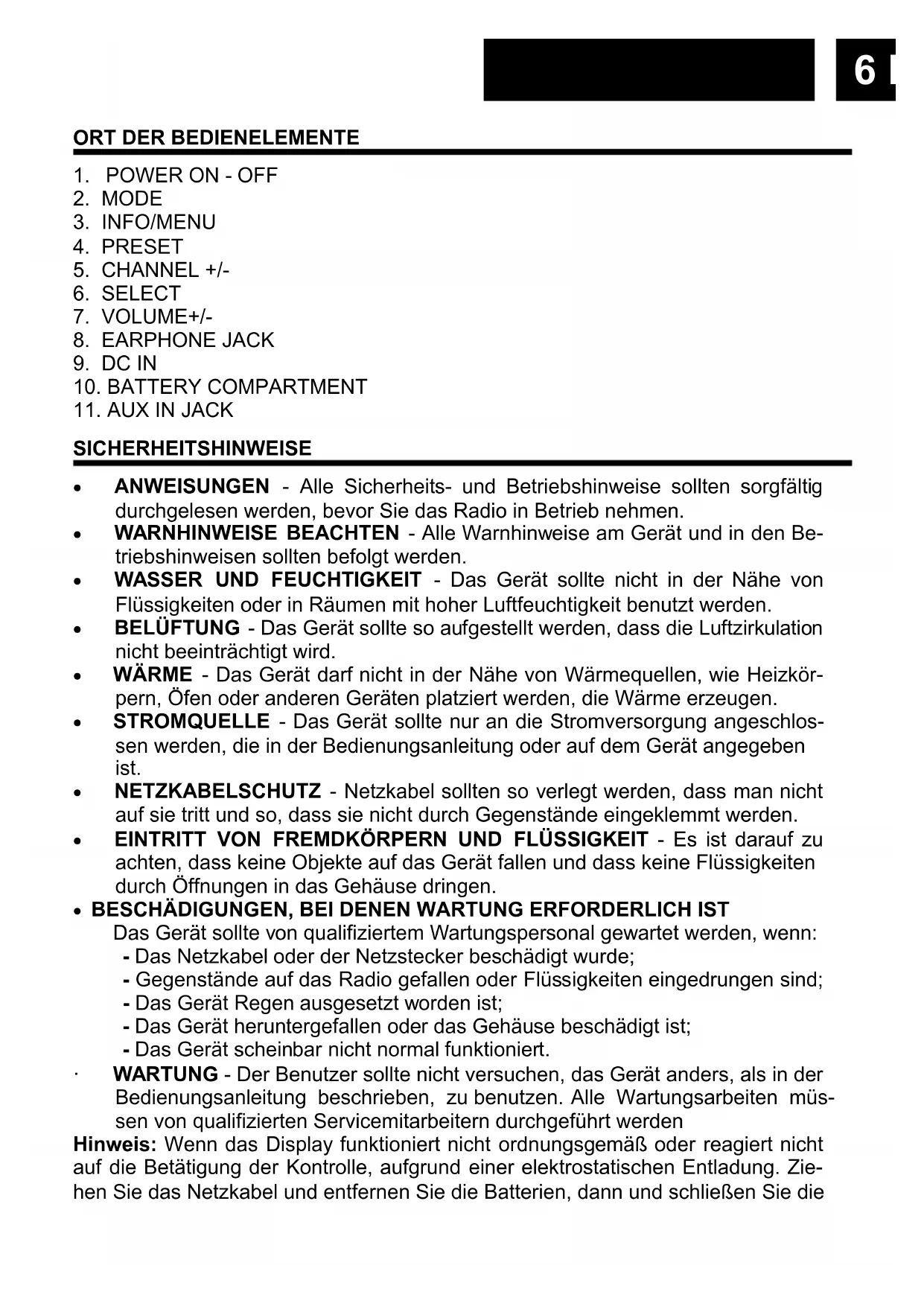 - BESCHÄDIGUNGEN, BEI DENEN WARTUNG ERFORDERLICH IST Das Gerät sollte von qualifiziertem Wartungspersonal gewartet werden, wenn: - Das Netzkabel oder der Netzstecker beschädigt wurde; - Gegenstände auf das Radio gefallen oder Flüssigkeiten eingedrungen sind; - Das Gerät Regen ausgesetzt worden ist; - Das Gerät heruntergefallen oder das Gehäuse beschädigt ist; - Das Gerät scheinbar nicht normal funktioniert.