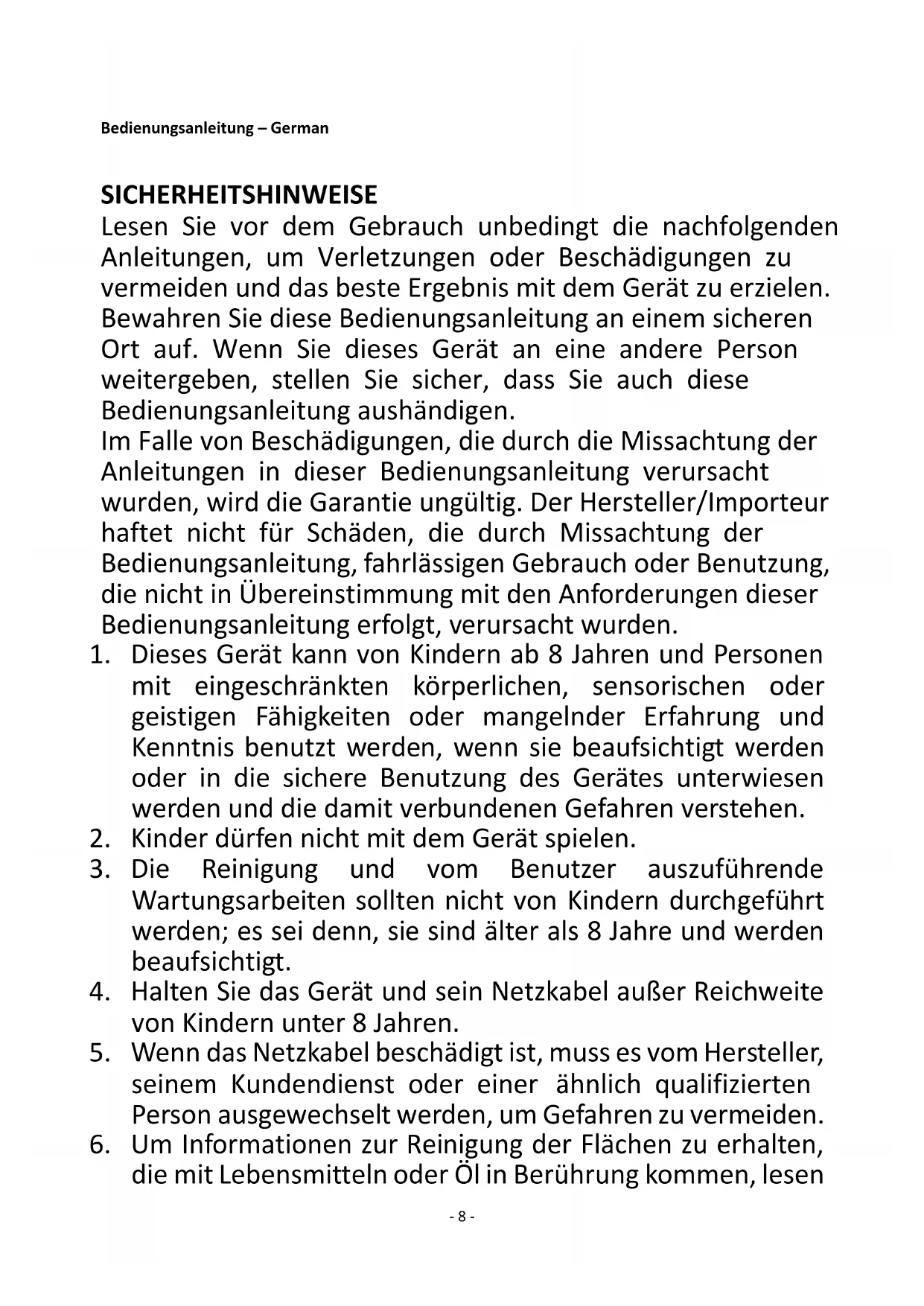1. Dieses Gerät kann von Kindern ab 8 Jahren und Personen