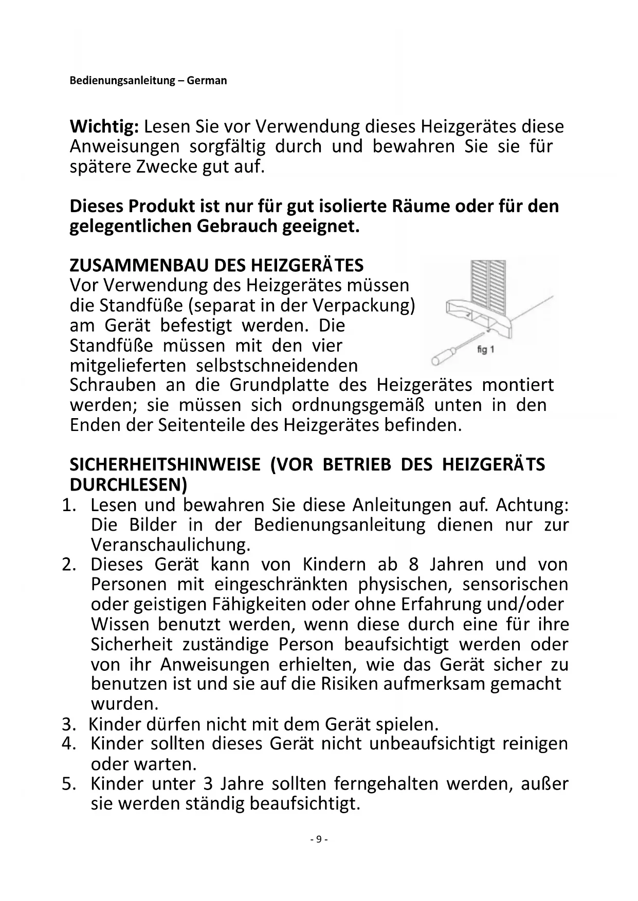 Satisfies the requirement of the Council Directives: COMMISSION REGULATION (EU) No 2015/1188 of 28 April 2015 and Amending COMMISSION REGULATION (EU) 2016/2282 implementing Directive 2009/125/EC of the European Parliament and of the Council with regard to ecodesign requirements for local space heaters Regarding information for consumers on how to install, use and maintain the product, WEEE information, please check the instruction manual provided with packaging.- 9 - Bedienungsanleitung – German Wichtig: Lesen Sie vor Verwendung dieses Heizgerätes diese Anweisungen sorgfältig durch und bewahren Sie sie für spätere Zwecke gut auf. Dieses Produkt ist nur für gut isolierte Räume oder für den gelegentlichen Gebrauch geeignet.