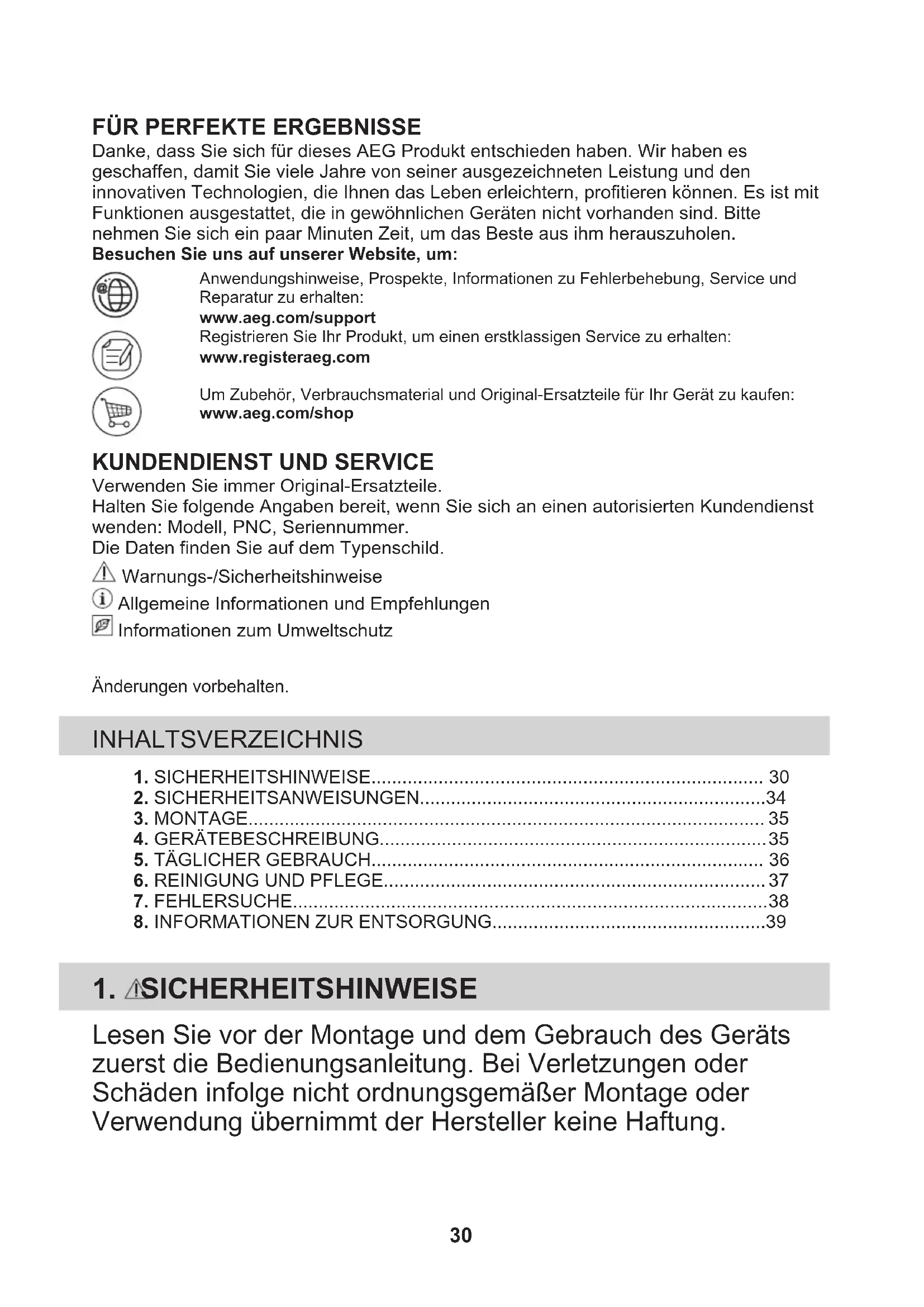 Danke, dass Sie sich für dieses AEG Produkt entschieden haben. Wir haben esgeschaffen, damit Sie viele Jahre von seiner ausgezeichneten Leistung und deninnovativen Technologien, die Ihnen das Leben erleichtern, profitieren können. Es ist mitFunktionen ausgestattet, die in gewöhnlichen Geräten nicht vorhanden sind. Bittenehmen Sie sich ein paar Minuten Zeit, um das Beste aus ihm herauszuholen.Besuchen Sie uns auf unserer Website, um:Anwendungshinweise, Prospekte, Informationen zu Fehlerbehebung, Service undReparatur zu erhalten:www.aeg.com/supportRegistrieren Sie Ihr Produkt, um einen erstklassigen Service zu erhalten:www.registeraeg.comUm Zubehör, Verbrauchsmaterial und Original-Ersatzteile für Ihr Gerät zu kaufen:www.aeg.com/shop