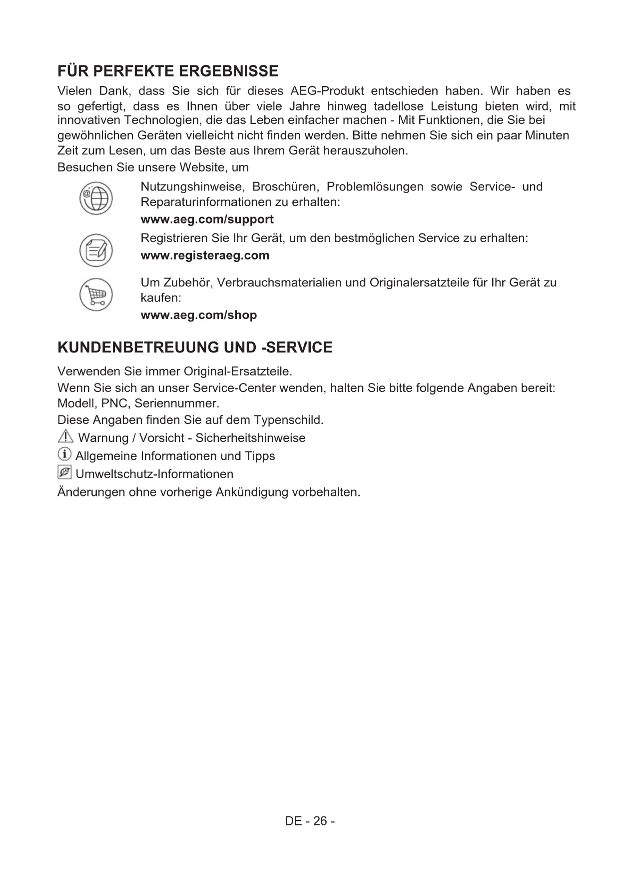 Verwenden Sie immer Original-Ersatzteile. Wenn Sie sich an unser Service-Center wenden, halten Sie bitte folgende Angaben bereit: Modell, PNC, Seriennummer. Diese Angaben nden Sie auf dem Typenschild. Warnung / Vorsicht - Sicherheitshinweise Allgemeine Informationen und Tipps Umweltschutz-Informationen Änderungen ohne vorherige Ankündigung vorbehalten.DE - 27 -