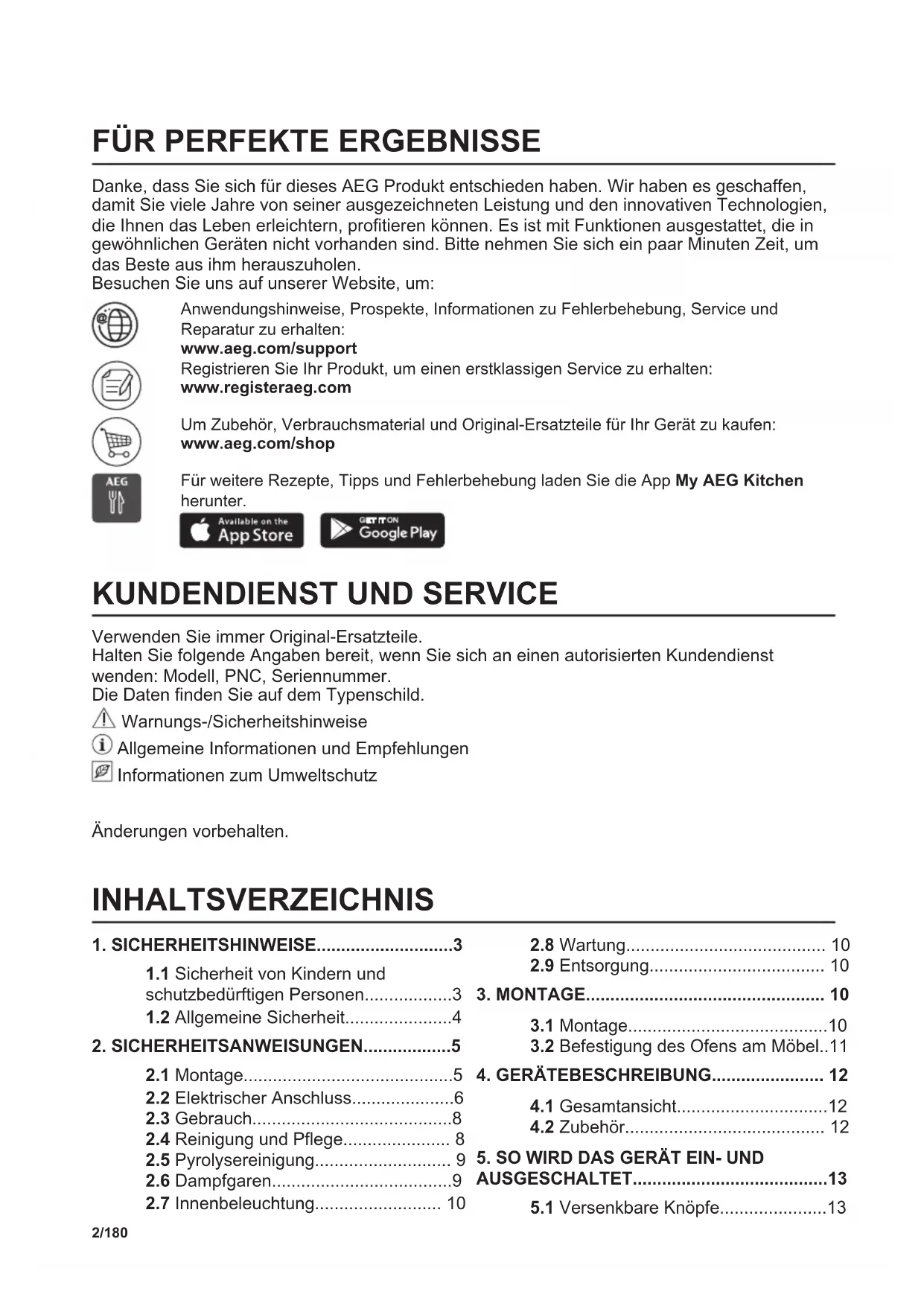 Danke, dass Sie sich für dieses AEG Produkt entschieden haben. Wir haben es geschaffen, damit Sie viele Jahre von seiner ausgezeichneten Leistung und den innovativen Technologien, die Ihnen das Leben erleichtern, profitieren können. Es ist mit Funktionen ausgestattet, die in gewöhnlichen Geräten nicht vorhanden sind. Bitte nehmen Sie sich ein paar Minuten Zeit, um das Beste aus ihm herauszuholen. Besuchen Sie uns auf unserer Website, um: Anwendungshinweise, Prospekte, Informationen zu Fehlerbehebung, Service und Reparatur zu erhalten: www.aeg.com/support Registrieren Sie Ihr Produkt, um einen erstklassigen Service zu erhalten: www.registeraeg.com Um Zubehör, Verbrauchsmaterial und Original-Ersatzteile für Ihr Gerät zu kaufen: www.aeg.com/shop Für weitere Rezepte, Tipps und Fehlerbehebung laden Sie die App My AEG Kitchen herunter.