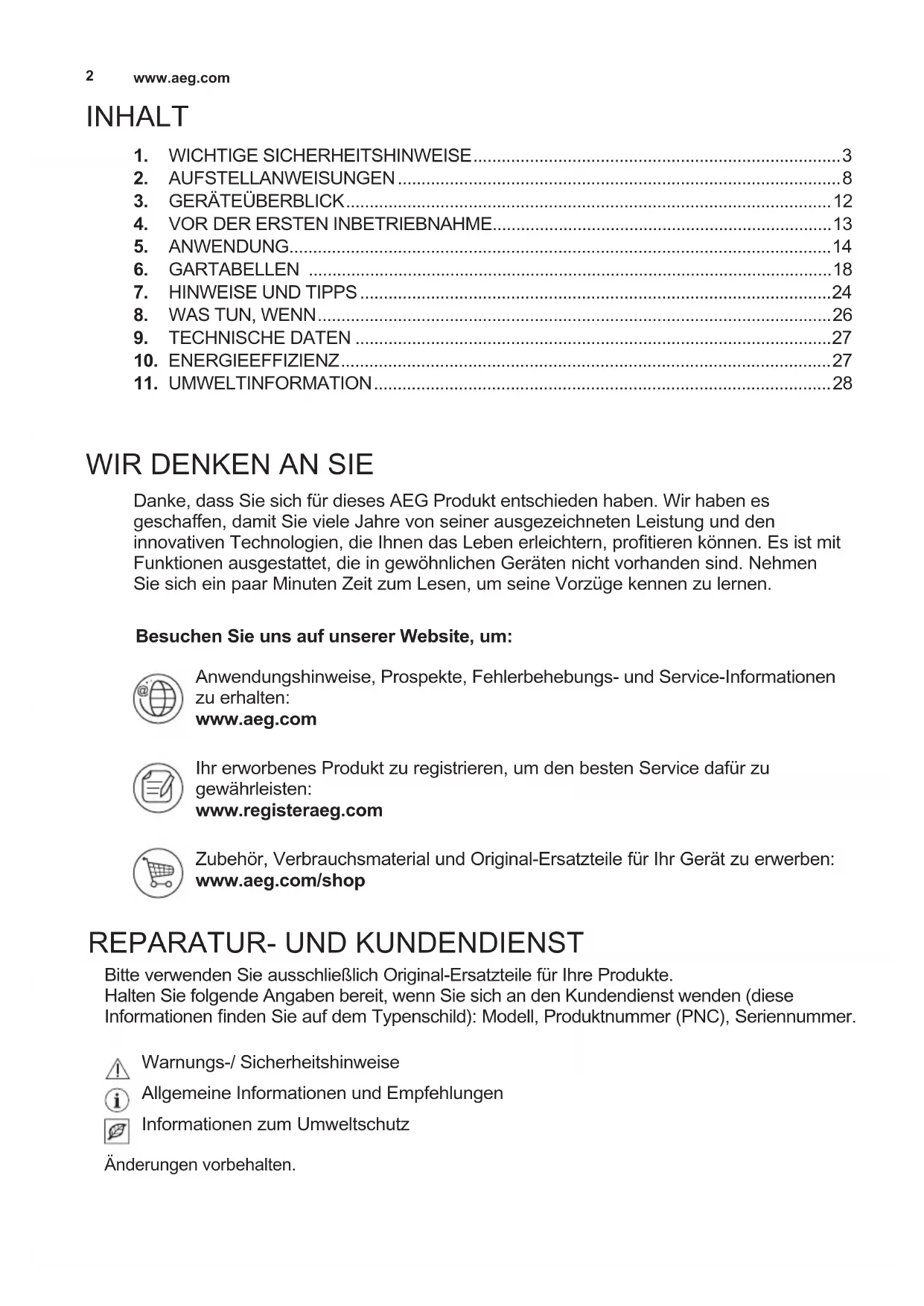 Bitte verwenden Sie ausschließlich Original-Ersatzteile für Ihre Produkte. Halten Sie folgende Angaben bereit, wenn Sie sich an den Kundendienst wenden (diese Informationen nden Sie auf dem Typenschild): Modell, Produktnummer (PNC), Seriennummer. Änderungen vorbehalten. Warnungs-/ Sicherheitshinweise Allgemeine Informationen und Empfehlungen Informationen zum Umweltschutz 1 - AEG_German_CG_BASE_AL28UICTO_SWISS.indd 21 - AEG_German_CG_BASE_AL28UICTO_SWISS.indd 2 21/03/2024 15:19:0921/03/2024 15:19:093 DEUTSCH