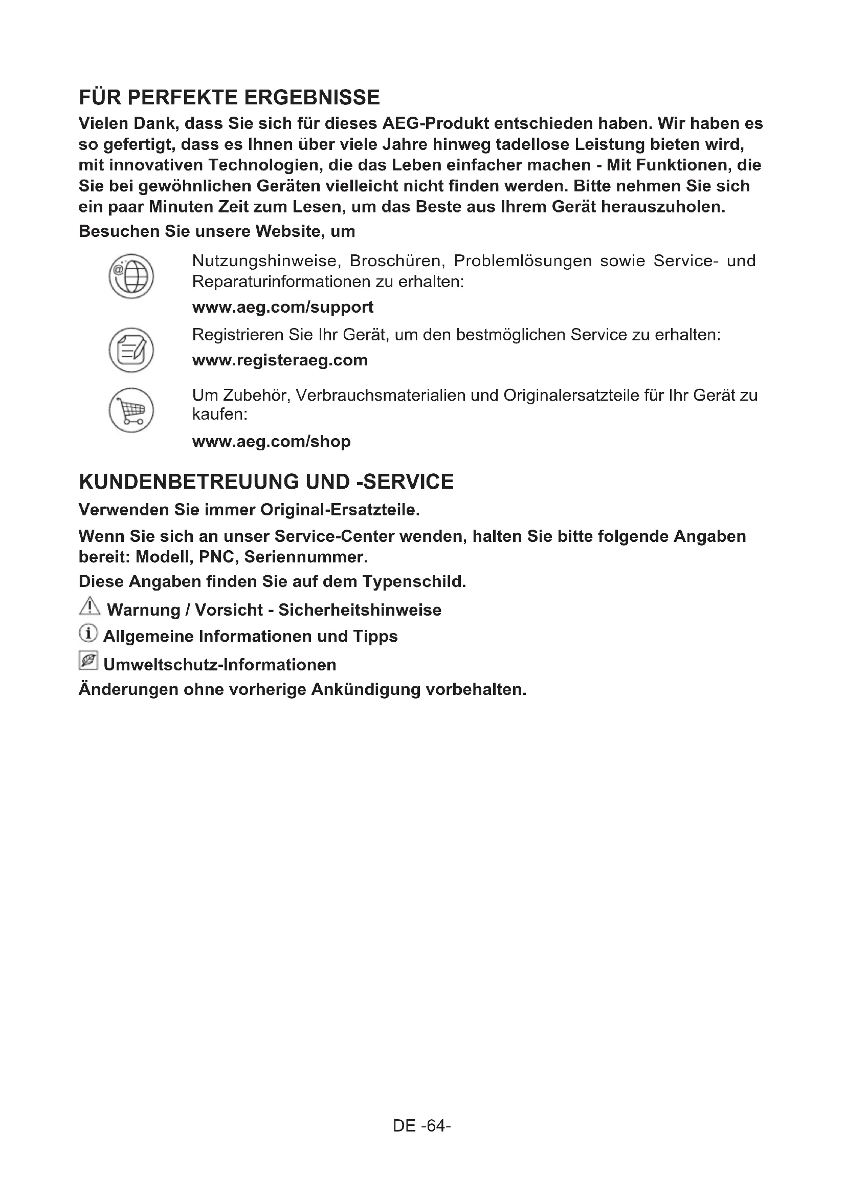 Vielen Dank, dass Sie sich für dieses AEG-Produkt entschieden haben. Wir haben es so gefertigt, dass es Ihnen über viele Jahre hinweg tadellose Leistung bieten wird, mit innovativen Technologien, die das Leben einfacher machen - Mit Funktionen, die Sie bei gewöhnlichen Geräten vielleicht nicht finden werden. Bitte nehmen Sie sich ein paar Minuten Zeit zum Lesen, um das Beste aus Ihrem Gerät herauszuholen. Besuchen Sie unsere Website, um Nutzungshinweise, Broschüren, Problemlösungen sowie Service- und Reparaturinformationen zu erhalten: www.aeg.com/support Registrieren Sie Ihr Gerät, um den bestmöglichen Service zu erhalten: www.registeraeg.com Um Zubehör, Verbrauchsmaterialien und Originalersatzteile für Ihr Gerät zu kaufen: www.aeg.com/shop