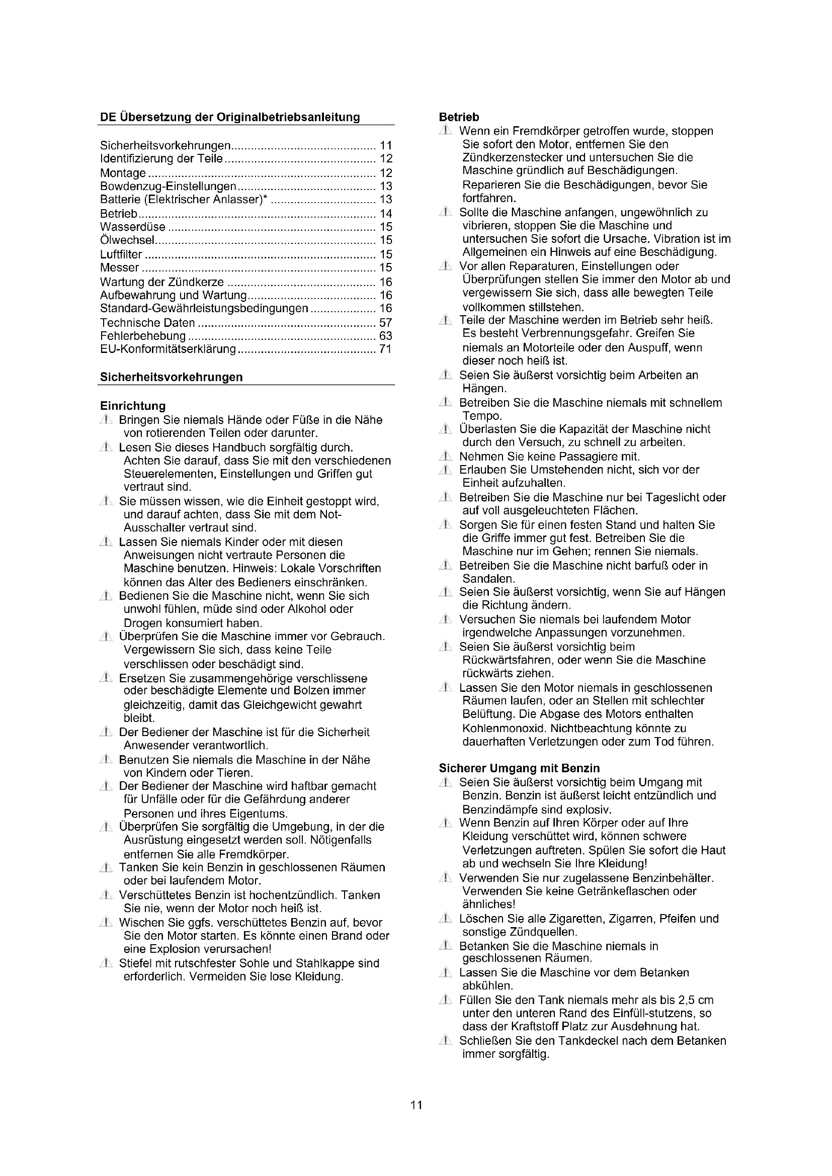 - EU-Konformitätserklärung Sicherheitsvorkehrungen Einrichtung Bringen Sie niemals Hände oder Füße in die Nähe von rotierenden Teilen oder darunter. Lesen Sie dieses Handbuch sorgfältig durch. Achten Sie darauf, dass Sie mit den verschiedenen Steuerelementen, Einstellungen und Griffen gut vertraut sind. Sie müssen wissen, wie die Einheit gestoppt wird, und darauf achten, dass Sie mit dem Not- Ausschalter vertraut sind. Lassen Sie niemals Kinder oder mit diesen Anweisungen nicht vertraute Personen die Maschine benutzen. Hinweis: Lokale Vorschriften können das Alter des Bedieners einschränken. Bedienen Sie die Maschine nicht, wenn Sie sich unwohl fühlen, müde sind oder Alkohol oder Drogen konsumiert haben. Überprüfen Sie die Maschine immer vor Gebrauch. Vergewissern Sie sich, dass keine Teile verschlissen oder beschädigt sind. Ersetzen Sie zusammengehörige verschlissene oder beschädigte Elemente und Bolzen immer gleichzeitig, damit das Gleichgewicht gewahrt bleibt. Der Bediener der Maschine ist für die Sicherheit Anwesender verantwortlich. Benutzen Sie niemals die Maschine in der Nähe von Kindern oder Tieren. Der Bediener der Maschine wird haftbar gemacht für Unfälle oder für die Gefährdung anderer Personen und ihres Eigentums. Überprüfen Sie sorgfältig die Umgebung, in der die Ausrüstung eingesetzt werden soll. Nötigenfalls entfernen Sie alle Fremdkörper. Tanken Sie kein Benzin in geschlossenen Räumen oder bei laufendem Motor. Verschüttetes Benzin ist hochentzündlich. Tanken Sie nie, wenn der Motor noch heiß ist. Wischen Sie ggfs. verschüttetes Benzin auf, bevor Sie den Motor starten. Es könnte einen Brand oder eine Explosion verursachen! Stiefel mit rutschfester Sohle und Stahlkappe sind erforderlich. Vermeiden Sie lose Kleidung. p. 71