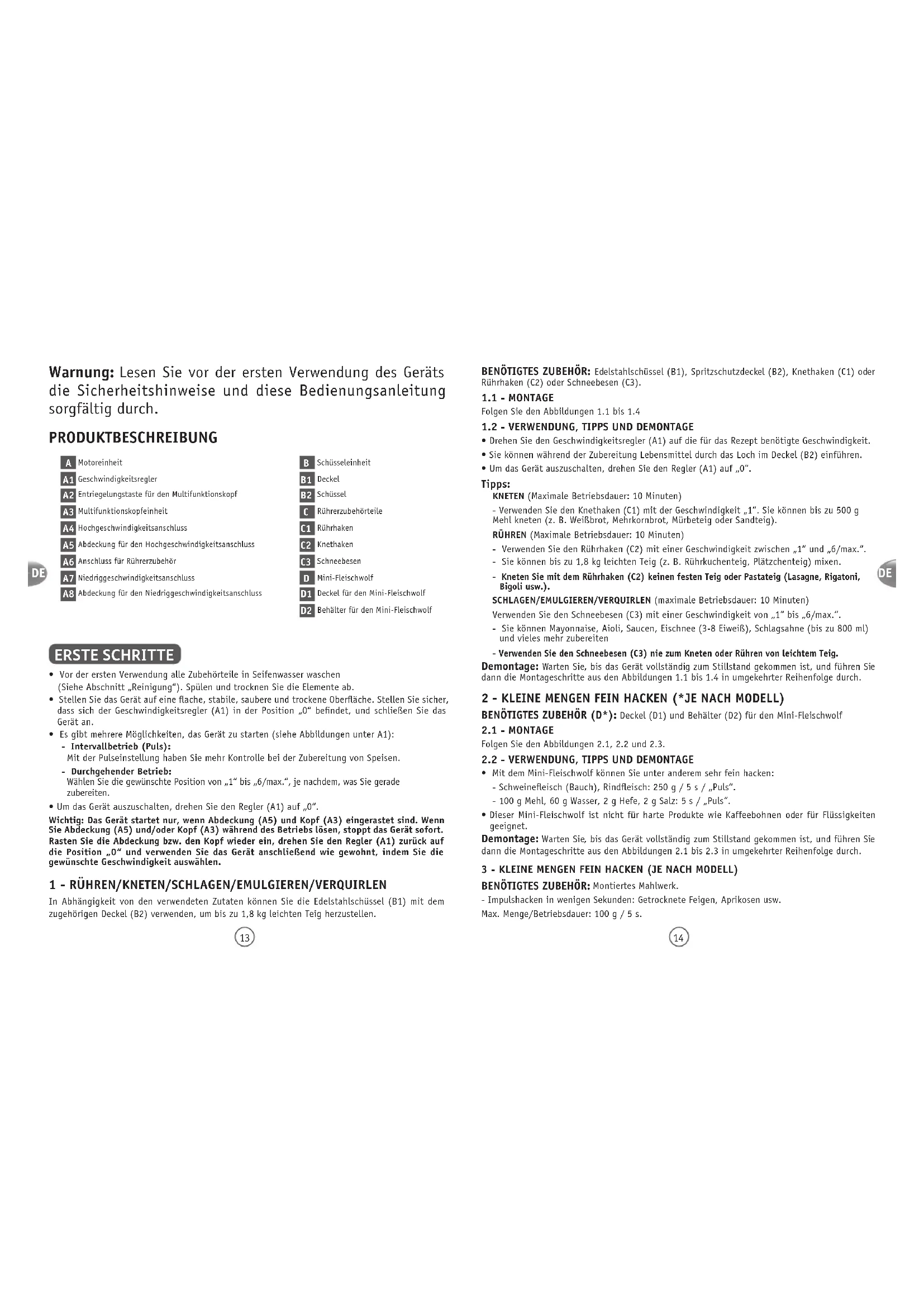 - Drehen Sie den Geschwindigkeitsregler (A1) auf die für das Rezept benötigte Geschwindigkeit. • Sie können während der Zubereitung Lebensmittel durch das Loch im Deckel (B2) einführen. • Um das Gerät auszuschalten, drehen Sie den Regler (A1) auf „0“. Tipps: KNETEN (Maximale Betriebsdauer: 10 Minuten) - Verwenden Sie den Knethaken (C1) mit der Geschwindigkeit „1“. Sie können bis zu 500 g Mehl kneten (z. B. Weißbrot, Mehrkornbrot, Mürbeteig oder Sandteig). RÜHREN (Maximale Betriebsdauer: 10 Minuten) - Verwenden Sie den Rührhaken (C2) mit einer Geschwindigkeit zwischen „1“ und „6/max.“. - Sie können bis zu 1,8 kg leichten Teig (z. B. Rührkuchenteig, Plätzchenteig) mixen. - Kneten Sie mit dem Rührhaken (C2) keinen festen Teig oder Pastateig (Lasagne, Rigatoni, Bigoli usw.).SCHLAGEN/EMULGIEREN/VERQUIRLEN (maximale Betriebsdauer: 10 Minuten) Verwenden Sie den Schneebesen (C3) mit einer Geschwindigkeit von „1“ bis „6/max.“. - Sie können Mayonnaise, Aioli, Saucen, Eischnee (3-8 Eiweiß), Schlagsahne (bis zu 800 ml) und vieles mehr zubereiten - Verwenden Sie den Schneebesen (C3) nie zum Kneten oder Rühren von leichtem Teig. Demontage: Warten Sie, bis das Gerät vollständig zum Stillstand gekommen ist, und führen Sie dann die Montageschritte aus den Abbildungen 1.1 bis 1.4 in umgekehrter Reihenfolge durch.