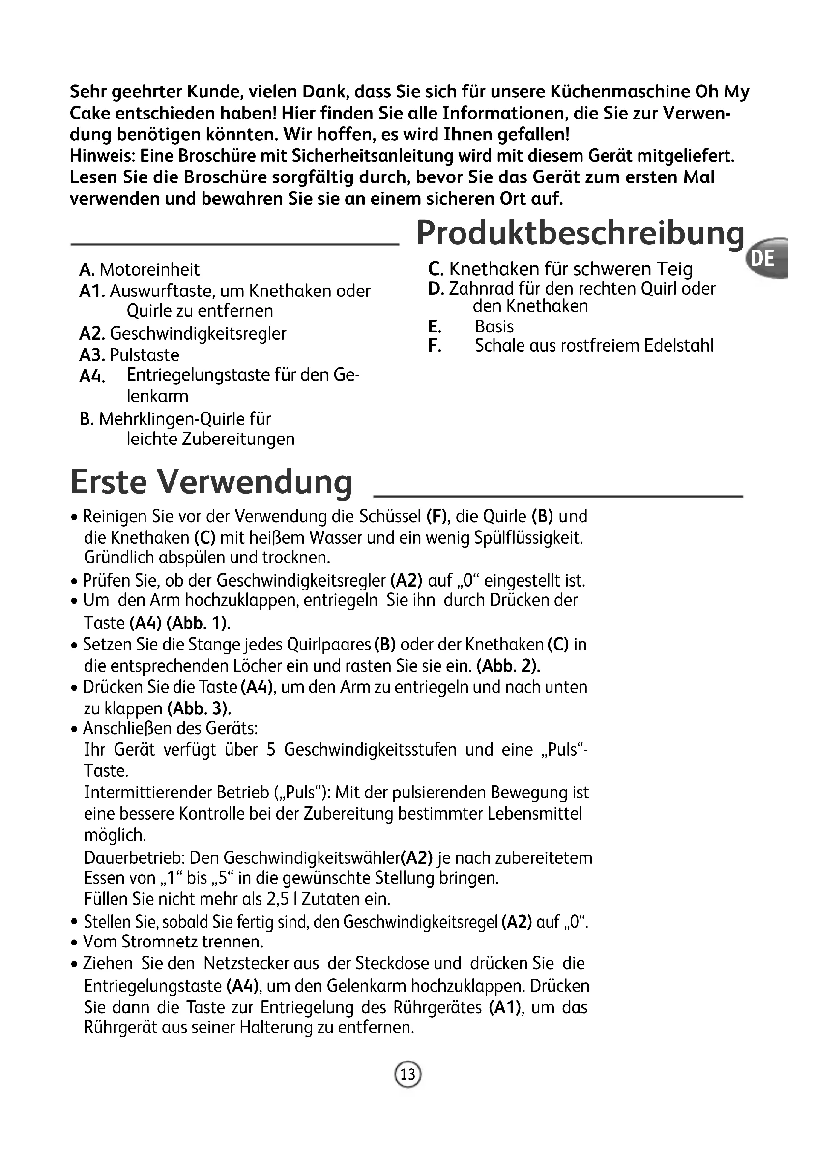 - Ziehen Sie den Netzstecker aus der Steckdose und drücken Sie die Entriegelungstaste (A4), um den Gelenkarm hochzuklappen. Drücken Sie dann die Taste zur Entriegelung des Rührgerätes (A1), um das Rührgerät aus seiner Halterung zu entfernen. Sehr geehrter Kunde, vielen Dank, dass Sie sich für unsere Küchenmaschine Oh My Cake entschieden haben! Hier finden Sie alle Informationen, die Sie zur Verwen- dung benötigen könnten. Wir hoffen, es wird Ihnen gefallen! Hinweis: Eine Broschüre mit Sicherheitsanleitung wird mit diesem Gerät mitgeliefert. Lesen Sie die Broschüre sorgfältig durch, bevor Sie das Gerät zum ersten Mal verwenden und bewahren Sie sie an einem sicheren Ort auf. A. Motoreinheit A1. Auswurftaste, um Knethaken oder Quirle zu entfernen A2. Geschwindigkeitsregler A3. Pulstaste A4. Entriegelungstaste für den Ge- lenkarm B. Mehrklingen-Quirle für leichte Zubereitungen C. Knethaken für schweren Teig D. Zahnrad für den rechten Quirl oder den Knethaken E. Basis F. Schale aus rostfreiem Edelstahl DE14