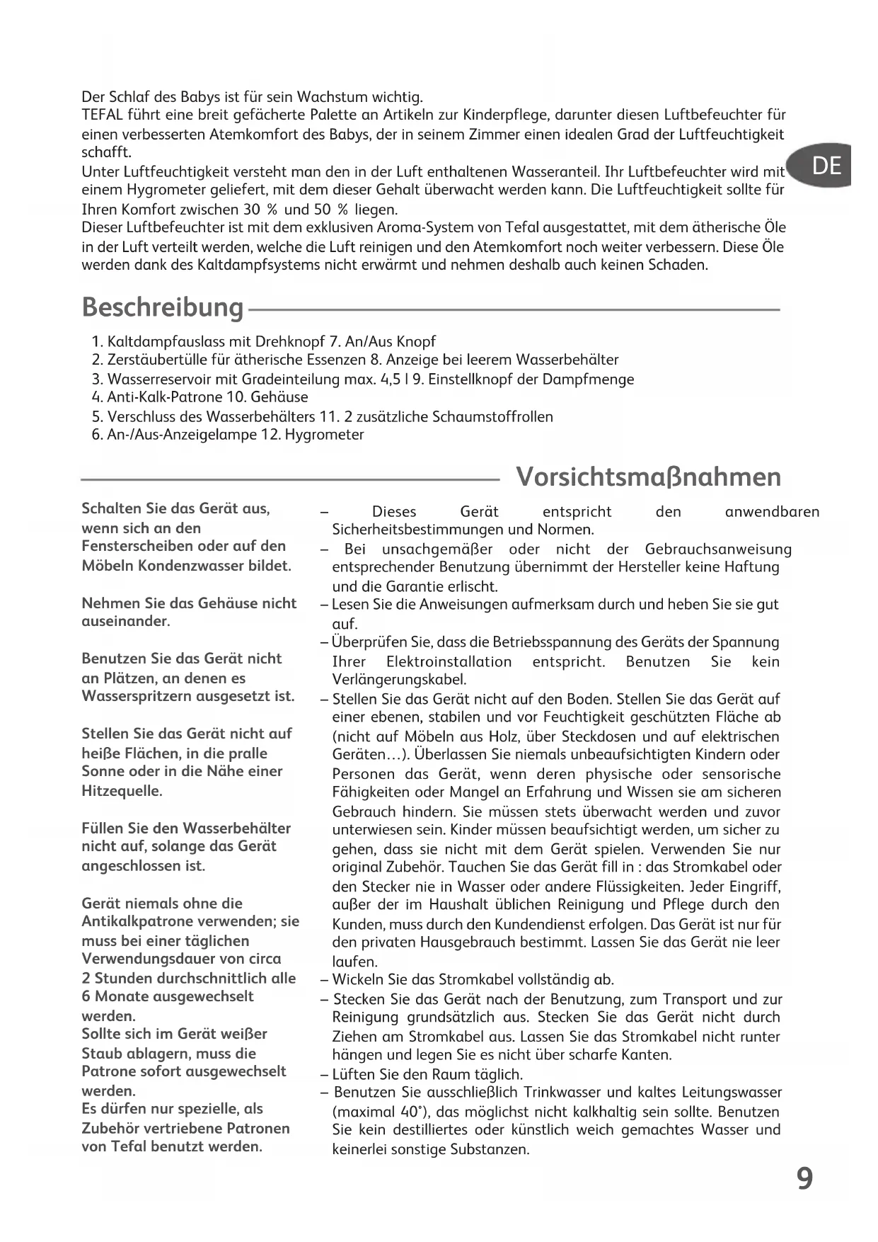 Vorsichtsmaßnahmen – Dieses Gerät entspricht den anwendbaren Sicherheitsbestimmungen und Normen. – Bei unsachgemäßer oder nicht der Gebrauchsanweisung entsprechender Benutzung übernimmt der Hersteller keine Haftung und die Garantie erlischt. – Lesen Sie die Anweisungen aufmerksam durch und heben Sie sie gut auf. – Überprüfen Sie, dass die Betriebsspannung des Geräts der Spannung Ihrer Elektroinstallation entspricht. Benutzen Sie kein Verlängerungskabel. – Stellen Sie das Gerät nicht auf den Boden. Stellen Sie das Gerät auf einer ebenen, stabilen und vor Feuchtigkeit geschützten Fläche ab (nicht auf Möbeln aus Holz, über Steckdosen und auf elektrischen Geräten…). Überlassen Sie niemals unbeaufsichtigten Kindern oder Personen das Gerät, wenn deren physische oder sensorische Fähigkeiten oder Mangel an Erfahrung und Wissen sie am sicheren Gebrauch hindern. Sie müssen stets überwacht werden und zuvor unterwiesen sein. Kinder müssen beaufsichtigt werden, um sicher zu gehen, dass sie nicht mit dem Gerät spielen. Verwenden Sie nur original Zubehör. Tauchen Sie das Gerät fill in : das Stromkabel oder den Stecker nie in Wasser oder andere Flüssigkeiten. Jeder Eingriff, außer der im Haushalt üblichen Reinigung und Pflege durch den Kunden, muss durch den Kundendienst erfolgen. Das Gerät ist nur für den privaten Hausgebrauch bestimmt. Lassen Sie das Gerät nie leer laufen. – Wickeln Sie das Stromkabel vollständig ab. – Stecken Sie das Gerät nach der Benutzung, zum Transport und zur Reinigung grundsätzlich aus. Stecken Sie das Gerät nicht durch Ziehen am Stromkabel aus. Lassen Sie das Stromkabel nicht runter hängen und legen Sie es nicht über scharfe Kanten. – Lüften Sie den Raum täglich. – Benutzen Sie ausschließlich Trinkwasser und kaltes Leitungswasser (maximal 40°), das möglichst nicht kalkhaltig sein sollte. Benutzen Sie kein destilliertes oder künstlich weich gemachtes Wasser und keinerlei sonstige Substanzen. Schalten Sie das Gerät aus, wenn sich an den Fensterscheiben oder auf den Möbeln Kondenzwasser bildet. Nehmen Sie das Gehäuse nicht auseinander. Benutzen Sie das Gerät nicht an Plätzen, an denen es Wasserspritzern ausgesetzt ist. Stellen Sie das Gerät nicht auf heiße Flächen, in die pralle Sonne oder in die Nähe einer Hitzequelle. Füllen Sie den Wasserbehälter nicht auf, solange das Gerät angeschlossen ist. Gerät niemals ohne die Antikalkpatrone verwenden; sie muss bei einer täglichen Verwendungsdauer von circa 2 Stunden durchschnittlich alle 6 Monate ausgewechselt werden. Sollte sich im Gerät weißer Staub ablagern, muss die Patrone sofort ausgewechselt werden. Es dürfen nur spezielle, als Zubehör vertriebene Patronen von Tefal benutzt werden. TefDis-HumidAroma 08-10 26/07/10 15:02 Page 9FR