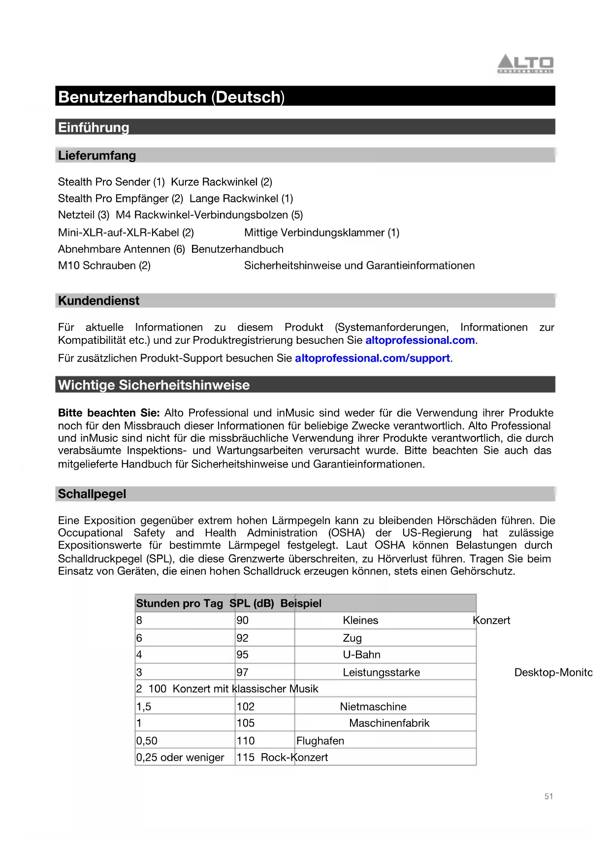 Benutzerhandbuch (Deutsch) Einführung Lieferumfang Stealth Pro Sender (1) Kurze Rackwinkel (2) Stealth Pro Empfänger (2) Lange Rackwinkel (1) Netzteil (3) M4 Rackwinkel-Verbindungsbolzen (5) Mini-XLR-auf-XLR-Kabel (2) Mittige Verbindungsklammer (1) Abnehmbare Antennen (6) Benutzerhandbuch M10 Schrauben (2) Sicherheitshinweise und Garantieinformationen Kundendienst Für aktuelle Informationen zu diesem Produkt (Systemanforderungen, Informationen zur Kompatibilität etc.) und zur Produktregistrierung besuchen Sie altoprofessional.com. Für zusätzlichen Produkt-Support besuchen Sie altoprofessional.com/support. Wichtige Sicherheitshinweise Bitte beachten Sie: Alto Professional und inMusic sind weder für die Verwendung ihrer Produkte noch für den Missbrauch dieser Informationen für beliebige Zwecke verantwortlich. Alto Professional und inMusic sind nicht für die missbräuchliche Verwendung ihrer Produkte verantwortlich, die durch verabsäumte Inspektions- und Wartungsarbeiten verursacht wurde. Bitte beachten Sie auch das mitgelieferte Handbuch für Sicherheitshinweise und Garantieinformationen. Schallpegel Eine Exposition gegenüber extrem hohen Lärmpegeln kann zu bleibenden Hörschäden führen. Die Occupational Safety and Health Administration (OSHA) der US-Regierung hat zulässige Expositionswerte für bestimmte Lärmpegel festgelegt. Laut OSHA können Belastungen durch Schalldruckpegel (SPL), die diese Grenzwerte überschreiten, zu Hörverlust führen. Tragen Sie beim Einsatz von Geräten, die einen hohen Schalldruck erzeugen können, stets einen Gehörschutz. Stunden pro Tag SPL (dB) Beispiel 8 90 Kleines Konzert 6 92 Zug 4 95 U-Bahn 3 97 Leistungsstarke Desktop-Monitore 2 100 Konzert mit klassischer Musik 1,5 102 Nietmaschine 1 105 Maschinenfabrik 0,50 110 Flughafen 0,25 oder weniger 115 Rock-Konzert52
