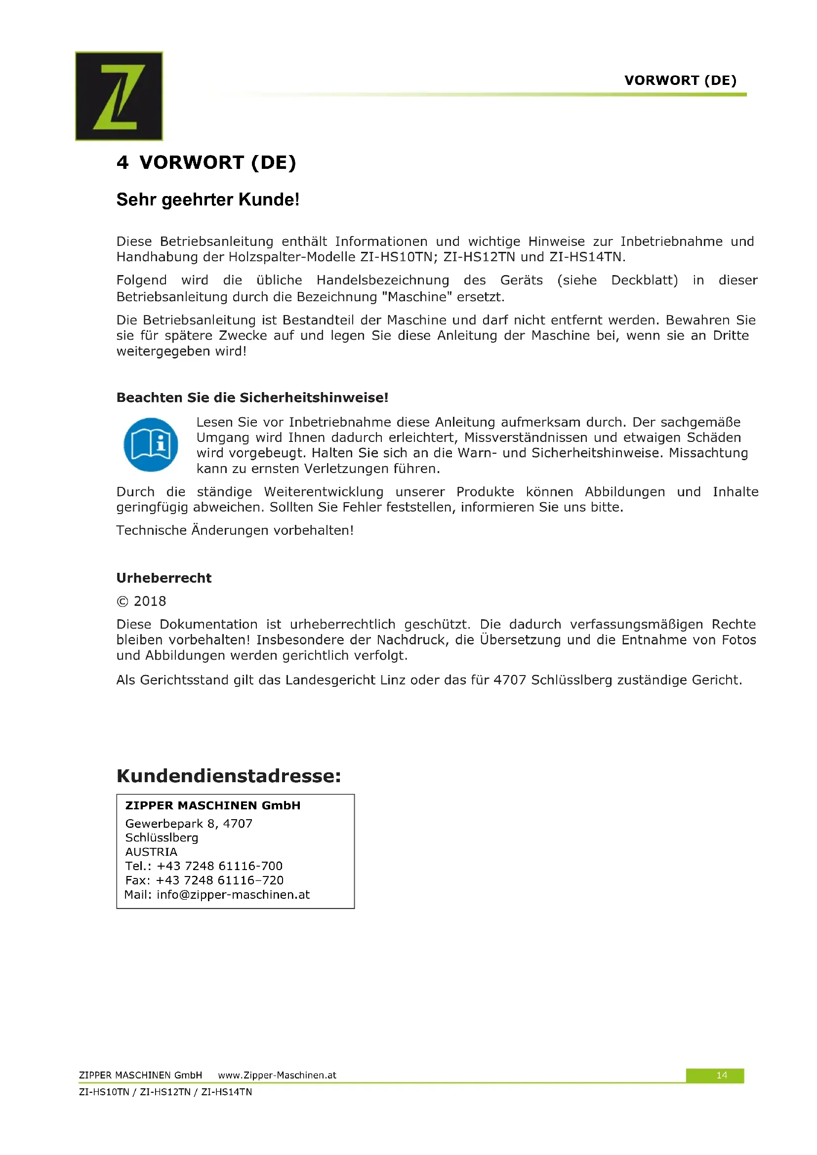 Kundendienstadresse: ZIPPER MASCHINEN GmbH Gewerbepark 8, 4707 Schlüsslberg AUSTRIA Tel.: +43 7248 61116-700 Fax: +43 7248 61116–720 Mail: info@zipper-maschinen.atSICHERHEIT ZIPPER MASCHINEN GmbH www.Zipper-Maschinen.at 15 ZI-HS10TN / ZI-HS12TN / ZI-HS14TN 5 SICHERHEIT Benutzen Sie die Maschine nur in technisch einwandfreiem Zustand sowie bestimmungsgemäß, sicherheits- und gefahrenbewusst! Lassen Sie Störungen, die die Sicherheit beeinträchtigen können, umgehend beseitigen! Die Maschine ist ausschließlich für folgende Tätigkeiten bestimmt: Zum Spalten von Holz in Faserrichtung, mit Abmessungen, die sich innerhalb der im Abschnitt „Technische Daten“ angeführten Grenzen bewegen. Der Spaltvorgang der Maschine ist für die Bedienung durch lediglich eine Person bestimmt. Für eine andere oder darüber hinausgehende Benutzung und daraus resultierende Sachschäden oder Verletzungen übernimmt ZIPPER-MASCHINEN keine Verantwortung oder Garantieleistung. Einsatzbedingungen: Die Maschine ist für den Einsatz unter folgenden Bedingungen bestimmt: Rel. Feuchtigkeit: max. 50 % Temperatur +5° C bis +40° C Höhe ü NN bis 1.000 m Die nicht bestimmungsgemäße Verwendung bzw. die Missachtung der in dieser Anleitung dargelegten Ausführungen und Hinweise hat das Erlöschen sämtlicher Gewährleistungs- und Schadenersatzansprüche gegenüber der Zipper GmbH zur Folge. Unzulässige Verwendung: - Betreiben der Maschine ohne adäquate körperliche und geistige Eignung - Betreiben der Maschine ohne Kenntnis der Bedienungsanleitung - Änderungen der Konstruktion der Maschine - Betreiben der Maschine unter explosionsgefährlichen Bedingungen - Betreiben der Maschine außerhalb des vorgegebenen Leistungsbereiches - Entfernen der an der Maschine angebrachten Sicherheitskennzeichnungen - Verändern, umgehen oder außer Kraft setzen der Sicherheitseinrichtungen der Maschine