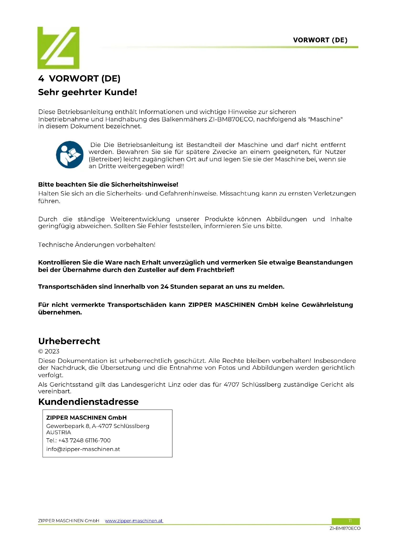 / Gegarandeerd geluidsvermogensniveau 105 db(A) Vibrationspegel Handgriff / Vibration level handlebar / Hladina vibrace rukojeti / Niveau de vibrations de la poignée / Nivel de vibración de la empuñadura / Rezgészsint / Trillingsniveau handgreep 5,5 m/s² Maschinenmaße / Machine dimension / Rozměr maschine / Dimensions de la machine / Gép méretei / Medidas de la máquina / Machineafmeting 1350 x 930 x 1050 mm Nettogewicht / Net weight / Hmotnost netto / Poids net / Peso neto / Netto súly / Nettogewicht 55 kgVORWORT (DE) ZIPPER MASCHINEN GmbH www.zipper-maschinen.at 11 ZI-BM870ECO 4 VORWORT (DE) Sehr geehrter Kunde! Diese Betriebsanleitung enthält Informationen und wichtige Hinweise zur sicheren Inbetriebnahme und Handhabung des Balkenmähers ZI-BM870ECO, nachfolgend als "Maschine" in diesem Dokument bezeichnet. Die Die Betriebsanleitung ist Bestandteil der Maschine und darf nicht entfernt werden. Bewahren Sie sie für spätere Zwecke an einem geeigneten, für Nutzer (Betreiber) leicht zugänglichen Ort auf und legen Sie sie der Maschine bei, wenn sie an Dritte weitergegeben wird!! Bitte beachten Sie die Sicherheitshinweise! Halten Sie sich an die Sicherheits- und Gefahrenhinweise. Missachtung kann zu ernsten Verletzungen führen. Durch die ständige Weiterentwicklung unserer Produkte können Abbildungen und Inhalte geringfügig abweichen. Sollten Sie Fehler feststellen, informieren Sie uns bitte. Technische Änderungen vorbehalten! Kontrollieren Sie die Ware nach Erhalt unverzüglich und vermerken Sie etwaige Beanstandungen bei der Übernahme durch den Zusteller auf dem Frachtbrief! Transportschäden sind innerhalb von 24 Stunden separat an uns zu melden. Für nicht vermerkte Transportschäden kann ZIPPER MASCHINEN GmbH keine Gewährleistung übernehmen.