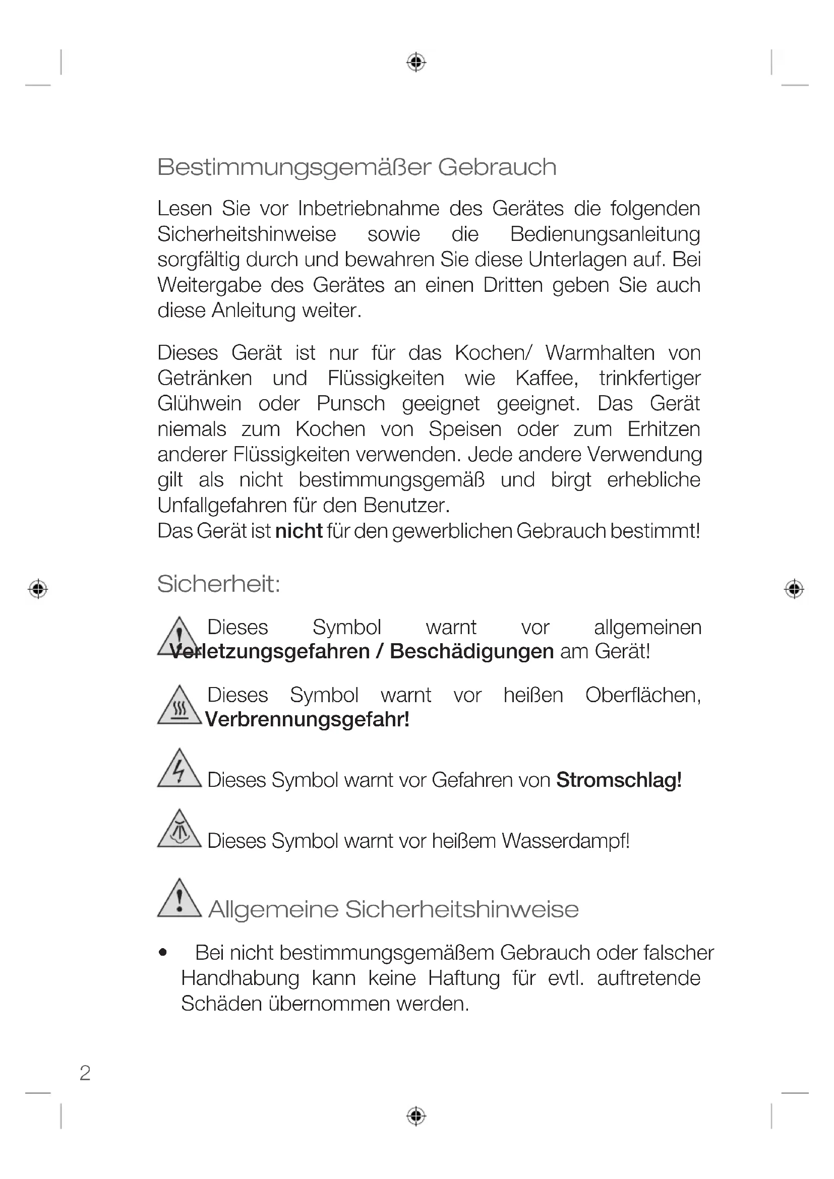 Bestimmungsgemäßer Gebrauch Lesen Sie vor Inbetriebnahme des Gerätes die folgenden Sicherheitshinweise sowie die Bedienungsanleitung sorgfältig durch und bewahren Sie diese Unterlagen auf. Bei Weitergabe des Gerätes an einen Dritten geben Sie auch diese Anleitung weiter. Dieses Gerät ist nur für das Kochen/ Warmhalten von Getränken und Flüssigkeiten wie Kaffee, trinkfertiger Glühwein oder Punsch geeignet geeignet. Das Gerät niemals zum Kochen von Speisen oder zum Erhitzen anderer Flüssigkeiten verwenden. Jede andere Verwendung gilt als nicht bestimmungsgemäß und birgt erhebliche Unfallgefahren für den Benutzer. Das Gerät ist nicht für den gewerblichen Gebrauch bestimmt! Sicherheit: Dieses Symbol warnt vor allgemeinen Verletzungsgefahren / Beschädigungen am Gerät! Dieses Symbol warnt vor heißen Oberflächen, Verbrennungsgefahr! Dieses Symbol warnt vor Gefahren von Stromschlag! Dieses Symbol warnt vor heißem Wasserdampf! Allgemeine Sicherheitshinweise