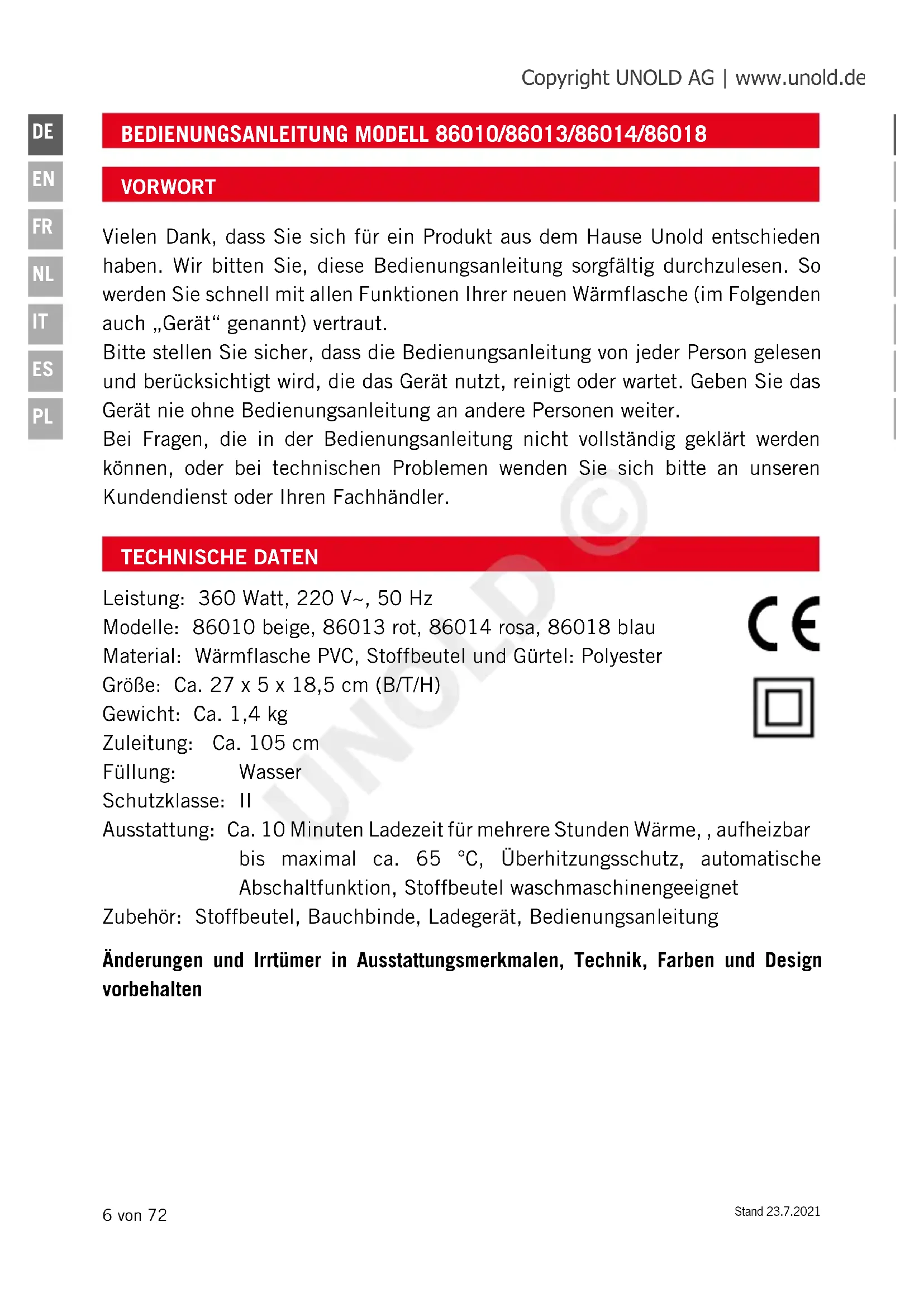 BEDIENUNGSANLEITUNG MODELL 86010/86013/86014/86018 TECHNISCHE DATEN VORWORT Vielen Dank, dass Sie sich für ein Produkt aus dem Hause Unold entschieden haben. Wir bitten Sie, diese Bedienungsanleitung sorgfältig durchzulesen. So werden Sie schnell mit allen Funktionen Ihrer neuen Wärmflasche (im Folgenden auch „Gerät“ genannt) vertraut. Bitte stellen Sie sicher, dass die Bedienungsanleitung von jeder Person gelesen und berücksichtigt wird, die das Gerät nutzt, reinigt oder wartet. Geben Sie das Gerät nie ohne Bedienungsanleitung an andere Personen weiter. Bei Fragen, die in der Bedienungsanleitung nicht vollständig geklärt werden können, oder bei technischen Problemen wenden Sie sich bitte an unseren Kundendienst oder Ihren Fachhändler. Leistung: 360 Watt, 220 V~, 50 Hz Modelle: 86010 beige, 86013 rot, 86014 rosa, 86018 blau Material: Wärmflasche PVC, Stoffbeutel und Gürtel: Polyester Größe: Ca. 27 x 5 x 18,5 cm (B/T/H) Gewicht: Ca. 1,4 kg Zuleitung: Ca. 105 cm Füllung: Wasser Schutzklasse: II Ausstattung: Ca. 10 Minuten Ladezeit für mehrere Stunden Wärme, , aufheizbar bis maximal ca. 65 °C, Überhitzungsschutz, automatische Abschaltfunktion, Stoffbeutel waschmaschinengeeignet Zubehör: Stoffbeutel, Bauchbinde, Ladegerät, Bedienungsanleitung Änderungen und Irrtümer in Ausstattungsmerkmalen, Technik, Farben und Design vorbehalten Copyright UNOLD AG | www.unold.de UNOLD ©Stand 23.7.2021 7 von 72