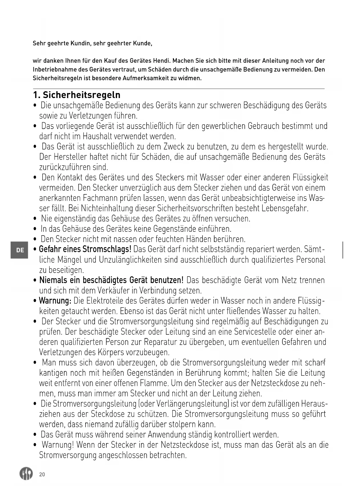 Sehr geehrte Kundin, sehr geehrter Kunde, wir danken Ihnen für den Kauf des Gerätes Hendi. Machen Sie sich bitte mit dieser Anleitung noch vor der Inbetriebnahme des Gerätes vertraut, um Schäden durch die unsachgemäße Bedienung zu vermeiden. Den Sicherheitsregeln ist besondere Aufmerksamkeit zu widmen.