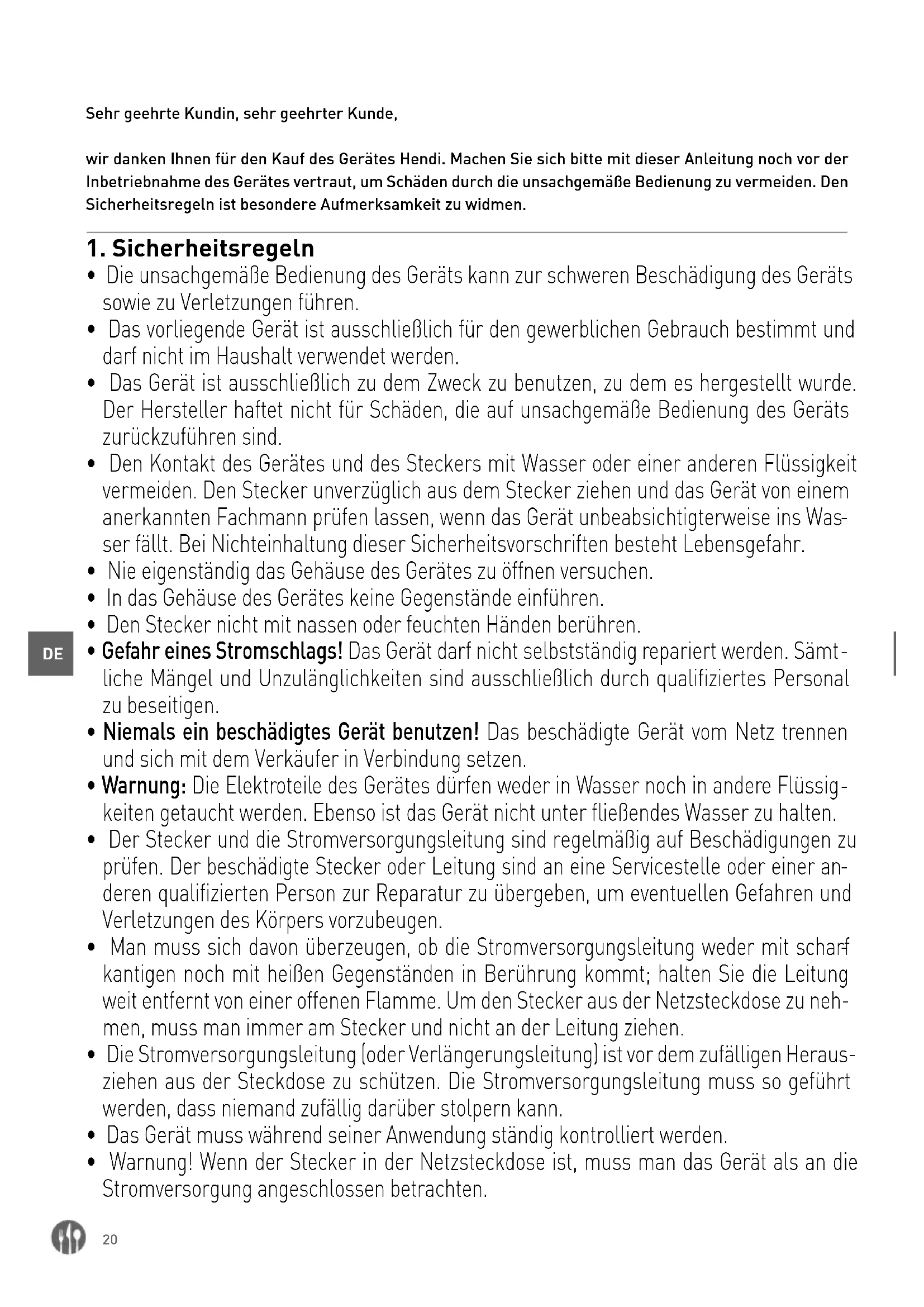 wir danken Ihnen fur den Kauf des Gerätes Hendi. Machen Sie sichitte mit dieser Anleitung noch vor der Inbetriebnahme des Gerätes vertraut, um Schäden durch die unsachgemäß Bedienung zu vermeiden. Den Sicherheitsregeln ist besondere Aufmerksamkeit zu widmen.
