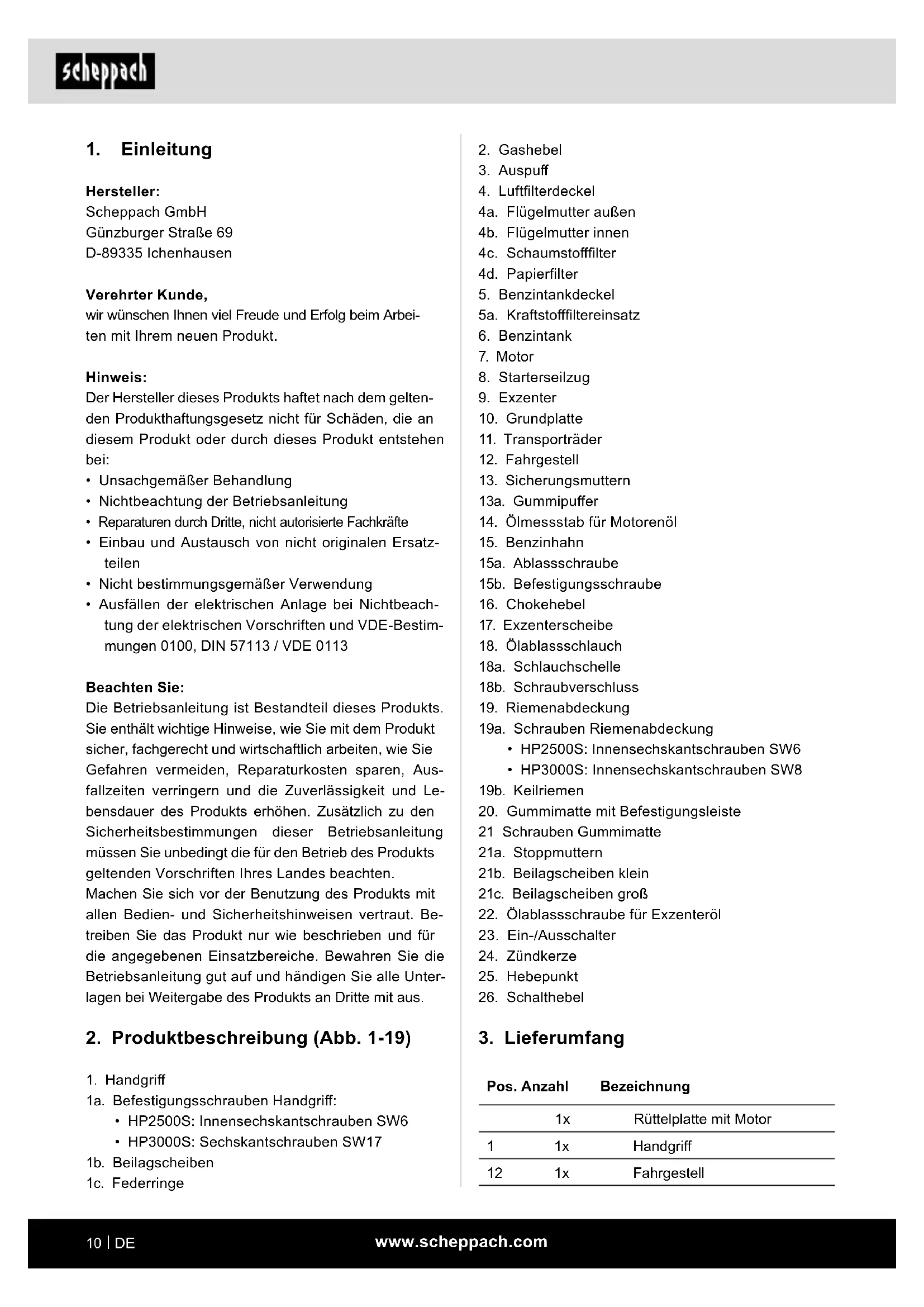 Hersteller: Scheppach GmbH Günzburger Straße 69 D-89335 Ichenhausen Verehrter Kunde, wir wünschen Ihnen viel Freude und Erfolg beim Arbei- ten mit Ihrem neuen Produkt. Hinweis: Der Hersteller dieses Produkts haftet nach dem gelten- den Produkthaftungsgesetz nicht für Schäden, die an diesem Produkt oder durch dieses Produkt entstehen bei: