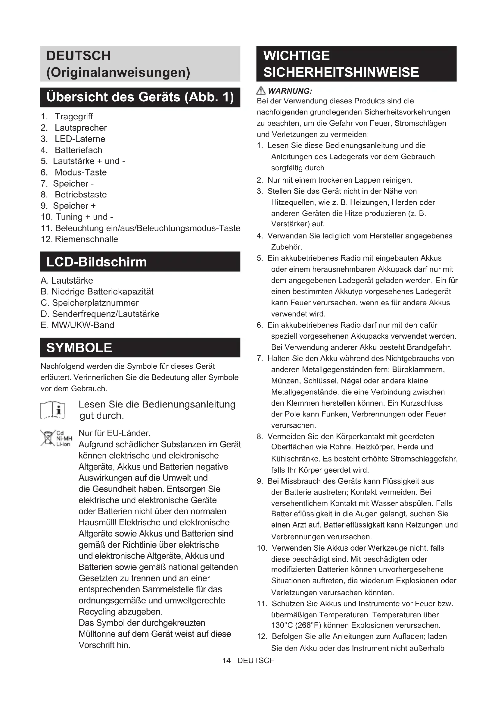 LCD-Bildschirm A. Lautstärke B. Niedrige Batteriekapazität C. Speicherplatznummer D. Senderfrequenz/Lautstärke E. MW/UKW-Band SYMBOLE Nachfolgend werden die Symbole für dieses Gerät erläutert. Verinnerlichen Sie die Bedeutung aller Symbole vor dem Gebrauch. Lesen Sie die Bedienungsanleitung gut durc gut durch. Nur für EU-Länder. Aufgrund schädlicher Substanzen im Gerät können elektrische und elektronische Altgeräte, Akkus und Batterien negative Auswirkungen auf die Umwelt und die Gesundheit haben. Entsorgen Sie elektrische und elektronische Geräte oder Batterien nicht über den normalen Hausmüll! Elektrische und elektronische Altgeräte sowie Akkus und Batterien sind gemäß der Richtlinie über elektrische und elektronische Altgeräte, Akkus und Batterien sowie gemäß national geltenden Gesetzten zu trennen und an einer entsprechenden Sammelstelle für das ordnungsgemäße und umweltgerechte Recycling abzugeben. Das Symbol der durchgekreuzten Mülltonne auf dem Gerät weist auf diese Vorschrift hin. WICHTIGE SICHERHEITSHINWEISE WARNUNG: Bei der Verwendung dieses Produkts sind die nachfolgenden grundlegenden Sicherheitsvorkehrungen zu beachten, um die Gefahr von Feuer, Stromschlägen und Verletzungen zu vermeiden: