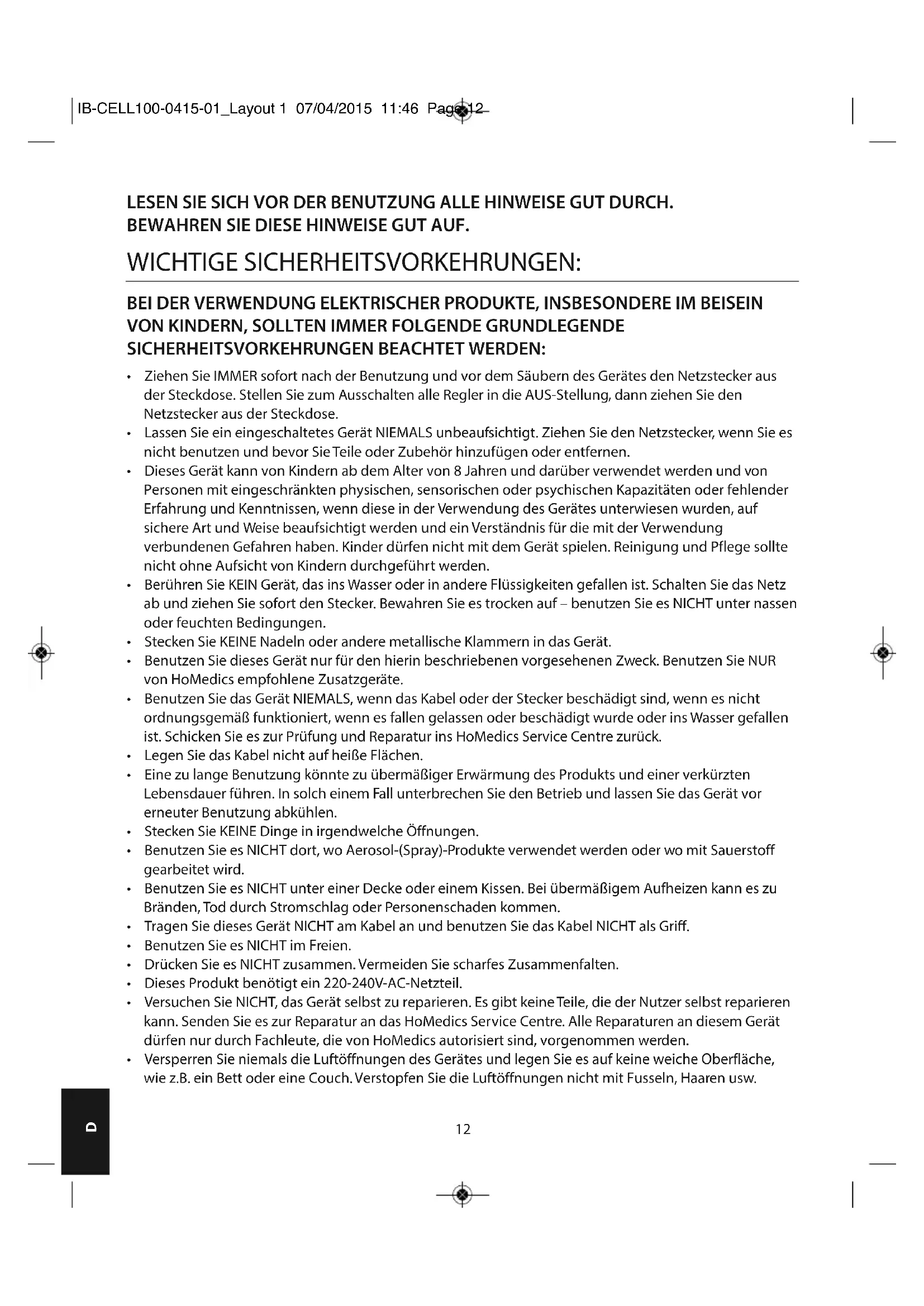 - Versperren Sie niemals die Luftöffnungen des Gerätes und legen Sie es auf keine weiche Oberfläche, wie z.B. ein Bett oder eine Couch. Verstopfen Sie die Luftöffnungen nicht mit Fusseln, Haaren usw. IB-CELL100-0415-01_Layout 1 07/04/2015 11:46 Page 1213