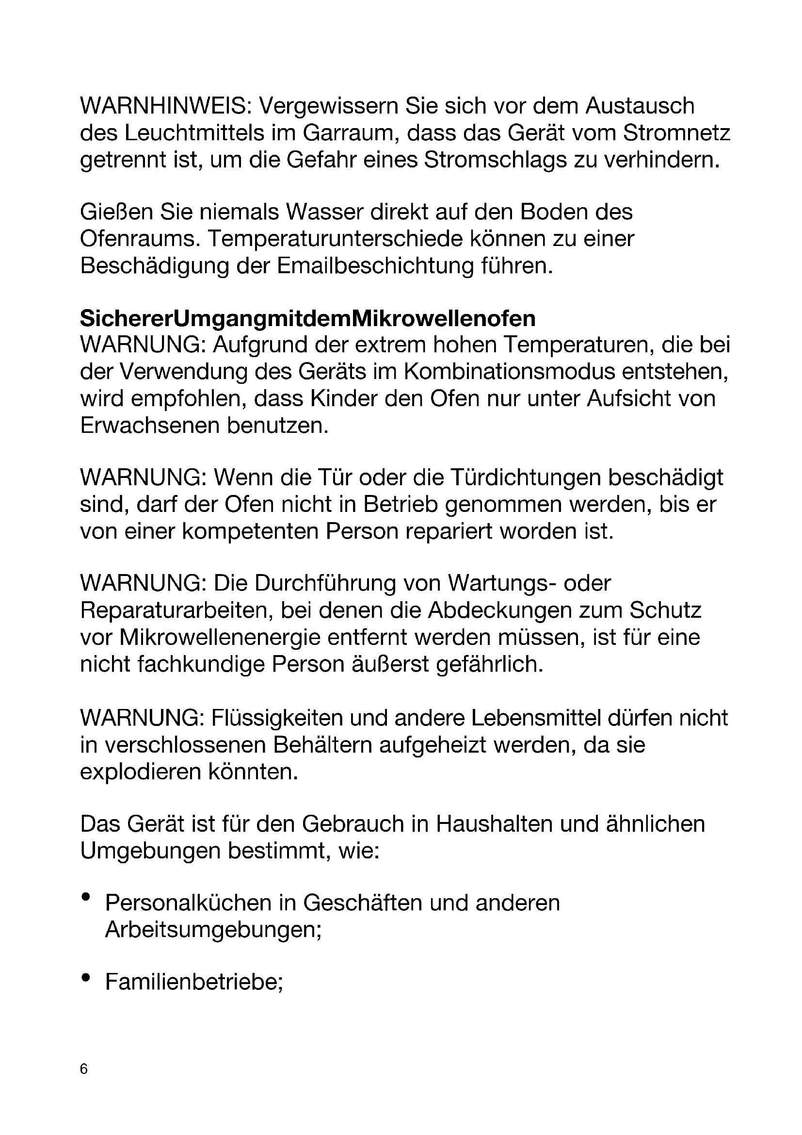 ANLEITUNG SORGFÄLTIG DURCH UND BEWAHREN SIE SIE ZUM SPÄTEREN NACHSCHLAGEN AUF. Das Gerät darf nur von einem Kundendienst oder einem autorisierten Elektrofachmann angeschlossen werden. Im Fall von unfachmännischen Eingriffen oder Reparaturen des Gerätes, besteht die Gefahr schwerer Körperverletzungen und Beschädigungen des Gerätes. Die Trennvorrichtungen müssen gemäß den Verkabelungsregeln in die feste Verkabelung eingebaut werden. Auf das Gerät darf keine Dekorationsblende montiert werden, da es zur Überhitzung kommen kann. Bei Beschädigung des Anschlusskabels, darf dieses nur vom Hersteller, seinem autorisierten Kundendienst oder einer entsprechend qualifizierten Person ausgetauscht werden, um einen Stromschlag zu vermeiden (nur für Geräte, die mit einem Verbindungskabel ausgeliefert werden). Während des Gebrauchs wird das Gerät heiß. Achten Sie darauf, die Heizelemente im Inneren des Backofens nicht zu berühren. 4loading-circle-1WARNHINWEIS: Vergewissern Sie sich vor dem Austausch des Leuchtmittels im Garraum, dass das Gerät vom Stromnetz getrennt ist, um die Gefahr eines Stromschlags zu verhindern. Gießen Sie niemals Wasser direkt auf den Boden des Ofenraums. Temperaturunterschiede können zu einer Beschädigung der Emailbeschichtung führen. Sicherer Umgang mit dem Mikrowellenofen WARNUNG: Aufgrund der extrem hohen Temperaturen, die bei der Verwendung des Geräts im Kombinationsmodus entstehen, wird empfohlen, dass Kinder den Ofen nur unter Aufsicht von Erwachsenen benutzen. WARNUNG: Wenn die Tür oder die Türdichtungen beschädigt sind, darf der Ofen nicht in Betrieb genommen werden, bis er von einer kompetenten Person repariert worden ist. WARNUNG: Die Durchführung von Wartungs- oder Reparaturarbeiten, bei denen die Abdeckungen zum Schutz vor Mikrowellenenergie entfernt werden müssen, ist für eine nicht fachkundige Person äußerst gefährlich. WARNUNG: Flüssigkeiten und andere Lebensmittel dürfen nicht in verschlossenen Behältern aufgeheizt werden, da sie explodieren könnten. Das Gerät ist für den Gebrauch in Haushalten und ähnlichen Umgebungen bestimmt, wie: