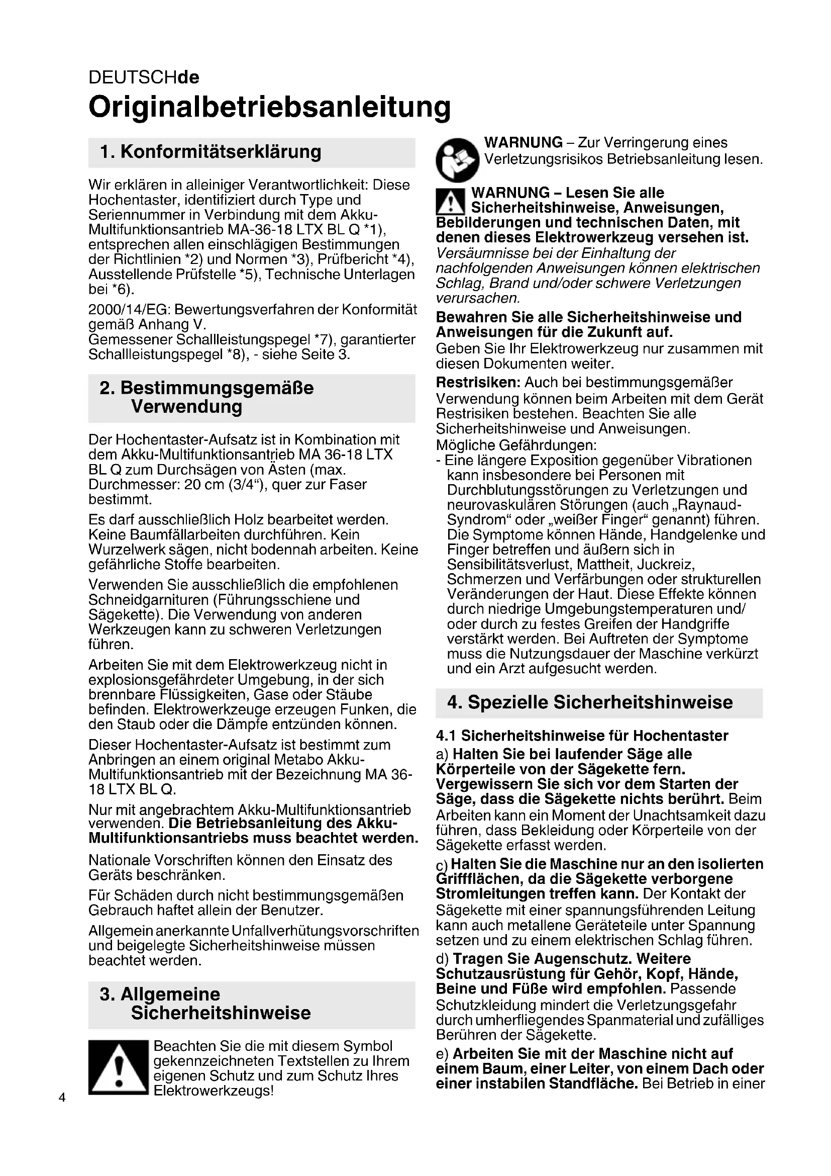 Originalbetriebsanleitung Wir erklären in alleiniger Verantwortlichkeit: Diese Hochentaster, identifiziert durch Type und Seriennummer in Verbindung mit dem Akku- Multifunktionsantrieb MA-36-18 LTX BL Q *1), entsprechen allen einschlägigen Bestimmungen der Richtlinien *2) und Normen *3), Prüfbericht *4), Ausstellende Prüfstelle *5), Technische Unterlagen bei *6). 2000/14/EG: Bewertungsverfahren der Konformität gemäß Anhang V. Gemessener Schallleistungspegel *7), garantierter Schallleistungspegel *8), - siehe Seite 3. Der Hochentaster-Aufsatz ist in Kombination mit dem Akku-Multifunktionsantrieb MA 36-18 LTX BL Q zum Durchsägen von Ästen (max. Durchmesser: 20 cm (3/4“), quer zur Faser bestimmt. Es darf ausschließlich Holz bearbeitet werden. Keine Baumfällarbeiten durchführen. Kein Wurzelwerk sägen, nicht bodennah arbeiten. Keine gefährliche Stoffe bearbeiten. Verwenden Sie ausschließlich die empfohlenen Schneidgarnituren (Führungsschiene und Sägekette). Die Verwendung von anderen Werkzeugen kann zu schweren Verletzungen führen. Arbeiten Sie mit dem Elektrowerkzeug nicht in explosionsgefährdeter Umgebung, in der sich brennbare Flüssigkeiten, Gase oder Stäube befinden. Elektrowerkzeuge erzeugen Funken, die den Staub oder die Dämpfe entzünden können. Dieser Hochentaster-Aufsatz ist bestimmt zum Anbringen an einem original Metabo Akku- Multifunktionsantrieb mit der Bezeichnung MA 36- 18 LTX BL Q. Nur mit angebrachtem Akku-Multifunktionsantrieb verwenden. Die Betriebsanleitung des Akku- Multifunktionsantriebs muss beachtet werden. Nationale Vorschriften können den Einsatz des Geräts beschränken. Für Schäden durch nicht bestimmungsgemäßen Gebrauch haftet allein der Benutzer. Allgemein anerkannte Unfallverhütungsvorschriften und beigelegte Sicherheitshinweise müssen beachtet werden. Beachten Sie die mit diesem Symbol gekennzeichneten Textstellen zu Ihrem eigenen Schutz und zum Schutz Ihres Elektrowerkzeugs! WARNUNG – Zur Verringerung eines Verletzungsrisikos Betriebsanleitung lesen. WARNUNG – Lesen Sie alle Sicherheitshinweise, Anweisungen, Bebilderungen und technischen Daten, mit denen dieses Elektrowerkzeug versehen ist. Versäumnisse bei der Einhaltung der nachfolgenden Anweisungen können elektrischen Schlag, Brand und/oder schwere Verletzungen verursachen. Bewahren Sie alle Sicherheitshinweise und Anweisungen für die Zukunft auf. Geben Sie Ihr Elektrowerkzeug nur zusammen mit diesen Dokumenten weiter. Restrisiken: Auch bei bestimmungsgemäßer Verwendung können beim Arbeiten mit dem Gerät Restrisiken bestehen. Beachten Sie alle Sicherheitshinweise und Anweisungen. Mögliche Gefährdungen: - Eine längere Exposition gegenüber Vibrationen kann insbesondere bei Personen mit Durchblutungsstörungen zu Verletzungen und neurovaskulären Störungen (auch „Raynaud- Syndrom“ oder „weißer Finger“ genannt) führen. Die Symptome können Hände, Handgelenke und Finger betreffen und äußern sich in Sensibilitätsverlust, Mattheit, Juckreiz, Schmerzen und Verfärbungen oder strukturellen Veränderungen der Haut. Diese Effekte können durch niedrige Umgebungstemperaturen und/ oder durch zu festes Greifen der Handgriffe verstärkt werden. Bei Auftreten der Symptome muss die Nutzungsdauer der Maschine verkürzt und ein Arzt aufgesucht werden.