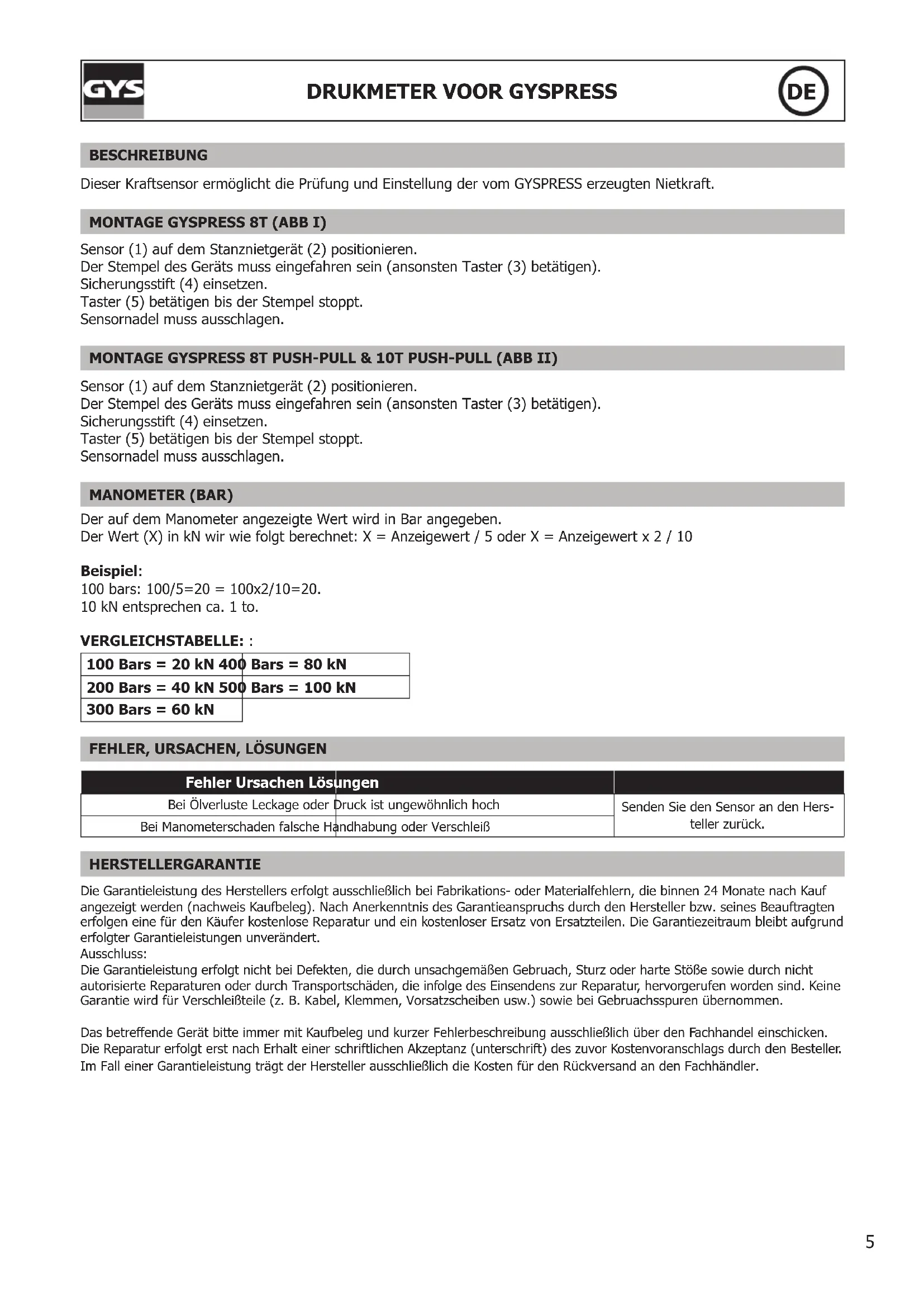 BESCHREIBUNG Dieser Kraftsensor ermöglicht die Prüfung und Einstellung der vom GYSPRESS erzeugten Nietkraft. MONTAGE GYSPRESS 8T (ABB I) Sensor (1) auf dem Stanznietgerät (2) positionieren. Der Stempel des Geräts muss eingefahren sein (ansonsten Taster (3) betätigen). Sicherungsstift (4) einsetzen. Taster (5) betätigen bis der Stempel stoppt. Sensornadel muss ausschlagen. MONTAGE GYSPRESS 8T PUSH-PULL & 10T PUSH-PULL (ABB II) Sensor (1) auf dem Stanznietgerät (2) positionieren. Der Stempel des Geräts muss eingefahren sein (ansonsten Taster (3) betätigen). Sicherungsstift (4) einsetzen. Taster (5) betätigen bis der Stempel stoppt. Sensornadel muss ausschlagen. MANOMETER (BAR) Der auf dem Manometer angezeigte Wert wird in Bar angegeben. Der Wert (X) in kN wir wie folgt berechnet: X = Anzeigewert / 5 oder X = Anzeigewert x 2 / 10 Beispiel: 100 bars: 100/5=20 = 100x2/10=20. 10 kN entsprechen ca. 1 to. VERGLEICHSTABELLE: : 100 Bars = 20 kN 400 Bars = 80 kN 200 Bars = 40 kN 500 Bars = 100 kN 300 Bars = 60 kN
