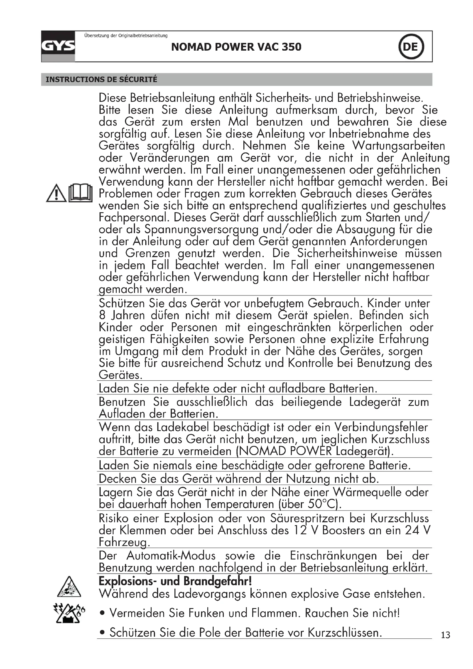Translation of the original instructionsINSTRUCTIONS DE SÉCURITÉ Diese Betriebsanleitung enthält Sicherheits- und Betriebshinweise. Bitte lesen Sie diese Anleitung aufmerksam durch, bevor Sie das Gerät zum ersten Mal benutzen und bewahren Sie diese sorgfältig auf. Lesen Sie diese Anleitung vor Inbetriebnahme des Gerätes sorgfältig durch. Nehmen Sie keine Wartungsarbeiten oder Veränderungen am Gerät vor, die nicht in der Anleitung erwähnt werden. Im Fall einer unangemessenen oder gefährlichen Verwendung kann der Hersteller nicht haftbar gemacht werden. Bei Problemen oder Fragen zum korrekten Gebrauch dieses Gerätes wenden Sie sich bitte an entsprechend qualiziertes und geschultes Fachpersonal. Dieses Gerät darf ausschließlich zum Starten und/ oder als Spannungsversorgung und/oder die Absaugung für die in der Anleitung oder auf dem Gerät genannten Anforderungen und Grenzen genutzt werden. Die Sicherheitshinweise müssen in jedem Fall beachtet werden. Im Fall einer unangemessenen oder gefährlichen Verwendung kann der Hersteller nicht haftbar gemacht werden. Schützen Sie das Gerät vor unbefugtem Gebrauch. Kinder unter 8 Jahren düfen nicht mit diesem Gerät spielen. Benden sich Kinder oder Personen mit eingeschränkten körperlichen oder geistigen Fähigkeiten sowie Personen ohne explizite Erfahrung im Umgang mit dem Produkt in der Nähe des Gerätes, sorgen Sie bitte für ausreichend Schutz und Kontrolle bei Benutzung des Gerätes. Laden Sie nie defekte oder nicht auadbare Batterien. Benutzen Sie ausschließlich das beiliegende Ladegerät zum Auaden der Batterien. Wenn das Ladekabel beschädigt ist oder ein Verbindungsfehler auftritt, bitte das Gerät nicht benutzen, um jeglichen Kurzschluss der Batterie zu vermeiden (NOMAD POWER Ladegerät). Laden Sie niemals eine beschädigte oder gefrorene Batterie. Decken Sie das Gerät während der Nutzung nicht ab. Lagern Sie das Gerät nicht in der Nähe einer Wärmequelle oder bei dauerhaft hohen Temperaturen (über 50°C). Risiko einer Explosion oder von Säurespritzern bei Kurzschluss der Klemmen oder bei Anschluss des 12 V Boosters an ein 24 V Fahrzeug. Der Automatik-Modus sowie die Einschränkungen bei der Benutzung werden nachfolgend in der Betriebsanleitung erklärt. Explosions- und Brandgefahr! Während des Ladevorgangs können explosive Gase entstehen.
