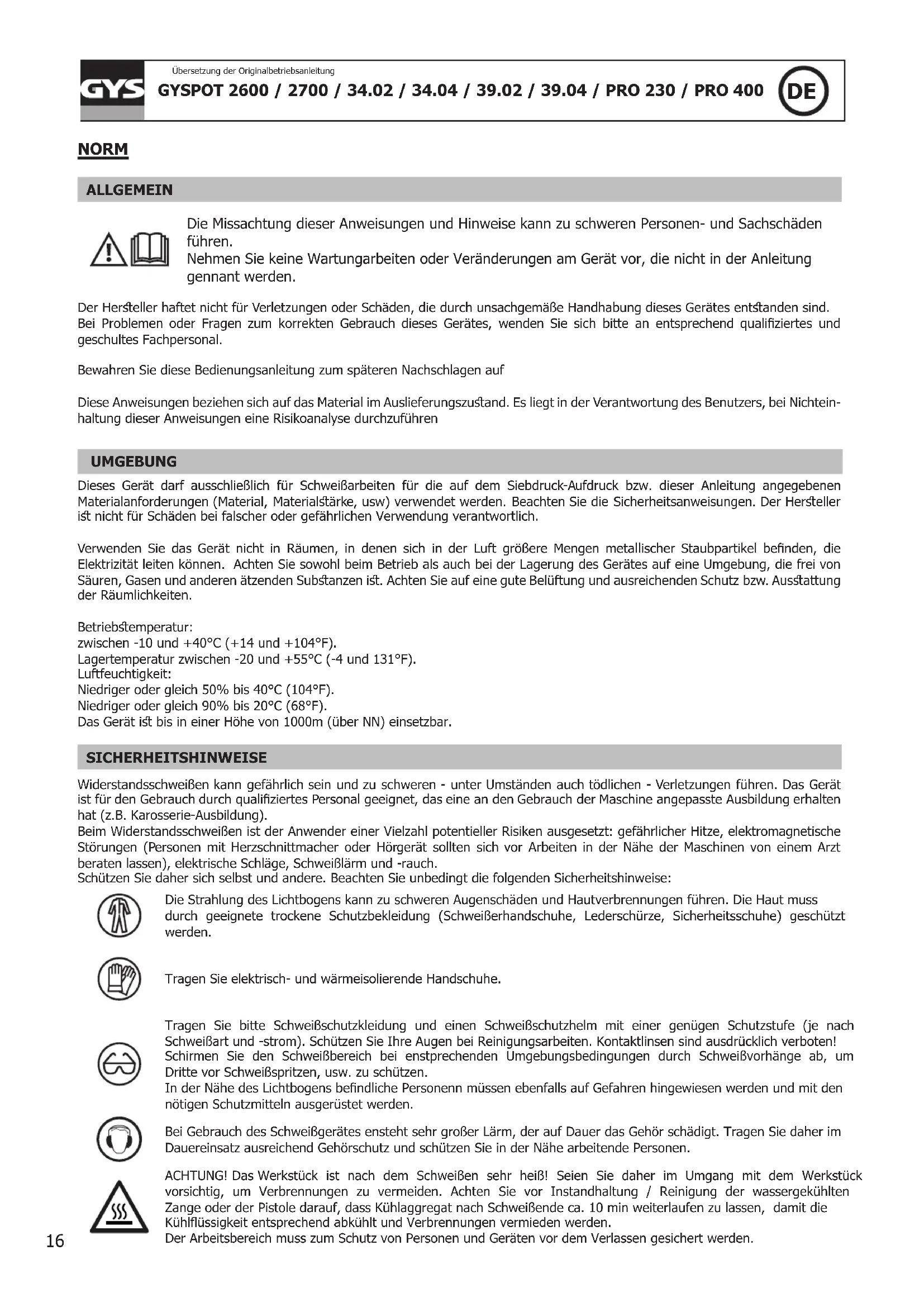 Der Norm IEC 60974-10 entsprechend, wird dieses Gerät als Klasse A Gerät eingestuft und ist somit für den industriellen und/oder professionellen Gebrauch geeignet. Es ist nicht für den Einsatz in Wohngebieten bestimmt, in denen die lokale Stromversorgung über das öentliche Niederspannungsnetz geregelt wird. In diesem Umfeld ist es auf Grund von Hochfrequenz-Störungen und Strahlungen schwierig die elektromagnetische Verträglichkeit zu gewährleisten. GYSPOT2600 / 2700 / 34.04 / 39.04 / PRO 400 Dieses Gerät ist dann mit der Norm EN 61000-3-11 konform, wenn die Netzimpedanz an der Anschlussstelle mit der Elektroinstallation niedriger als die maximale zulässige Netzimpedanz Zmax = 0.77 Ohms ist. GYSPOT34.02 / 39.02 /PRO 230 Dieses Gerät ist dann mit der Norm EN 61000-3-11 konform, wenn die Netzimpedanz an der Anschlussstelle mit der Elektroinstallation niedriger als die maximale zulässige Netzimpedanz Zmax = 0.84 Ohms ist. ACHTUNG! Dieses Gerät ist nicht mit der Norm IEC 61000-3-12 konform. Es ist dafür bestimmt, an private Niederspannungsnetze angeschloßen zu werden, die an öentliche Stromnetze mit einer mittleren und hohen Spannung verbunden sind. Es liegt in der Verantwortung des Anwenders zu überprüfen, ob die Geräte für den Stromanschluss geeignet sind, bevor Sie es an das Versorgungsnetz anschließen.