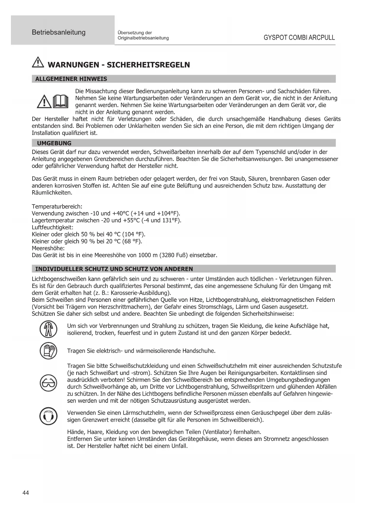 Lichtbogenschweißen kann gefährlich sein und zu schweren - unter Umständen auch tödlichen - Verletzungen führen. Es ist für den Gebrauch durch qualiziertes Personal bestimmt, das eine angemessene Schulung für den Umgang mit dem Gerät erhalten hat (z. B.: Karosserie-Ausbildung). Beim Schweißen sind Personen einer gefährlichen Quelle von Hitze, Lichtbogenstrahlung, elektromagnetischen Feldern (Vorsicht bei Trägern von Herzschrittmachern), der Gefahr eines Stromschlags, Lärm und Gasen ausgesetzt. Schützen Sie daher sich selbst und andere. Beachten Sie unbedingt die folgenden Sicherheitshinweise: Um sich vor Verbrennungen und Strahlung zu schützen, tragen Sie Kleidung, die keine Aufschläge hat, isolierend, trocken, feuerfest und in gutem Zustand ist und den ganzen Körper bedeckt. Tragen Sie elektrisch- und wärmeisolierende Handschuhe. Tragen Sie bitte Schweißschutzkleidung und einen Schweißschutzhelm mit einer ausreichenden Schutzstufe (je nach Schweißart und -strom). Schützen Sie Ihre Augen bei Reinigungsarbeiten. Kontaktlinsen sind ausdrücklich verboten! Schirmen Sie den Schweißbereich bei entsprechenden Umgebungsbedingungen durch Schweißvorhänge ab, um Dritte vor Lichtbogenstrahlung, Schweißspritzern und glühenden Abfällen zu schützen. In der Nähe des Lichtbogens bendliche Personen müssen ebenfalls auf Gefahren hingewie- sen werden und mit der nötigen Schutzausrüstung ausgerüstet werden. Verwenden Sie einen Lärmschutzhelm, wenn der Schweißprozess einen Geräuschpegel über dem zuläs- sigen Grenzwert erreicht (dasselbe gilt für alle Personen im Schweißbereich). Hände, Haare, Kleidung von den beweglichen Teilen (Ventilator) fernhalten. Entfernen Sie unter keinen Umständen das Gerätegehäuse, wenn dieses am Stromnetz angeschlossen ist. Der Hersteller haftet nicht bei einem Unfall.DE