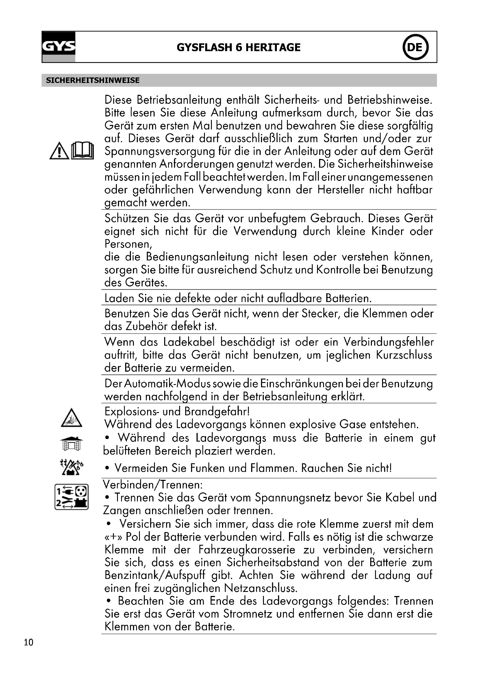 - Beachten Sie am Ende des Ladevorgangs folgendes: Trennen Sie erst das Gerät vom Stromnetz und entfernen Sie dann erst die Klemmen von der Batterie.11 GYSFLASH 6 HERITAGE