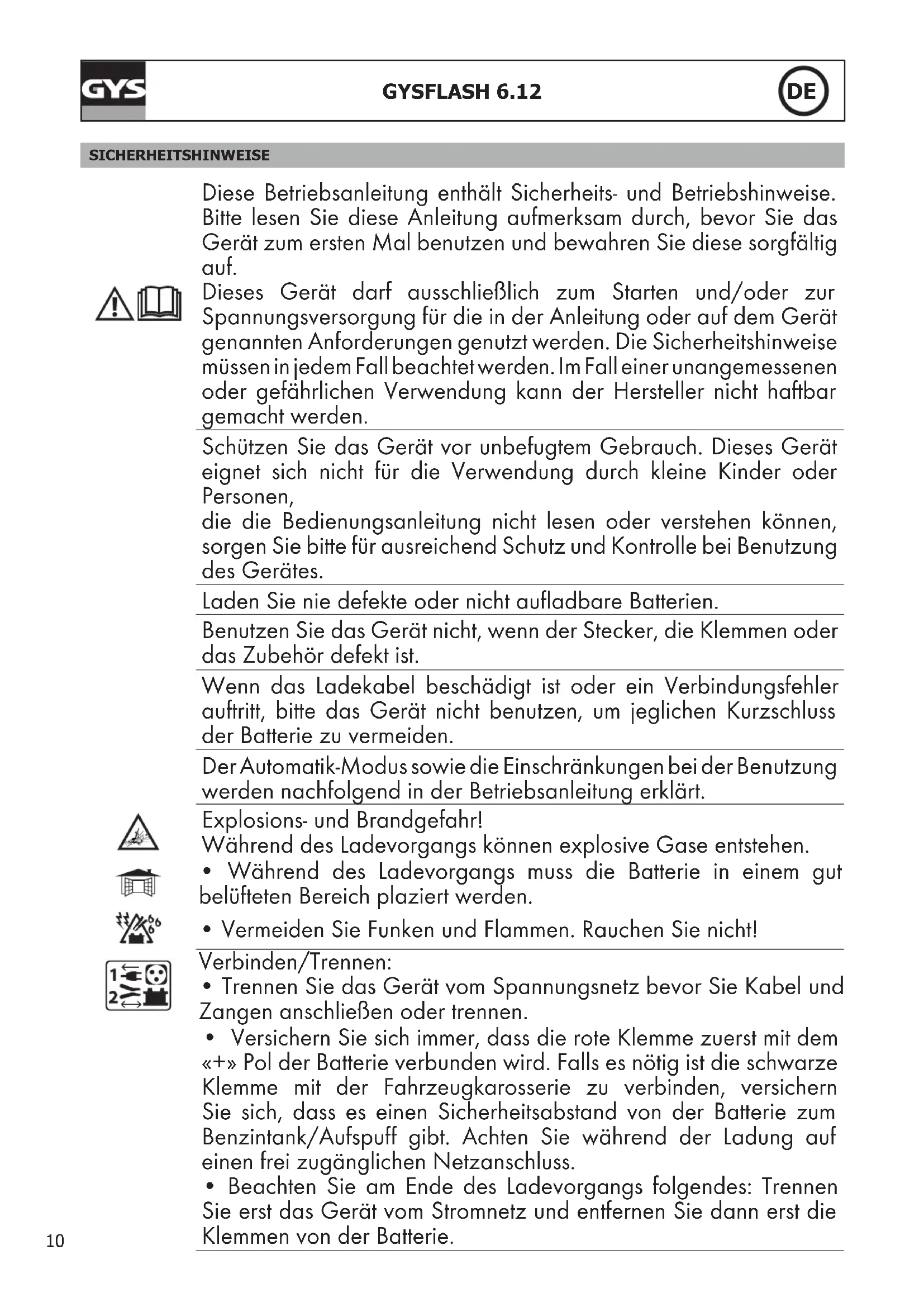 - Produkt für getrennte Entsorgung (Elektroschrott). Werfen Sie es daher nicht in die Mülltonne! PRODUKTBESCHREIBUNG Das GYSFLASH 6.12 wurde entwickelt um die meisten Fahrzeugbatterietypen zu laden. Batterie-Typen die angeschlossen werden können: Flüssig, GEL , AGM, CA (Calcium). Das GYSFLASH 6.12 kann 12V Batterien (6x2V Elemente) von 1,2Ah bis 125Ah vollladen oder zur Ladungserhaltung bei 12V Batte- rien bis 170Ah. INBETRIEBNAHME 1. Schließen das Gerät mit dem geeigneten Zubehör (Klemme, Hülse, usw.) an die Batterie an.2. Dann das Gerät an das Spannungsnetz anschließen (1-ph. 220-240Vac 50-60Hz). 3. Drücken Sie die -Taste und wählen Sie den Modus. Nach ca. 5 Sekunden startet der Ladevorgang automatisch. 4. Das Gerät zeigt den Ladefortschritt an. Sobald die Kontrollleuchte blinkt, ist die Batterie so weit aufgeladen, dass der Motor gestartet werden kann. Leuchtet die Kontrollleuchte kontinuierlich, ist die Batterie vollgeladen.5. Der Ladevorgang kann jederzeit durch Ziehen des Netzsteckers oder durch Druck auf die -Taste unterbrochen werden.6. Nach dem Ladevorgang trennen Sie erst das Ladegerät vom Spannungsnetz und dann von der Batterie. LADEMODI