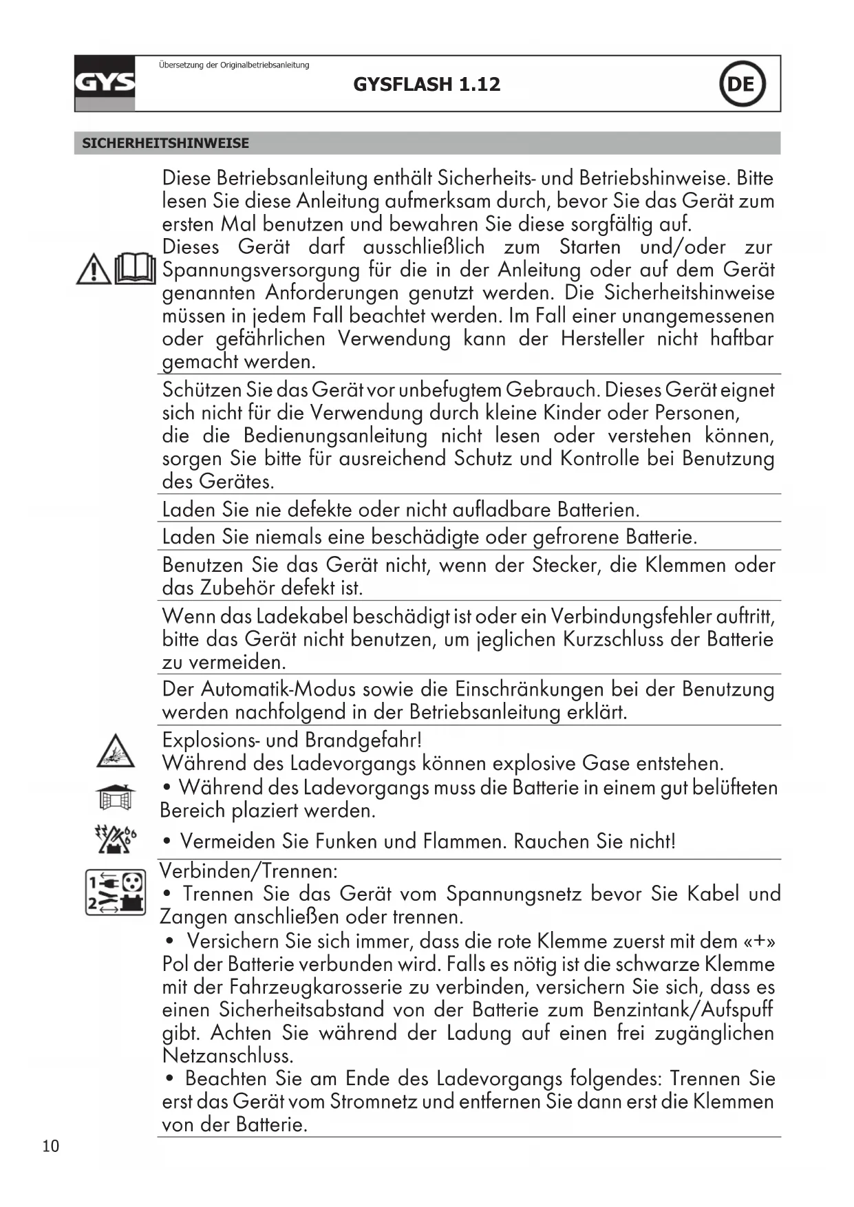 - Beachten Sie am Ende des Ladevorgangs folgendes: Trennen Sie erst das Gerät vom Stromnetz und entfernen Sie dann erst die Klemmen von der Batterie.11 GYSFLASH 1.12