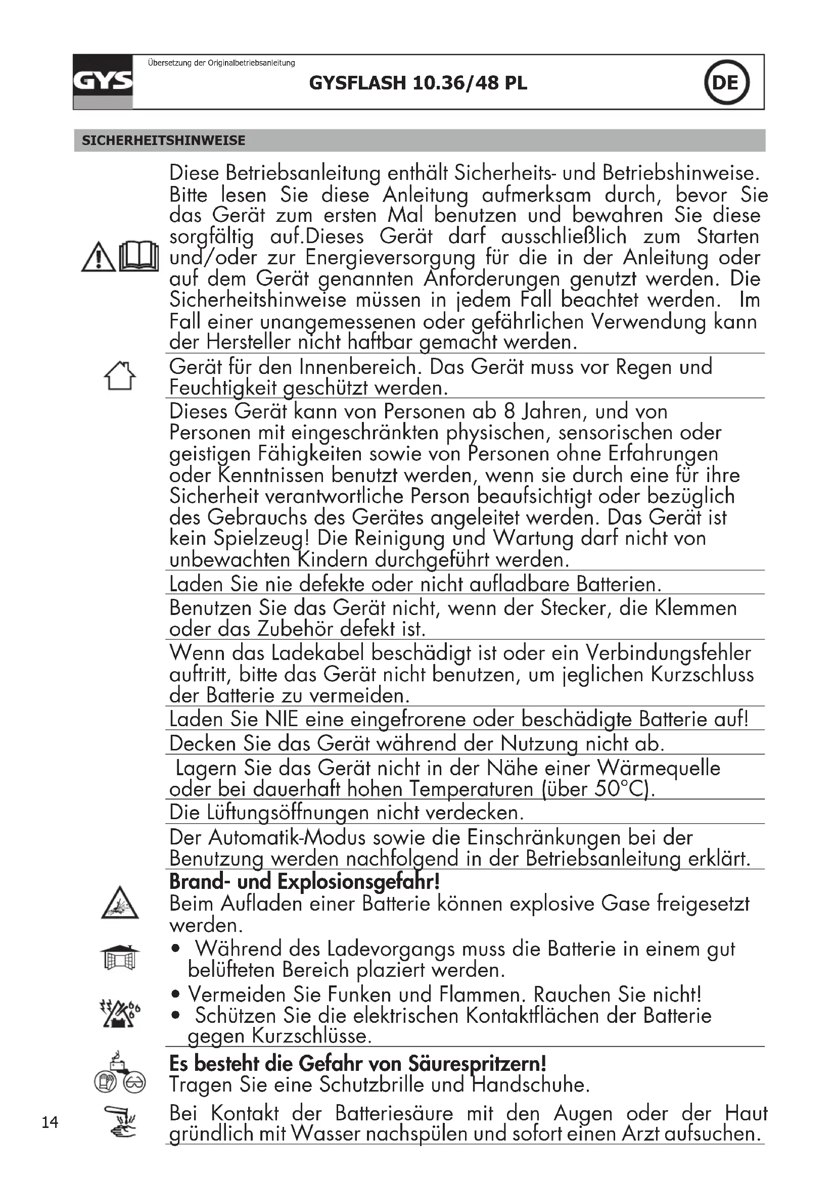- Schützen Sie die elektrischen Kontaktächen der Batterie gegen Kurzschlüsse. Es besteht die Gefahr von Säurespritzern! Tragen Sie eine Schutzbrille und Handschuhe. Bei Kontakt der Batteriesäure mit den Augen oder der Haut gründlich mit Wasser nachspülen und sofort einen Arzt aufsuchen.15 GYSFLASH 10.36/48 PL