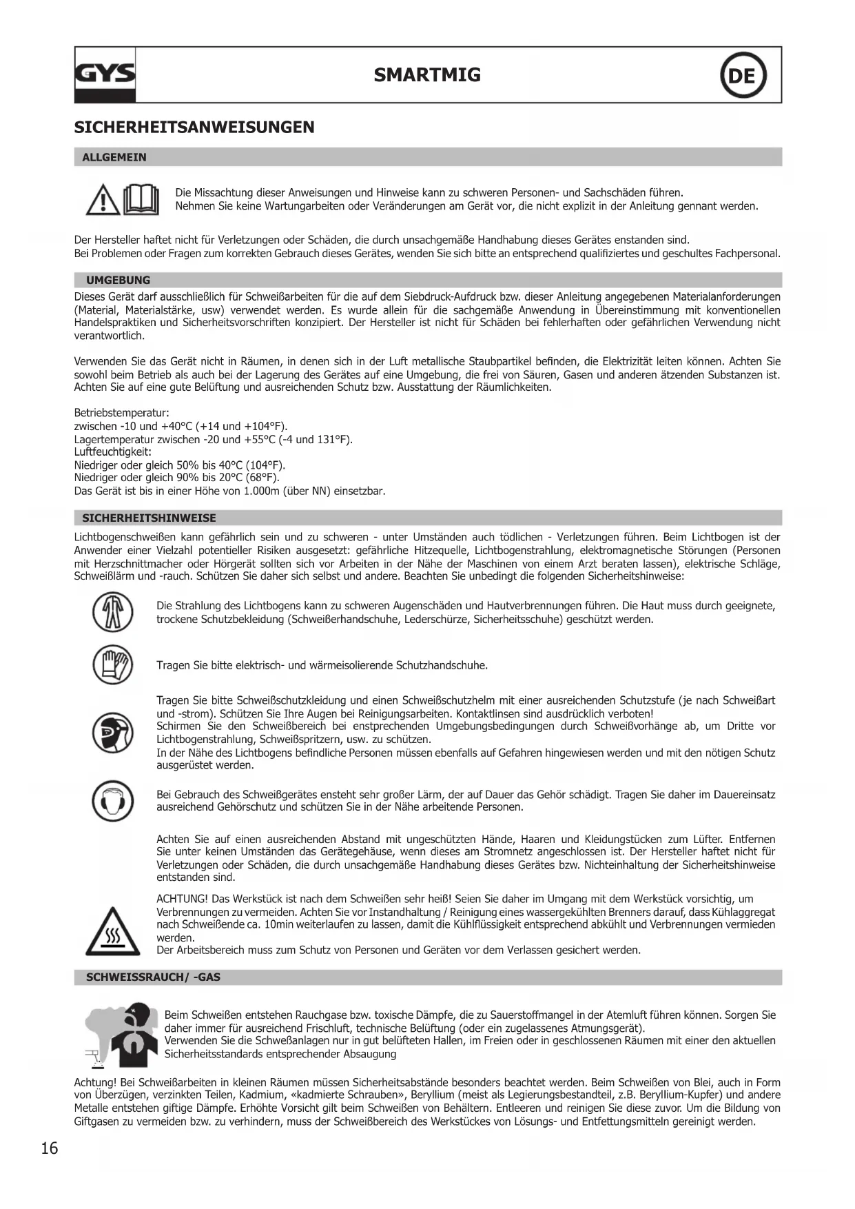 The welding bead is porous. The gas ow rate is not sucient. Adjust ow range 15 to 20 L / min. Clean the working metal. Gas bottle empty. Replace it. Gas quality unsatisfactory. Replace it. Air ow or wind inuence. Prevent drafts, protect welding area. Gas nozzle dirty. Clean or replace the gas nozzle. Poor quality wire. Use suitable WIRE for MIG-MAG welding. Surface to weld in bad condition. (rust, etc…) Clean the metal before welding. Very important ashing particules. Arc voltage too low or too high. See welding settings. Bad earth connection. Adjust the earth cable for a better connection. Insucient gas ow. Adjust the gas ow. No gas ow at the end of the torch. Bad gas connection. Check the gas connection at the welding machine. Check the owmeter and the solenoid valves.16 SMARTMIG SICHERHEITSANWEISUNGEN ALLGEMEIN Die Missachtung dieser Anweisungen und Hinweise kann zu schweren Personen- und Sachschäden führen. Nehmen Sie keine Wartungarbeiten oder Veränderungen am Gerät vor, die nicht explizit in der Anleitung gennant werden. Der Hersteller haftet nicht für Verletzungen oder Schäden, die durch unsachgemäße Handhabung dieses Gerätes enstanden sind. Bei Problemen oder Fragen zum korrekten Gebrauch dieses Gerätes, wenden Sie sich bitte an entsprechend qualiziertes und geschultes Fachpersonal. UMGEBUNG Dieses Gerät darf ausschließlich für Schweißarbeiten für die auf dem Siebdruck-Aufdruck bzw. dieser Anleitung angegebenen Materialanforderungen (Material, Materialstärke, usw) verwendet werden. Es wurde allein für die sachgemäße Anwendung in Übereinstimmung mit konventionellen Handelspraktiken und Sicherheitsvorschriften konzipiert. Der Hersteller ist nicht für Schäden bei fehlerhaften oder gefährlichen Verwendung nicht verantwortlich. Verwenden Sie das Gerät nicht in Räumen, in denen sich in der Luft metallische Staubpartikel benden, die Elektrizität leiten können. Achten Sie sowohl beim Betrieb als auch bei der Lagerung des Gerätes auf eine Umgebung, die frei von Säuren, Gasen und anderen ätzenden Substanzen ist. Achten Sie auf eine gute Belüftung und ausreichenden Schutz bzw. Ausstattung der Räumlichkeiten. Betriebstemperatur: zwischen -10 und +40°C (+14 und +104°F). Lagertemperatur zwischen -20 und +55°C (-4 und 131°F). Luftfeuchtigkeit: Niedriger oder gleich 50% bis 40°C (104°F). Niedriger oder gleich 90% bis 20°C (68°F). Das Gerät ist bis in einer Höhe von 1.000m (über NN) einsetzbar. SICHERHEITSHINWEISE Lichtbogenschweißen kann gefährlich sein und zu schweren - unter Umständen auch tödlichen - Verletzungen führen. Beim Lichtbogen ist der Anwender einer Vielzahl potentieller Risiken ausgesetzt: gefährliche Hitzequelle, Lichtbogenstrahlung, elektromagnetische Störungen (Personen mit Herzschnittmacher oder Hörgerät sollten sich vor Arbeiten in der Nähe der Maschinen von einem Arzt beraten lassen), elektrische Schläge, Schweißlärm und -rauch. Schützen Sie daher sich selbst und andere. Beachten Sie unbedingt die folgenden Sicherheitshinweise: Die Strahlung des Lichtbogens kann zu schweren Augenschäden und Hautverbrennungen führen. Die Haut muss durch geeignete, trockene Schutzbekleidung (Schweißerhandschuhe, Lederschürze, Sicherheitsschuhe) geschützt werden. Tragen Sie bitte elektrisch- und wärmeisolierende Schutzhandschuhe. Tragen Sie bitte Schweißschutzkleidung und einen Schweißschutzhelm mit einer ausreichenden Schutzstufe (je nach Schweißart und -strom). Schützen Sie Ihre Augen bei Reinigungsarbeiten. Kontaktlinsen sind ausdrücklich verboten! Schirmen Sie den Schweißbereich bei enstprechenden Umgebungsbedingungen durch Schweißvorhänge ab, um Dritte vor Lichtbogenstrahlung, Schweißspritzern, usw. zu schützen. In der Nähe des Lichtbogens bendliche Personen müssen ebenfalls auf Gefahren hingewiesen werden und mit den nötigen Schutz ausgerüstet werden. Bei Gebrauch des Schweißgerätes ensteht sehr großer Lärm, der auf Dauer das Gehör schädigt. Tragen Sie daher im Dauereinsatz ausreichend Gehörschutz und schützen Sie in der Nähe arbeitende Personen. Achten Sie auf einen ausreichenden Abstand mit ungeschützten Hände, Haaren und Kleidungstücken zum Lüfter. Entfernen Sie unter keinen Umständen das Gerätegehäuse, wenn dieses am Stromnetz angeschlossen ist. Der Hersteller haftet nicht für Verletzungen oder Schäden, die durch unsachgemäße Handhabung dieses Gerätes bzw. Nichteinhaltung der Sicherheitshinweise entstanden sind. ACHTUNG! Das Werkstück ist nach dem Schweißen sehr heiß! Seien Sie daher im Umgang mit dem Werkstück vorsichtig, um Verbrennungen zu vermeiden. Achten Sie vor Instandhaltung / Reinigung eines wassergekühlten Brenners darauf, dass Kühlaggregat nach Schweißende ca. 10min weiterlaufen zu lassen, damit die Kühlüssigkeit entsprechend abkühlt und Verbrennungen vermieden werden. Der Arbeitsbereich muss zum Schutz von Personen und Geräten vor dem Verlassen gesichert werden. SCHWEISSRAUCH/ -GAS Beim Schweißen entstehen Rauchgase bzw. toxische Dämpfe, die zu Sauerstomangel in der Atemluft führen können. Sorgen Sie daher immer für ausreichend Frischluft, technische Belüftung (oder ein zugelassenes Atmungsgerät). Verwenden Sie die Schweßanlagen nur in gut belüfteten Hallen, im Freien oder in geschlossenen Räumen mit einer den aktuellen Sicherheitsstandards entsprechender Absaugung Achtung! Bei Schweißarbeiten in kleinen Räumen müssen Sicherheitsabstände besonders beachtet werden. Beim Schweißen von Blei, auch in Form von Überzügen, verzinkten Teilen, Kadmium, «kadmierte Schrauben», Beryllium (meist als Legierungsbestandteil, z.B. Beryllium-Kupfer) und andere Metalle entstehen giftige Dämpfe. Erhöhte Vorsicht gilt beim Schweißen von Behältern. Entleeren und reinigen Sie diese zuvor. Um die Bildung von Giftgasen zu vermeiden bzw. zu verhindern, muss der Schweißbereich des Werkstückes von Lösungs- und Entfettungsmitteln gereinigt werden. DE17 SMARTMIG Die zu