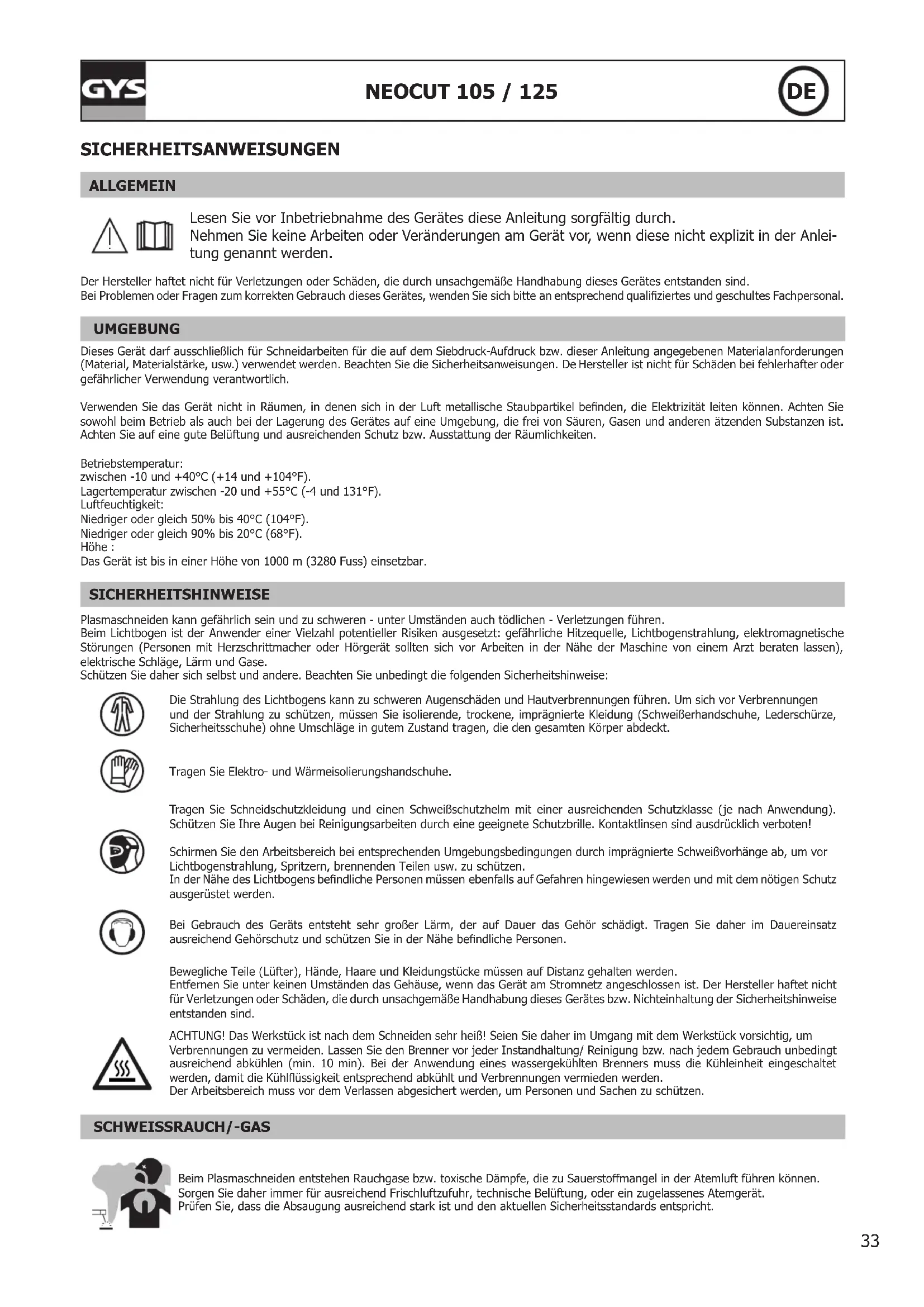 SICHERHEITSANWEISUNGEN ALLGEMEIN Lesen Sie vor Inbetriebnahme des Gerätes diese Anleitung sorgfältig durch. Nehmen Sie keine Arbeiten oder Veränderungen am Gerät vor, wenn diese nicht explizit in der Anlei- tung genannt werden. Der Hersteller haftet nicht für Verletzungen oder Schäden, die durch unsachgemäße Handhabung dieses Gerätes entstanden sind. Bei Problemen oder Fragen zum korrekten Gebrauch dieses Gerätes, wenden Sie sich bitte an entsprechend qualiziertes und geschultes Fachpersonal. UMGEBUNG Dieses Gerät darf ausschließlich für Schneidarbeiten für die auf dem Siebdruck-Aufdruck bzw. dieser Anleitung angegebenen Materialanforderungen (Material, Materialstärke, usw.) verwendet werden. Beachten Sie die Sicherheitsanweisungen. De Hersteller ist nicht für Schäden bei fehlerhafter oder gefährlicher Verwendung verantwortlich. Verwenden Sie das Gerät nicht in Räumen, in denen sich in der Luft metallische Staubpartikel benden, die Elektrizität leiten können. Achten Sie sowohl beim Betrieb als auch bei der Lagerung des Gerätes auf eine Umgebung, die frei von Säuren, Gasen und anderen ätzenden Substanzen ist. Achten Sie auf eine gute Belüftung und ausreichenden Schutz bzw. Ausstattung der Räumlichkeiten. Betriebstemperatur: zwischen -10 und +40°C (+14 und +104°F). Lagertemperatur zwischen -20 und +55°C (-4 und 131°F). Luftfeuchtigkeit: Niedriger oder gleich 50% bis 40°C (104°F). Niedriger oder gleich 90% bis 20°C (68°F). Höhe : Das Gerät ist bis in einer Höhe von 1000 m (3280 Fuss) einsetzbar. SICHERHEITSHINWEISE Plasmaschneiden kann gefährlich sein und zu schweren - unter Umständen auch tödlichen - Verletzungen führen. Beim Lichtbogen ist der Anwender einer Vielzahl potentieller Risiken ausgesetzt: gefährliche Hitzequelle, Lichtbogenstrahlung, elektromagnetische Störungen (Personen mit Herzschrittmacher oder Hörgerät sollten sich vor Arbeiten in der Nähe der Maschine von einem Arzt beraten lassen), elektrische Schläge, Lärm und Gase. Schützen Sie daher sich selbst und andere. Beachten Sie unbedingt die folgenden Sicherheitshinweise: Die Strahlung des Lichtbogens kann zu schweren Augenschäden und Hautverbrennungen führen. Um sich vor Verbrennungen und der Strahlung zu schützen, müssen Sie isolierende, trockene, imprägnierte Kleidung (Schweißerhandschuhe, Lederschürze, Sicherheitsschuhe) ohne Umschläge in gutem Zustand tragen, die den gesamten Körper abdeckt. Tragen Sie Elektro- und Wärmeisolierungshandschuhe. Tragen Sie Schneidschutzkleidung und einen Schweißschutzhelm mit einer ausreichenden Schutzklasse (je nach Anwendung). Schützen Sie Ihre Augen bei Reinigungsarbeiten durch eine geeignete Schutzbrille. Kontaktlinsen sind ausdrücklich verboten! Schirmen Sie den Arbeitsbereich bei entsprechenden Umgebungsbedingungen durch imprägnierte Schweißvorhänge ab, um vor Lichtbogenstrahlung, Spritzern, brennenden Teilen usw. zu schützen. In der Nähe des Lichtbogens bendliche Personen müssen ebenfalls auf Gefahren hingewiesen werden und mit dem nötigen Schutz ausgerüstet werden. Bei Gebrauch des Geräts entsteht sehr großer Lärm, der auf Dauer das Gehör schädigt. Tragen Sie daher im Dauereinsatz ausreichend Gehörschutz und schützen Sie in der Nähe bendliche Personen. Bewegliche Teile (Lüfter), Hände, Haare und Kleidungstücke müssen auf Distanz gehalten werden. Entfernen Sie unter keinen Umständen das Gehäuse, wenn das Gerät am Stromnetz angeschlossen ist. Der Hersteller haftet nicht für Verletzungen oder Schäden, die durch unsachgemäße Handhabung dieses Gerätes bzw. Nichteinhaltung der Sicherheitshinweise entstanden sind. ACHTUNG! Das Werkstück ist nach dem Schneiden sehr heiß! Seien Sie daher im Umgang mit dem Werkstück vorsichtig, um Verbrennungen zu vermeiden. Lassen Sie den Brenner vor jeder Instandhaltung/ Reinigung bzw. nach jedem Gebrauch unbedingt ausreichend abkühlen (min. 10 min). Bei der Anwendung eines wassergekühlten Brenners muss die Kühleinheit eingeschaltet werden, damit die Kühlüssigkeit entsprechend abkühlt und Verbrennungen vermieden werden. Der Arbeitsbereich muss vor dem Verlassen abgesichert werden, um Personen und Sachen zu schützen. SCHWEISSRAUCH/-GAS Beim Plasmaschneiden entstehen Rauchgase bzw. toxische Dämpfe, die zu Sauerstomangel in der Atemluft führen können. Sorgen Sie daher immer für ausreichend Frischluftzufuhr, technische Belüftung, oder ein zugelassenes Atemgerät. Prüfen Sie, dass die Absaugung ausreichend stark ist und den aktuellen Sicherheitsstandards entspricht.34 NEOCUT 105 / 125