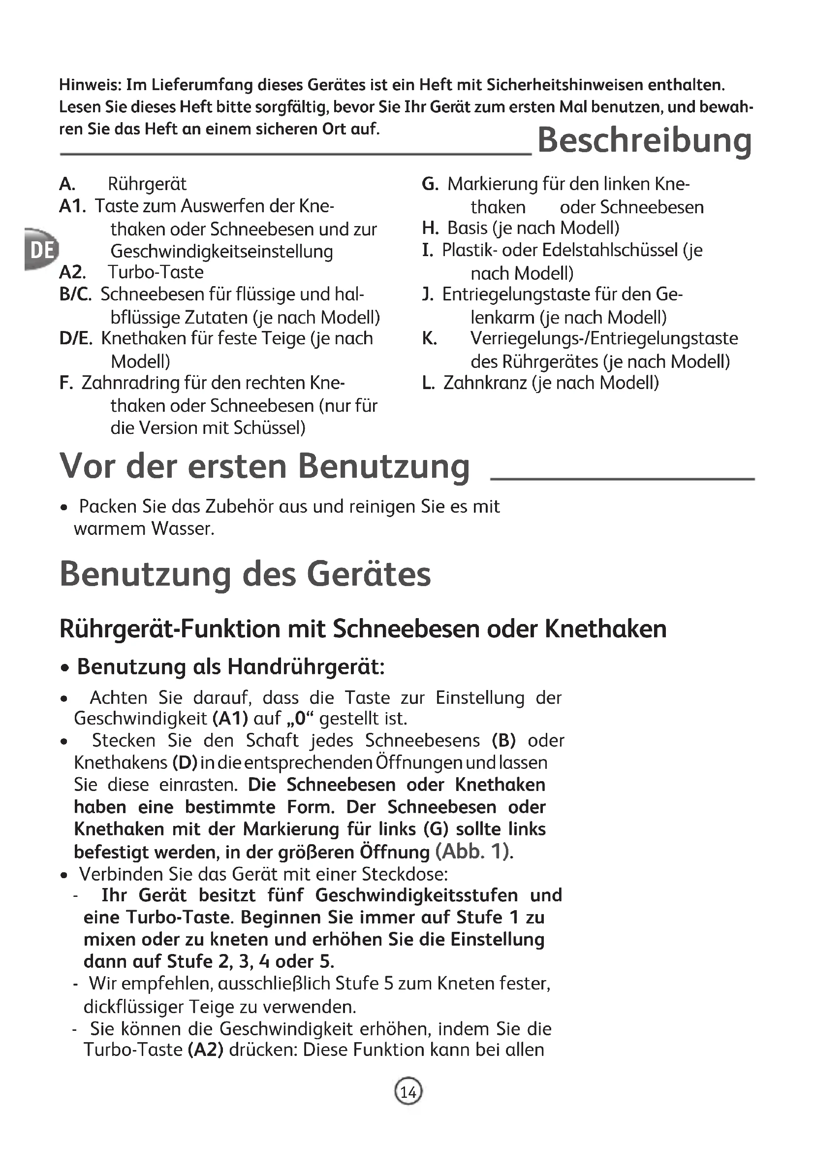 - Verbinden Sie das Gerät mit einer Steckdose: - Ihr Gerät besitzt fünf Geschwindigkeitsstufen und eine Turbo-Taste. Beginnen Sie immer auf Stufe 1 zu mixen oder zu kneten und erhöhen Sie die Einstellung dann auf Stufe 2, 3, 4 oder 5. - Wir empfehlen, ausschließlich Stufe 5 zum Kneten fester, dickflüssiger Teige zu verwenden. - Sie können die Geschwindigkeit erhöhen, indem Sie die Turbo-Taste (A2) drücken: Diese Funktion kann bei allen Hinweis: Im Lieferumfang dieses Gerätes ist ein Heft mit Sicherheitshinweisen enthalten. Lesen Sie dieses Heft bitte sorgfältig, bevor Sie Ihr Gerät zum ersten Mal benutzen, und bewah- ren Sie das Heft an einem sicheren Ort auf.A. RührgerätA1. Taste zum Auswerfen der Kne-thaken oder Schneebesen und zur GeschwindigkeitseinstellungA2. Turbo-TasteB/C. Schneebesen für flüssige und hal-bflüssige Zutaten (je nach Modell)D/E. Knethaken für feste Teige (je nach Modell)F. Zahnradring für den rechten Kne-thaken oder Schneebesen (nur für die Version mit Schüssel) G. Markierung für den linken Kne-thaken oder SchneebesenH. Basis (je nach Modell)I. Plastik- oder Edelstahlschüssel (je nach Modell)J. Entriegelungstaste für den Ge-lenkarm (je nach Modell)K. Verriegelungs-/Entriegelungstaste des Rührgerätes (je nach Modell)L. Zahnkranz (je nach Modell) DE15 Geschwindigkeitsstufen benutzt werden. Wir empfehlen, diese Funktion nur kurz zu aktivieren (höchstens 30 Sekunden für feste, dickflüssige Teige).