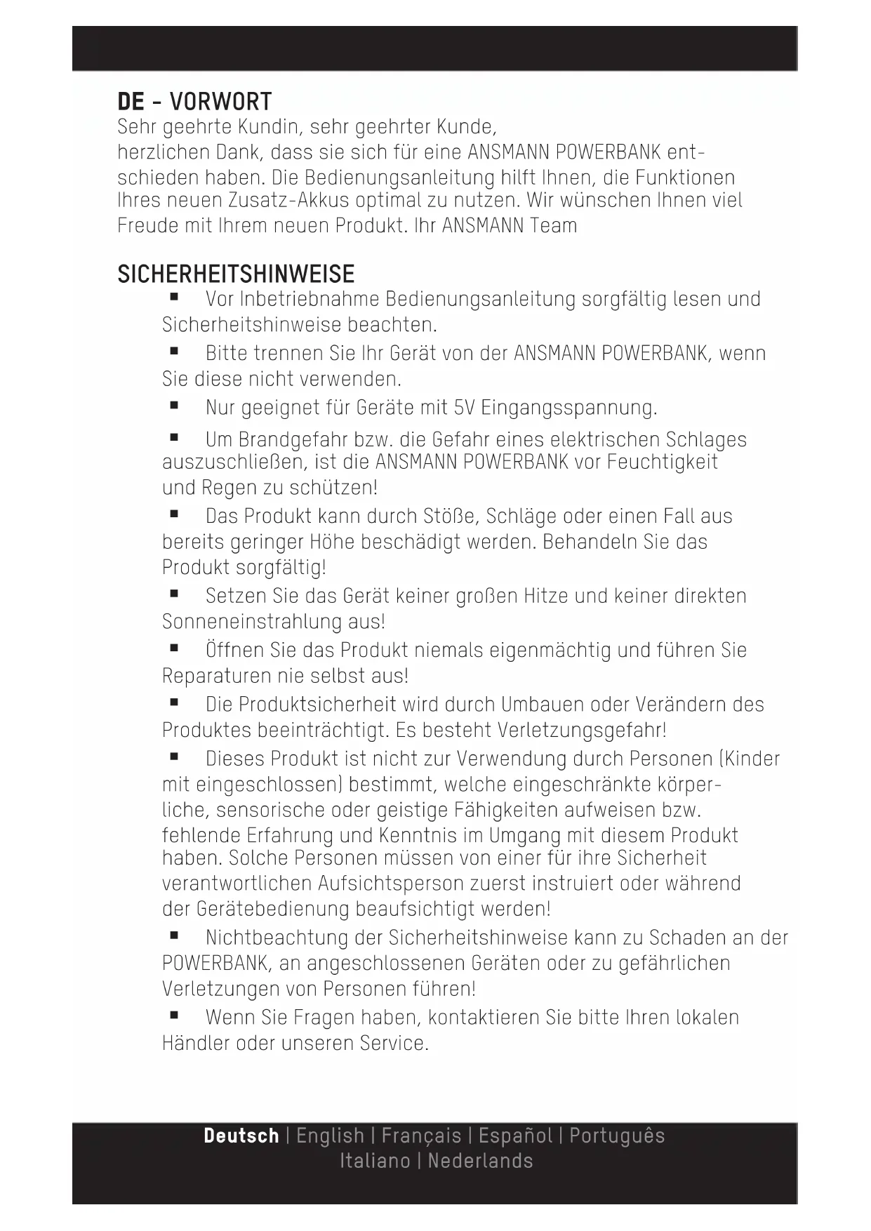 27,5mmDE - VORWORT Sehr geehrte Kundin, sehr geehrter Kunde, herzlichen Dank, dass sie sich für eine ANSMANN POWERBANK ent- schieden haben. Die Bedienungsanleitung hilft Ihnen, die Funktionen Ihres neuen Zusatz-Akkus optimal zu nutzen. Wir wünschen Ihnen viel Freude mit Ihrem neuen Produkt. Ihr ANSMANN Team SICHERHEITSHINWEISE Vor Inbetriebnahme Bedienungsanleitung sorgfältig lesen und Sicherheitshinweise beachten. Bitte trennen Sie Ihr Gerät von der ANSMANN POWERBANK, wenn Sie diese nicht verwenden. Nur geeignet für Geräte mit 5V Eingangsspannung. Um Brandgefahr bzw. die Gefahr eines elektrischen Schlages auszuschließen, ist die ANSMANN POWERBANK vor Feuchtigkeit und Regen zu schützen! Das Produkt kann durch Stöße, Schläge oder einen Fall aus bereits geringer Höhe beschädigt werden. Behandeln Sie das Produkt sorgfältig! Setzen Sie das Gerät keiner großen Hitze und keiner direkten Sonneneinstrahlung aus! Öffnen Sie das Produkt niemals eigenmächtig und führen Sie Reparaturen nie selbst aus! Die Produktsicherheit wird durch Umbauen oder Verändern des Produktes beeinträchtigt. Es besteht Verletzungsgefahr! Dieses Produkt ist nicht zur Verwendung durch Personen (Kinder mit eingeschlossen) bestimmt, welche eingeschränkte körper- liche, sensorische oder geistige Fähigkeiten aufweisen bzw. fehlende Erfahrung und Kenntnis im Umgang mit diesem Produkt haben. Solche Personen müssen von einer für ihre Sicherheit verantwortlichen Aufsichtsperson zuerst instruiert oder während der Gerätebedienung beaufsichtigt werden! Nichtbeachtung der Sicherheitshinweise kann zu Schaden an der POWERBANK, an angeschlossenen Geräten oder zu gefährlichen Verletzungen von Personen führen! Wenn Sie Fragen haben, kontaktieren Sie bitte Ihren lokalen Händler oder unseren Service. Deutsch | English | Français | Español | Português Italiano | NederlandsINBETRIEBNAHME > KAPAZITÄTSANZEIGE Drücken Sie die Power-Taste, um die verbleibende Energie zu über- prüfen. 4 LEDs leuchten: 75% - 100% 3 LEDs leuchten: 50% - 75% 2 LEDs leuchten: 25% - 50% 1 LED leuchtet: 01% - 25% Keine LED leuchtet: Die POWERBANK ist vollständig entladen. Bitte laden Sie die POWERBANK sofort auf. Falls die POWERBANK für eine längere Zeit nicht benutzt wird, ist es notwendig, diese vor der Lagerung aufzuladen, um eine Beschädigung des Akkus durch Tiefentladung zu vermeiden.