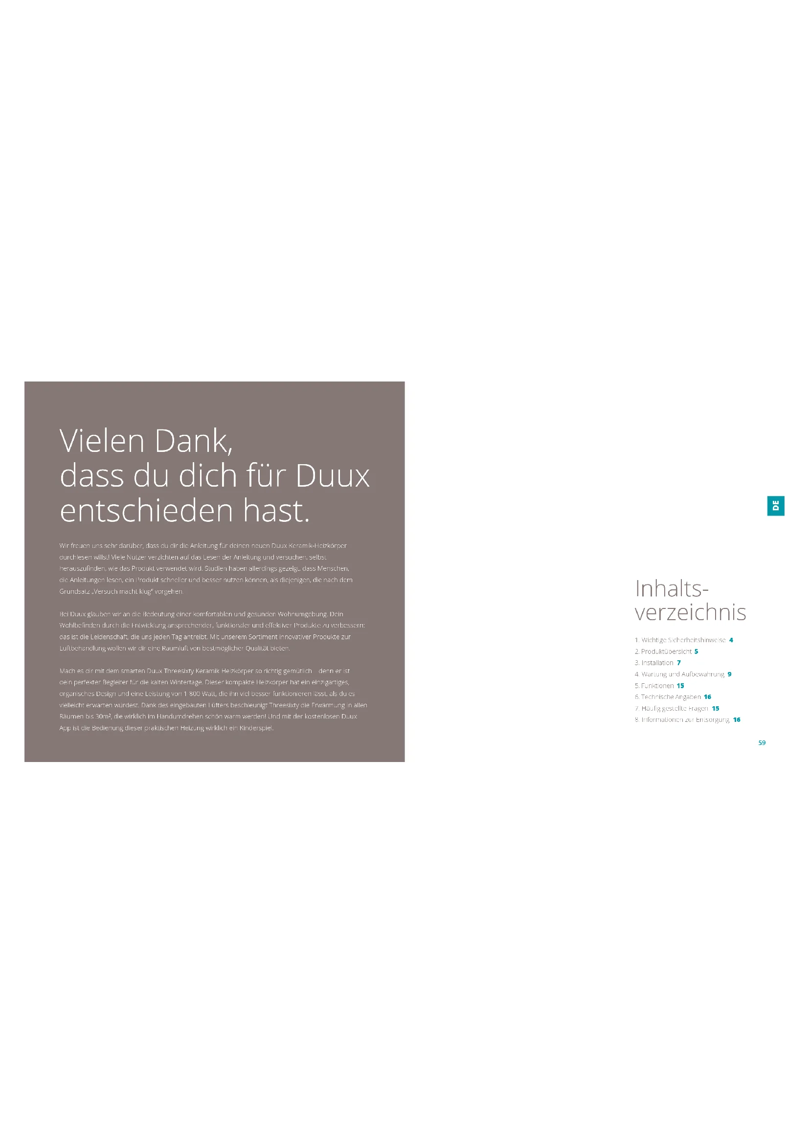 R.5958 Vielen Dank, dass du dich für Duux entschieden hast. Wir freuen uns sehr darüber, dass du dir die Anleitung für deinen neuen Duux Keramik-Heizkörper durchlesen willst! Viele Nutzer verzichten auf das Lesen der Anleitung und versuchen, selbst herauszunden, wie das Produkt verwendet wird. Studien haben allerdings gezeigt, dass Menschen, die Anleitungen lesen, ein Produkt schneller und besser nutzen können, als diejenigen, die nach dem Grundsatz „Versuch macht klug“ vorgehen. Bei Duux glauben wir an die Bedeutung einer komfortablen und gesunden Wohnumgebung. Dein Wohlbenden durch die Entwicklung ansprechender, funktionaler und eektiver Produkte zu verbessern: das ist die Leidenschaft, die uns jeden Tag antreibt. Mit unserem Sortiment innovativer Produkte zur Luftbehandlung wollen wir dir eine Raumluft von bestmöglicher Qualität bieten. Mach es dir mit dem smarten Duux Threesixty Keramik-Heizkörper so richtig gemütlich – denn er ist dein perfekter Begleiter für die kalten Wintertage. Dieser kompakte Heizkörper hat ein einzigartiges, organisches Design und eine Leistung von 1 800 Watt, die ihn viel besser funktionieren lässt, als du es vielleicht erwarten würdest. Dank des eingebauten Lüfters beschleunigt Threesixty die Erwärmung in allen Räumen bis 30m², die wirklich im Handumdrehen schön warm werden! Und mit der kostenlosen Duux- App ist die Bedienung dieser praktischen Heizung wirklich ein Kinderspiel.