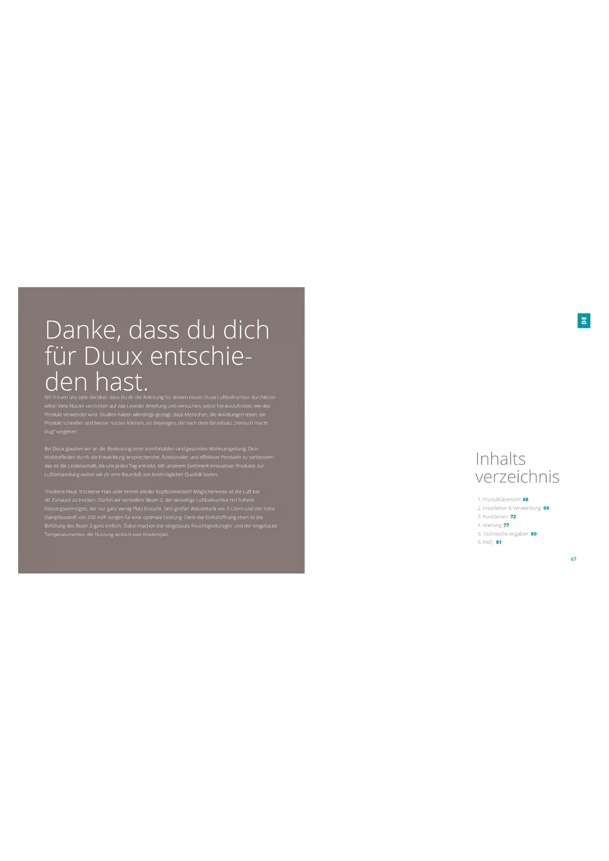 R.6766 Danke, dass du dich für Duux entschie- den hast. Wir freuen uns sehr darüber, dass du dir die Anleitung für deinen neuen Duux Luftbefeuchter durchlesen willst! Viele Nutzer verzichten auf das Leseder Anleitung und versuchen, selbst herauszunden, wie das Produkt verwendet wird. Studien haben allerdings gezeigt, dass Menschen, die Anleitungen lesen, ein Produkt schneller und besser nutzen können, als diejenigen, die nach dem Grundsatz „Versuch macht klug“ vorgehen. Bei Duux glauben wir an die Bedeutung einer komfortablen und gesunden Wohnumgebung. Dein Wohlbenden durch die Entwicklung ansprechender, funktionaler und eektiver Produkte zu verbessern: das ist die Leidenschaft, die uns jeden Tag antreibt. Mit unserem Sortiment innovativer Produkte zur Luftbehandlung wollen wir dir eine Raumluft von bestmöglicher Qualität bieten. Trockene Haut, trockener Hals oder immer wieder Kopfschmerzen? Möglicherweise ist die Luft bei dir Zuhause zu trocken. Dürfen wir vorstellen: Beam 2, der vielseitige Luftbefeuchter mit hohem Fassungsvermögen, der nur ganz wenig Platz braucht. Sein großer Wassertank von 5 Litern und der hohe Dampfausstoß von 350 ml/h sorgen für eine optimale Leistung. Dank der Einfüllönung oben ist die Befüllung des Beam 2 ganz einfach. Dabei machen der eingebaute Feuchtigkeitsregler und der eingebaute Temperatursensor die Nutzung wirklich zum Kinderspiel.