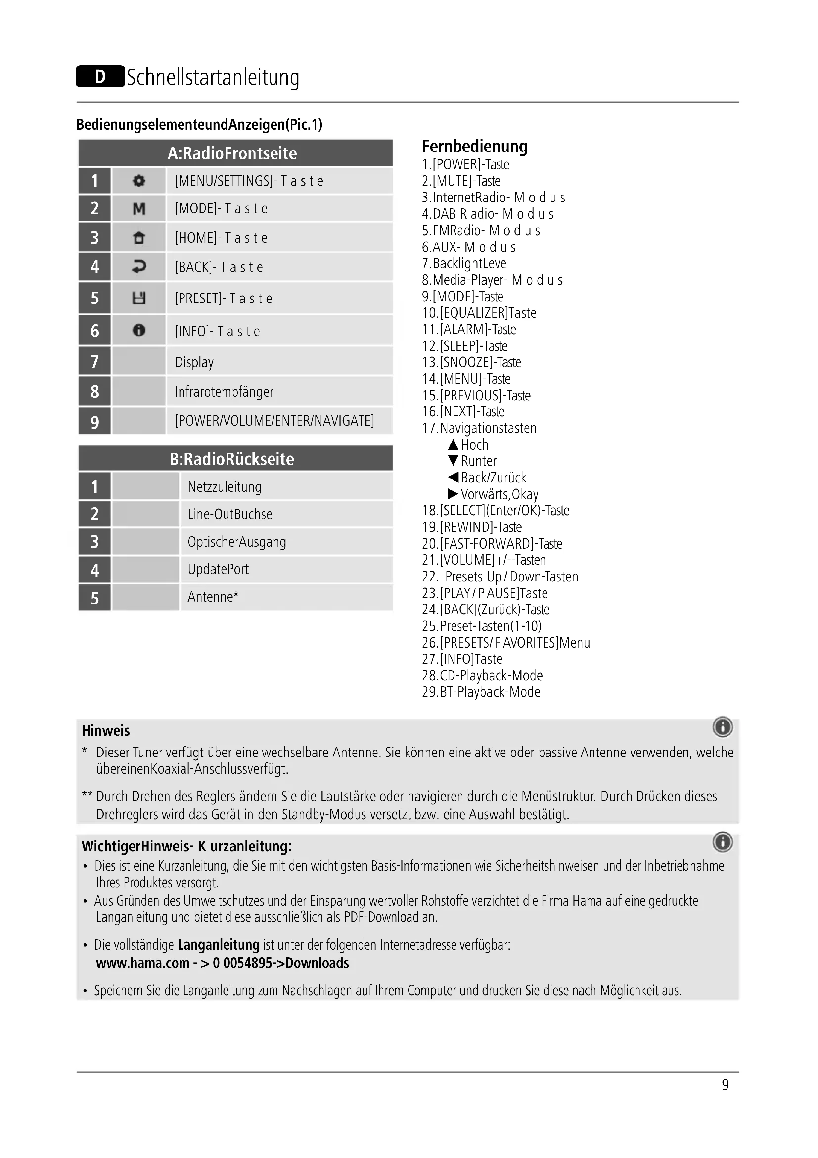 - Die vollständige Langanleitung istunterder folgenden Internetadresse verfügbar: www.hama.com->00054895 -> Downloads