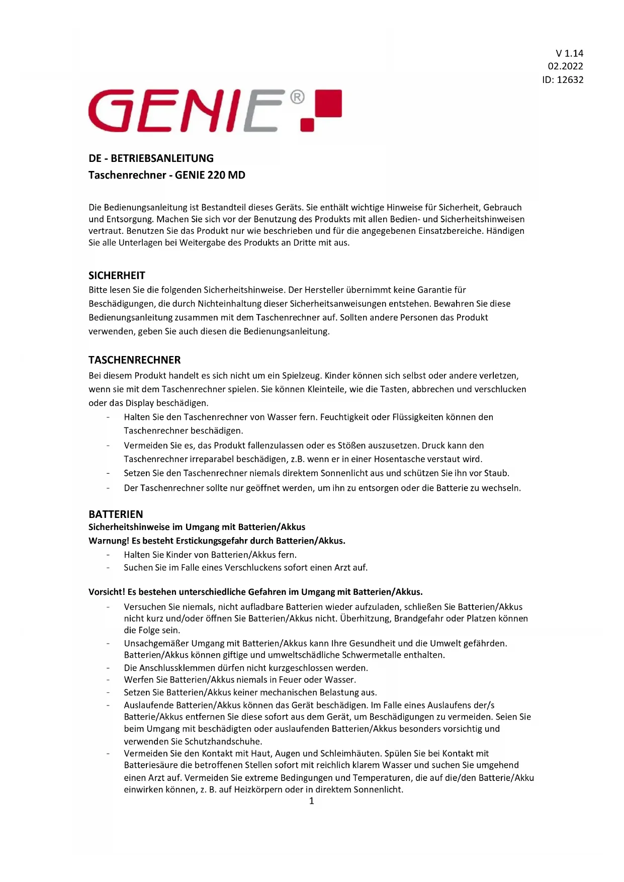 Taschenrechner - GENIE 220 MD Die Bedienungsanleitung ist Bestandteil dieses Geräts. Sie enthält wichtige Hinweise für Sicherheit, Gebrauch und Entsorgung. Machen Sie sich vor der Benutzung des Produkts mit allen Bedien- und Sicherheitshinweisen vertraut. Benutzen Sie das Produkt nur wie beschrieben und für die angegebenen Einsatzbereiche. Händigen Sie alle Unterlagen bei Weitergabe des Produkts an Dritte mit aus. SICHERHEIT Bitte lesen Sie die folgenden Sicherheitshinweise. Der Hersteller übernimmt keine Garantie für Beschädigungen, die durch Nichteinhaltung dieser Sicherheitsanweisungen entstehen. Bewahren Sie diese Bedienungsanleitung zusammen mit dem Taschenrechner auf. Sollten andere Personen das Produkt verwenden, geben Sie auch diesen die Bedienungsanleitung. TASCHENRECHNER Bei diesem Produkt handelt es sich nicht um ein Spielzeug. Kinder können sich selbst oder andere verletzen, wenn sie mit dem Taschenrechner spielen. Sie können Kleinteile, wie die Tasten, abbrechen und verschlucken oder das Display beschädigen. - Halten Sie den Taschenrechner von Wasser fern. Feuchtigkeit oder Flüssigkeiten können den Taschenrechner beschädigen. - Vermeiden Sie es, das Produkt fallenzulassen oder es Stößen auszusetzen. Druck kann den Taschenrechner irreparabel beschädigen, z.B. wenn er in einer Hosentasche verstaut wird. - Setzen Sie den Taschenrechner niemals direktem Sonnenlicht aus und schützen Sie ihn vor Staub. - Der Taschenrechner sollte nur geöffnet werden, um ihn zu entsorgen oder die Batterie zu wechseln. BATTERIEN Sicherheitshinweise im Umgang mit Batterien/Akkus Warnung! Es besteht Erstickungsgefahr durch Batterien/Akkus. - Halten Sie Kinder von Batterien/Akkus fern. - Suchen Sie im Falle eines Verschluckens sofort einen Arzt auf. Vorsicht! Es bestehen unterschiedliche Gefahren im Umgang mit Batterien/Akkus. - Versuchen Sie niemals, nicht aufladbare Batterien wieder aufzuladen, schließen Sie Batterien/Akkus nicht kurz und/oder öffnen Sie Batterien/Akkus nicht. Überhitzung, Brandgefahr oder Platzen können die Folge sein. - Unsachgemäßer Umgang mit Batterien/Akkus kann Ihre Gesundheit und die Umwelt gefährden. Batterien/Akkus können giftige und umweltschädliche Schwermetalle enthalten. - Die Anschlussklemmen dürfen nicht kurzgeschlossen werden. - Werfen Sie Batterien/Akkus niemals in Feuer oder Wasser. - Setzen Sie Batterien/Akkus keiner mechanischen Belastung aus. - Auslaufende Batterien/Akkus können das Gerät beschädigen. Im Falle eines Auslaufens der/s