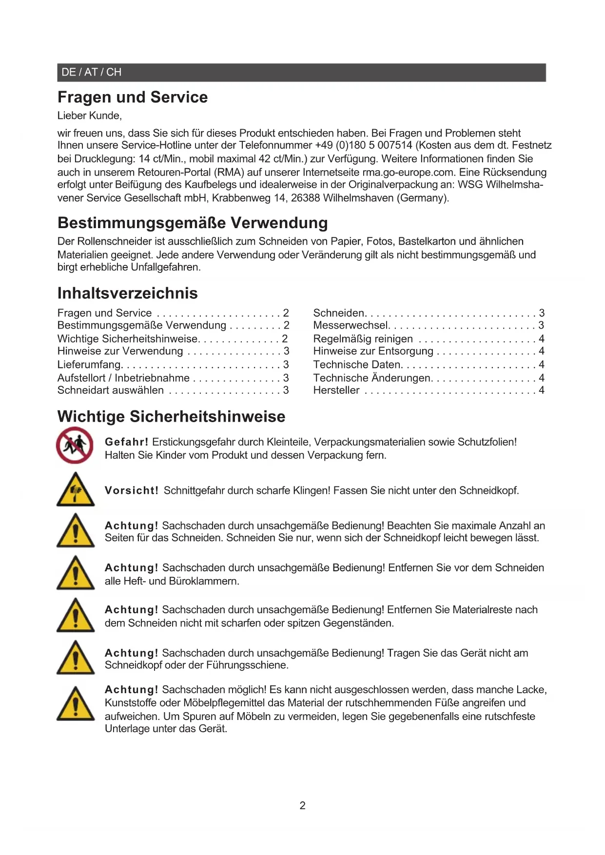 - AR RC Plus GO Europe GmbH Zum Kraftwerk 1 45527 Hattingen Germany www.go-europe.com V 2.0 03/2025 ID: 120022 DE / AT / CH Fragen und Service Lieber Kunde, wir freuen uns, dass Sie sich für dieses Produkt entschieden haben. Bei Fragen und Problemen steht Ihnen unsere Service-Hotline unter der Telefonnummer +49 (0)180 5 007514 (Kosten aus dem dt. Festnetz bei Drucklegung: 14 ct/Min., mobil maximal 42 ct/Min.) zur Verfügung. Weitere Informationen nden Sie auch in unserem Retouren-Portal (RMA) auf unserer Internetseite rma.go-europe.com. Eine Rücksendung erfolgt unter Beifügung des Kaufbelegs und idealerweise in der Originalverpackung an: WSG Wilhelmsha- vener Service Gesellschaft mbH, Krabbenweg 14, 26388 Wilhelmshaven (Germany). Bestimmungsgemäße Verwendung Der Rollenschneider ist ausschließlich zum Schneiden von Papier, Fotos, Bastelkarton und ähnlichen Materialien geeignet. Jede andere Verwendung oder Veränderung gilt als nicht bestimmungsgemäß und birgt erhebliche Unfallgefahren. Inhaltsverzeichnis Fragen und Service p. 2