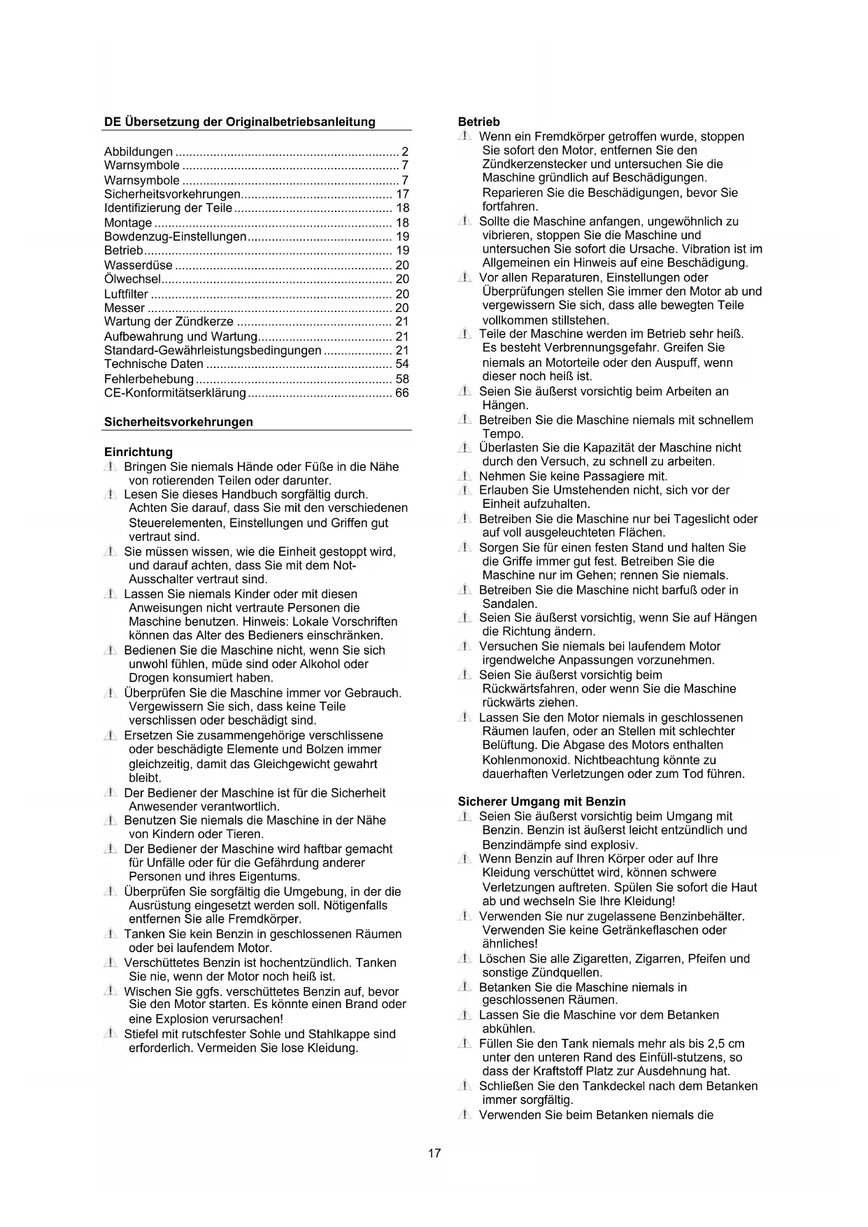 Betrieb Wenn ein Fremdkörper getroffen wurde, stoppen Sie sofort den Motor, entfernen Sie den Zündkerzenstecker und untersuchen Sie die Maschine gründlich auf Beschädigungen. Reparieren Sie die Beschädigungen, bevor Sie fortfahren. Sollte die Maschine anfangen, ungewöhnlich zu vibrieren, stoppen Sie die Maschine und untersuchen Sie sofort die Ursache. Vibration ist im Allgemeinen ein Hinweis auf eine Beschädigung. Vor allen Reparaturen, Einstellungen oder Überprüfungen stellen Sie immer den Motor ab und vergewissern Sie sich, dass alle bewegten Teile vollkommen stillstehen. Teile der Maschine werden im Betrieb sehr heiß. Es besteht Verbrennungsgefahr. Greifen Sie niemals an Motorteile oder den Auspuff, wenn dieser noch heiß ist. Seien Sie äußerst vorsichtig beim Arbeiten an Hängen. Betreiben Sie die Maschine niemals mit schnellem Tempo. Überlasten Sie die Kapazität der Maschine nicht durch den Versuch, zu schnell zu arbeiten. Nehmen Sie keine Passagiere mit. Erlauben Sie Umstehenden nicht, sich vor der Einheit aufzuhalten. Betreiben Sie die Maschine nur bei Tageslicht oder auf voll ausgeleuchteten Flächen. Sorgen Sie für einen festen Stand und halten Sie die Griffe immer gut fest. Betreiben Sie die Maschine nur im Gehen; rennen Sie niemals. Betreiben Sie die Maschine nicht barfuß oder in Sandalen. Seien Sie äußerst vorsichtig, wenn Sie auf Hängen die Richtung ändern. Versuchen Sie niemals bei laufendem Motor irgendwelche Anpassungen vorzunehmen. Seien Sie äußerst vorsichtig beim Rückwärtsfahren, oder wenn Sie die Maschine rückwärts ziehen. Lassen Sie den Motor niemals in geschlossenen Räumen laufen, oder an Stellen mit schlechter Belüftung. Die Abgase des Motors enthalten Kohlenmonoxid. Nichtbeachtung könnte zu dauerhaften Verletzungen oder zum Tod führen. Sicherer Umgang mit Benzin Seien Sie äußerst vorsichtig beim Umgang mit Benzin. Benzin ist äußerst leicht entzündlich und Benzindämpfe sind explosiv. Wenn Benzin auf Ihren Körper oder auf Ihre Kleidung verschüttet wird, können schwere Verletzungen auftreten. Spülen Sie sofort die Haut ab und wechseln Sie Ihre Kleidung! Verwenden Sie nur zugelassene Benzinbehälter. Verwenden Sie keine Getränkeflaschen oder ähnliches! Löschen Sie alle Zigaretten, Zigarren, Pfeifen und sonstige Zündquellen. Betanken Sie die Maschine niemals in geschlossenen Räumen. Lassen Sie die Maschine vor dem Betanken abkühlen. Füllen Sie den Tank niemals mehr als bis 2,5 cm unter den unteren Rand des Einfüll-stutzens, so dass der Kraftstoff Platz zur Ausdehnung hat. Schließen Sie den Tankdeckel nach dem Betanken immer sorgfältig. Verwenden Sie beim Betanken niemals die18 Feststellfunktion der Tankpistole. Rauchen Sie nicht beim Betanken. Betanken Sie niemals innerhalb von Gebäuden oder wo Benzindämpfe auf eine Zündquelle treffen können. Stellen oder Verwenden Sie niemals Benzin oder die Maschine in der Nähe von Geräten, Zündflammen, Grills, elektrischen Geräten, Elektrowerkzeugen usw. Wartung und Aufbewahrung Zur Wartung und Reinigung, zum Austausch von Werkzeugen und beim Transport ohne eigene Motorkraft muss der Motor abgestellt und der Zündkerzenstecker abgezogen werden. Warten Sie bis den Motor abgekühlt und nicht mehr heiß ist. Tragen Sie bei allen Wartungsarbeiten Schutzkleidung und Schutzbrille. Überprüfen Sie regelmäßig, dass alle Schrauben und Muttern gut angezogen sind. Ziehen Sie diese nötigenfalls nach. Vor dem Lagern in geschlossenen Räumen oder unter einer Abdeckung muss der Motor vollkommen abgekühlt sein. Wenn die Maschine einige Zeit lang nicht benutzt wird, beachten Sie bitte die Anleitungen in dieser Bedienungsanleitung. Halten Sie die Sicherheits- und Hinweisschilder intakt oder ersetzen Sie sie nötigenfalls. Verwenden Sie nur Originalersatzteile oder - zubehör. Bei Verwendung von Nicht-Originalteilen oder -zubehör erlischt die Produkthaftung. Verschiedenes Der Motor wird ohne Öl geliefert! Vor dem Start mit Öl befüllen und den Ölstand kontrollieren. Verwenden Sie Motoröl SAE-30. Werkseitig montierte Steuerelemente, wie z.B. das am Griff montierte Kupplungskabel dürfen nicht entfernt oder freigelegt werden. Entleeren Sie den Kraftstofftank nur im Freien. Benzin ist äußerst leicht entzündlich und Benzindämpfe sind explosiv. Stellen Sie sicher, dass die Maschine beim Transport auf einem Pritschenwagen o.ä. gut gesichert ist.